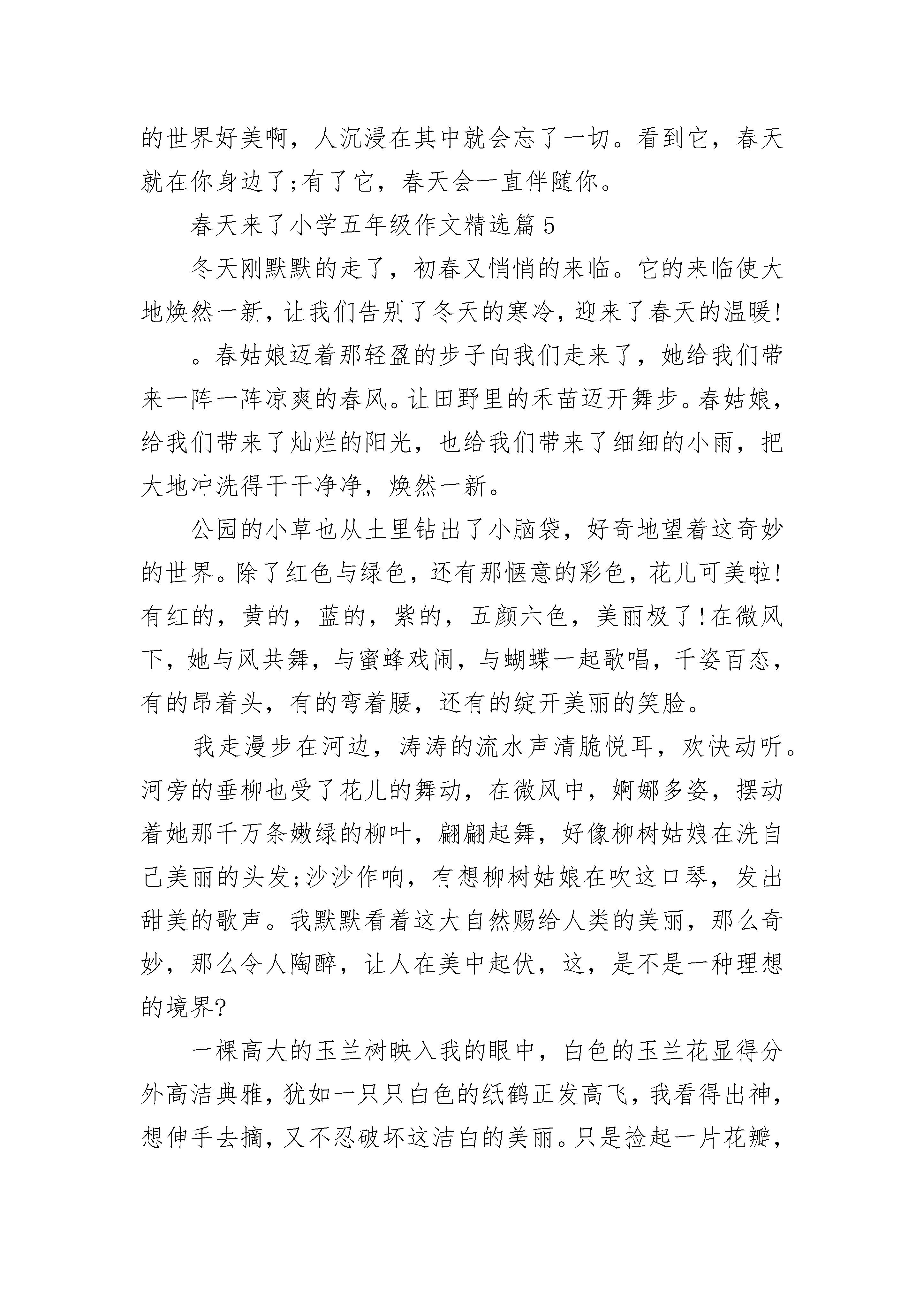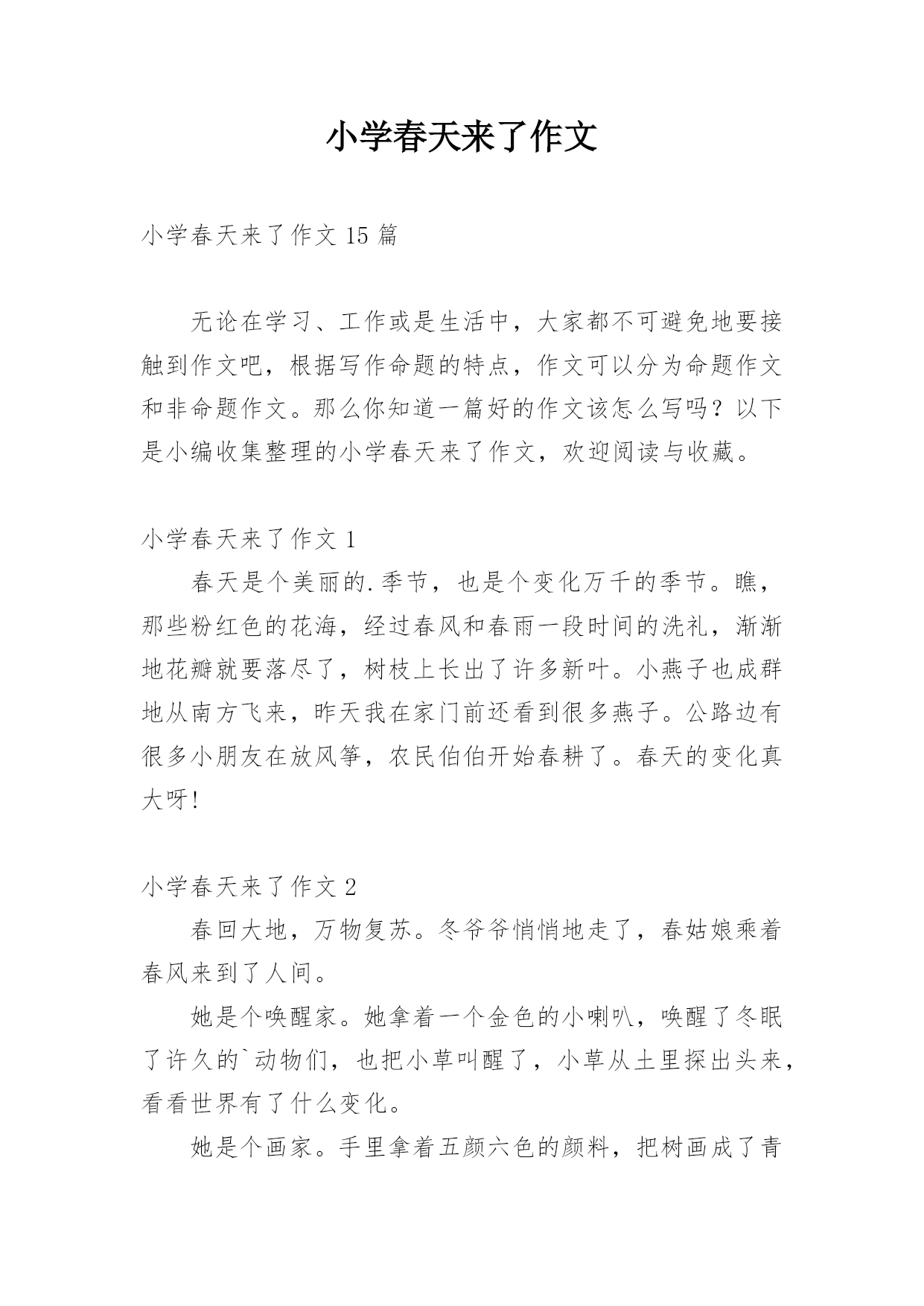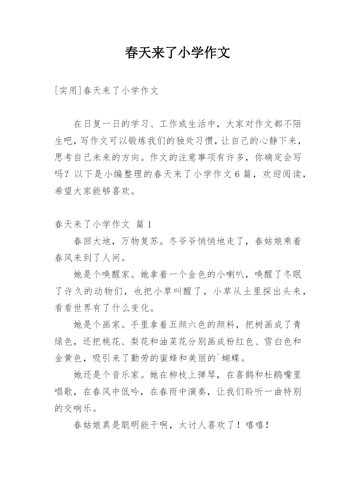 春天来了小学作文春天来了小学作文汇总10篇无论在学习、工作或是生活中,大家都跟作文打过交道吧,写作文可以锻炼我们的独处习惯,让自己的心静下来,思考自己未来的方向。写起作文来就毫无头绪?以下是小编收集整理的春天来了小学作文10篇,欢迎大家借鉴与参考,希望对大家有所帮助。春天来了小学作文篇1冬爷爷送走了大地的严寒,春姑娘踏着轻盈的脚步来到了人间。春天的景色十分美丽,就像一幅栩栩如生的画。春天的阳光格外明媚,春姑娘展开了笑脸,太阳,红红的光束射过来,那温柔地抚摸你,像年轻的母亲的手。随着春姑娘轻快的步伐,青青的
