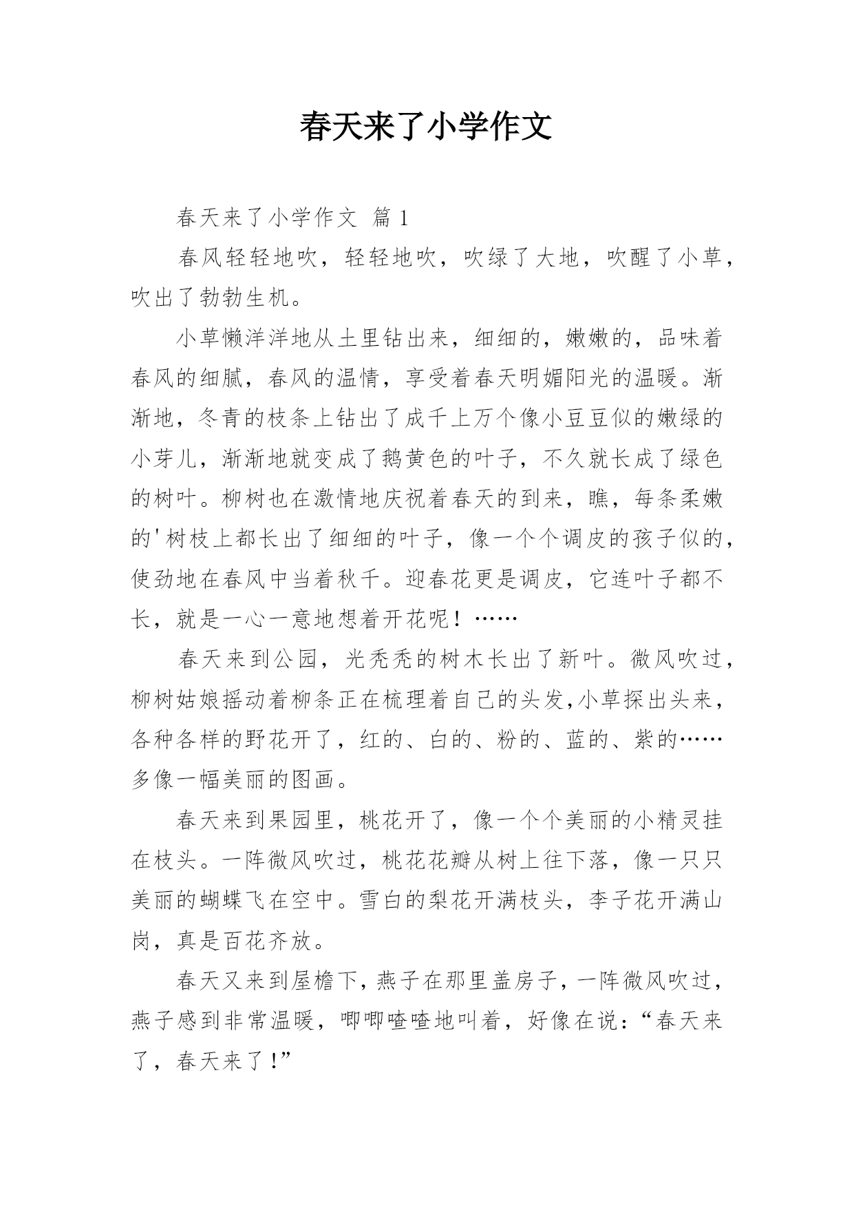 春天来了小学作文春天来了小学作文篇1春风轻轻地吹,轻轻地吹,吹绿了大地,吹醒了小草,吹出了勃勃生机。小草懒洋洋地从土里钻出来,细细的,嫩嫩的,品味着春风的细腻,春风的温情,享受着春天明媚阳光的温暖。渐渐地,冬青的枝条上钻出了成千上万个像小豆豆似的嫩绿的小芽儿,渐渐地就变成了鹅黄色的叶子,不久就长成了绿色的树叶。柳树也在激情地庆祝着春天的到来,瞧,每条柔嫩的'树枝上都长出了细细的叶子,像一个个调皮的孩子似的,使劲地在春风中当着秋千。迎春花更是调皮,它连叶子都不长,就是一心一意地想着开花呢!……春天来到公园,
