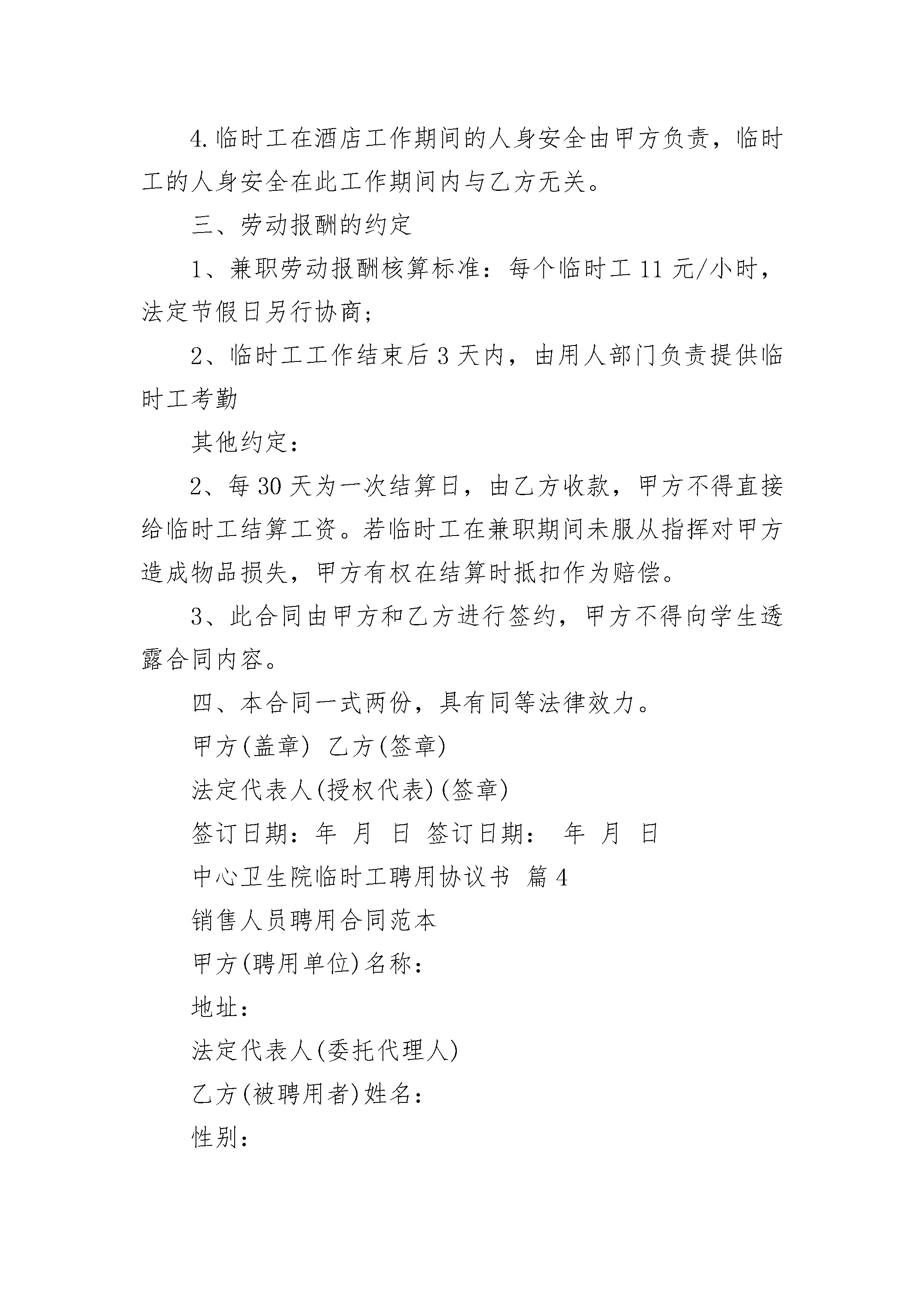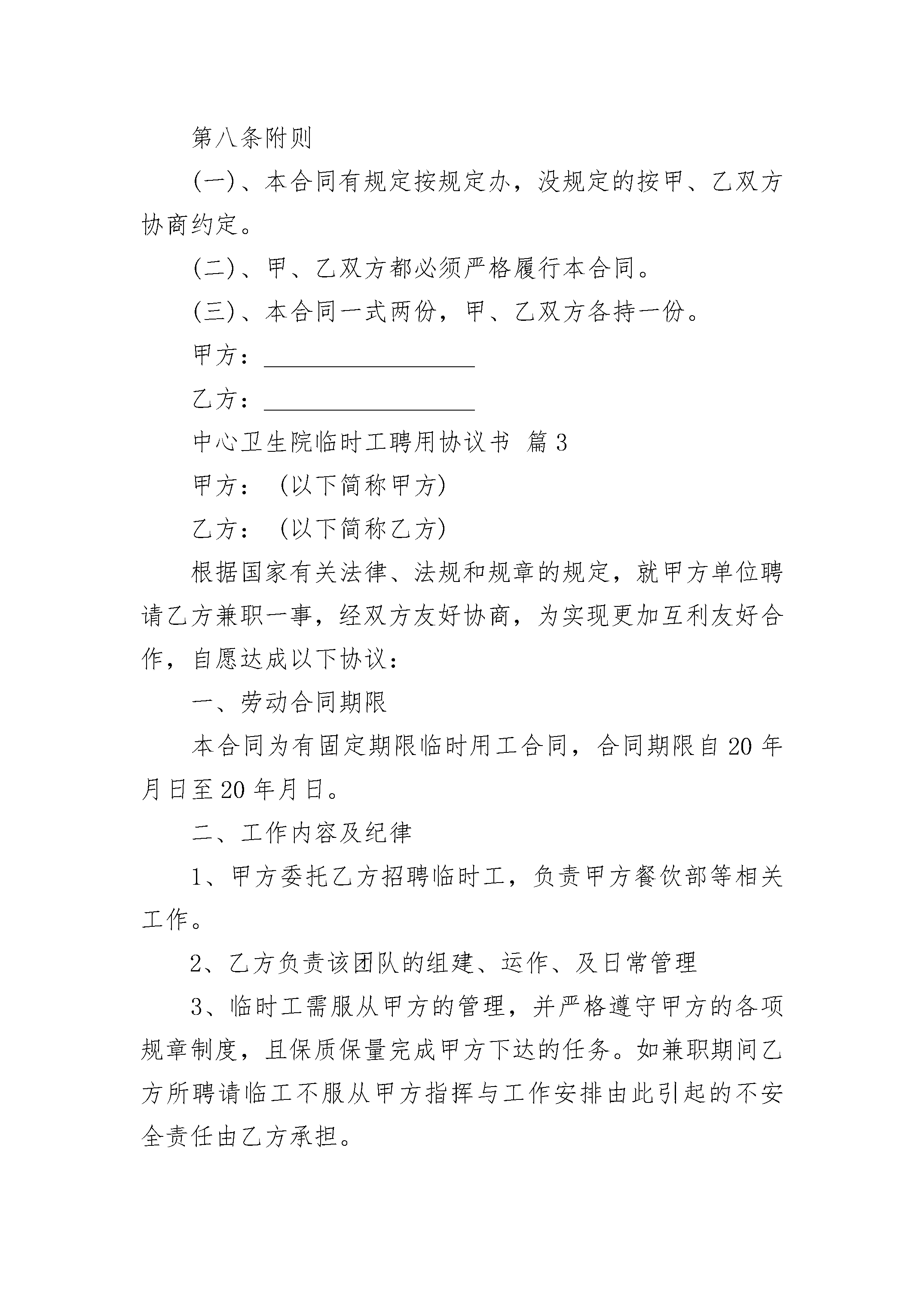 中心卫生院临时工聘用协议书中心卫生院临时工聘用协议书(精选20篇)中心卫生院临时工聘用协议书篇1甲方:___________中心卫生院乙方:___________甲方因工作需要聘用临时工作人员,乙方申请应聘并参与甲方组织的专业考试考核合格后,由甲方录用为临时工,并签订临时聘用合同,内容如下:一、聘用期限乙方被录用,在甲方试用期为________月,自________年________月________日至________年________日________日止。试用期满,不能胜任工作,予以辞聘;合格者继续