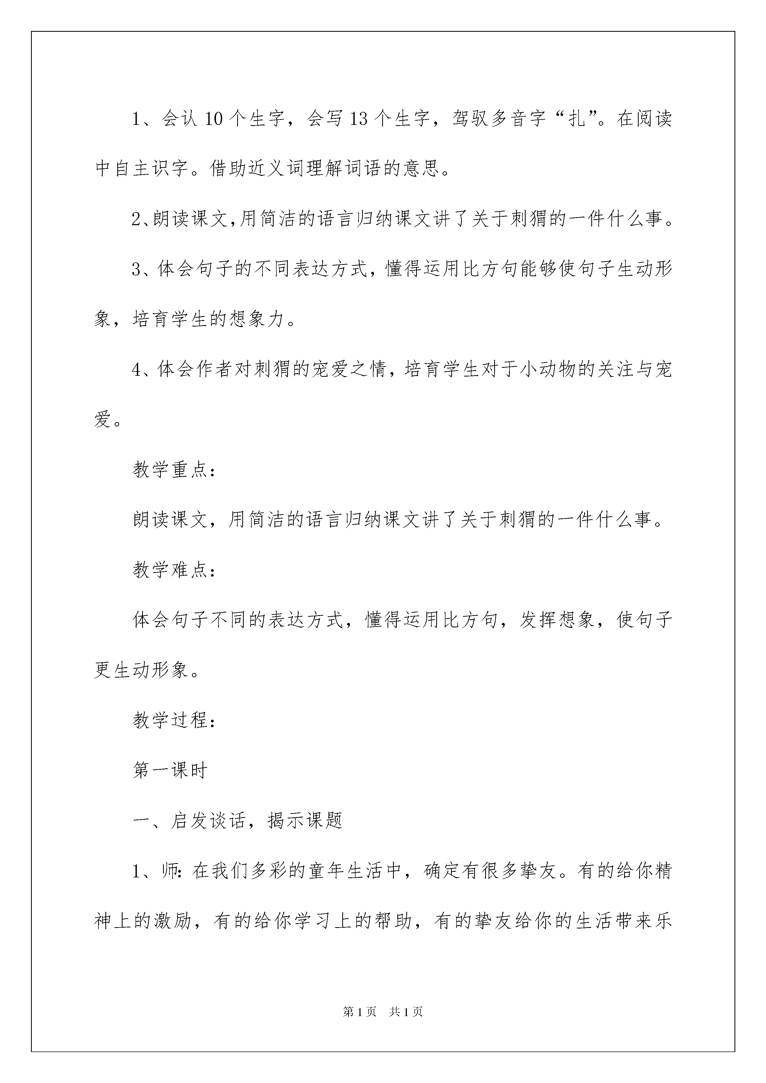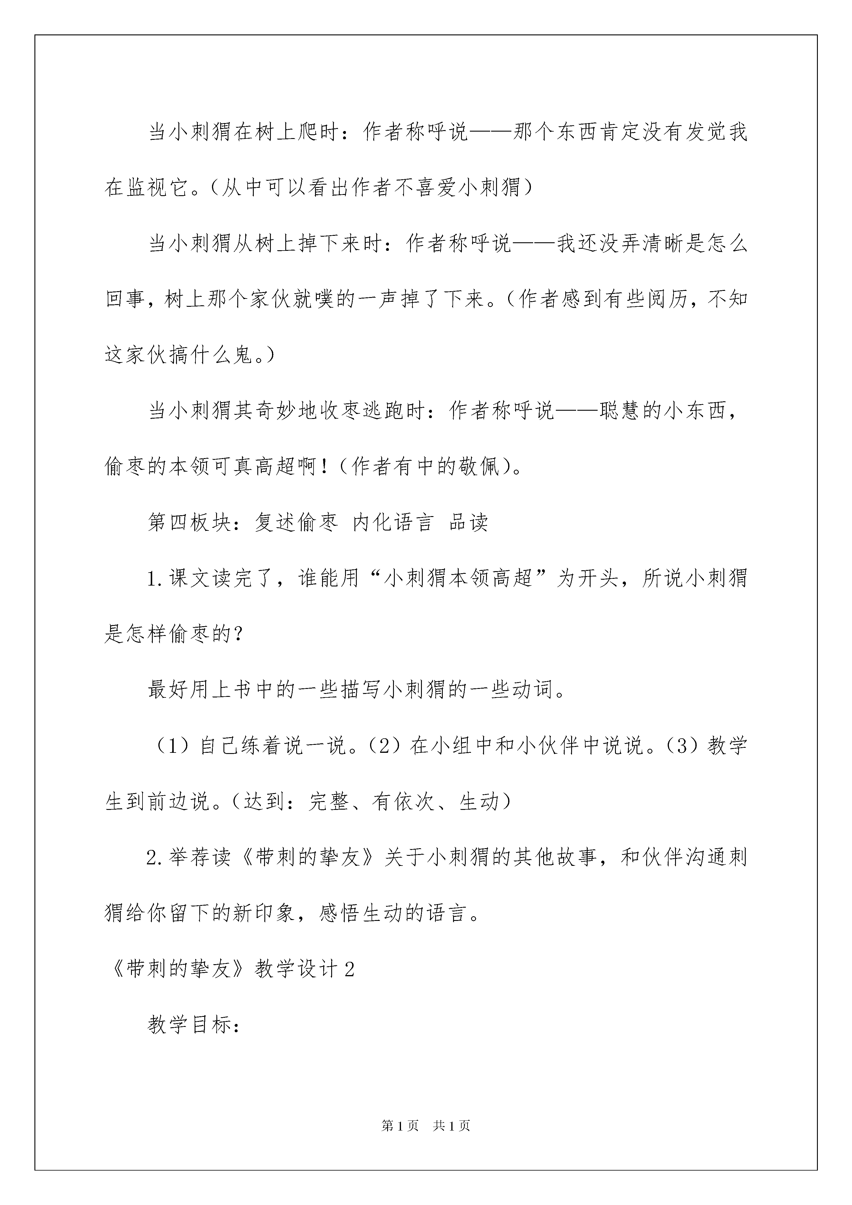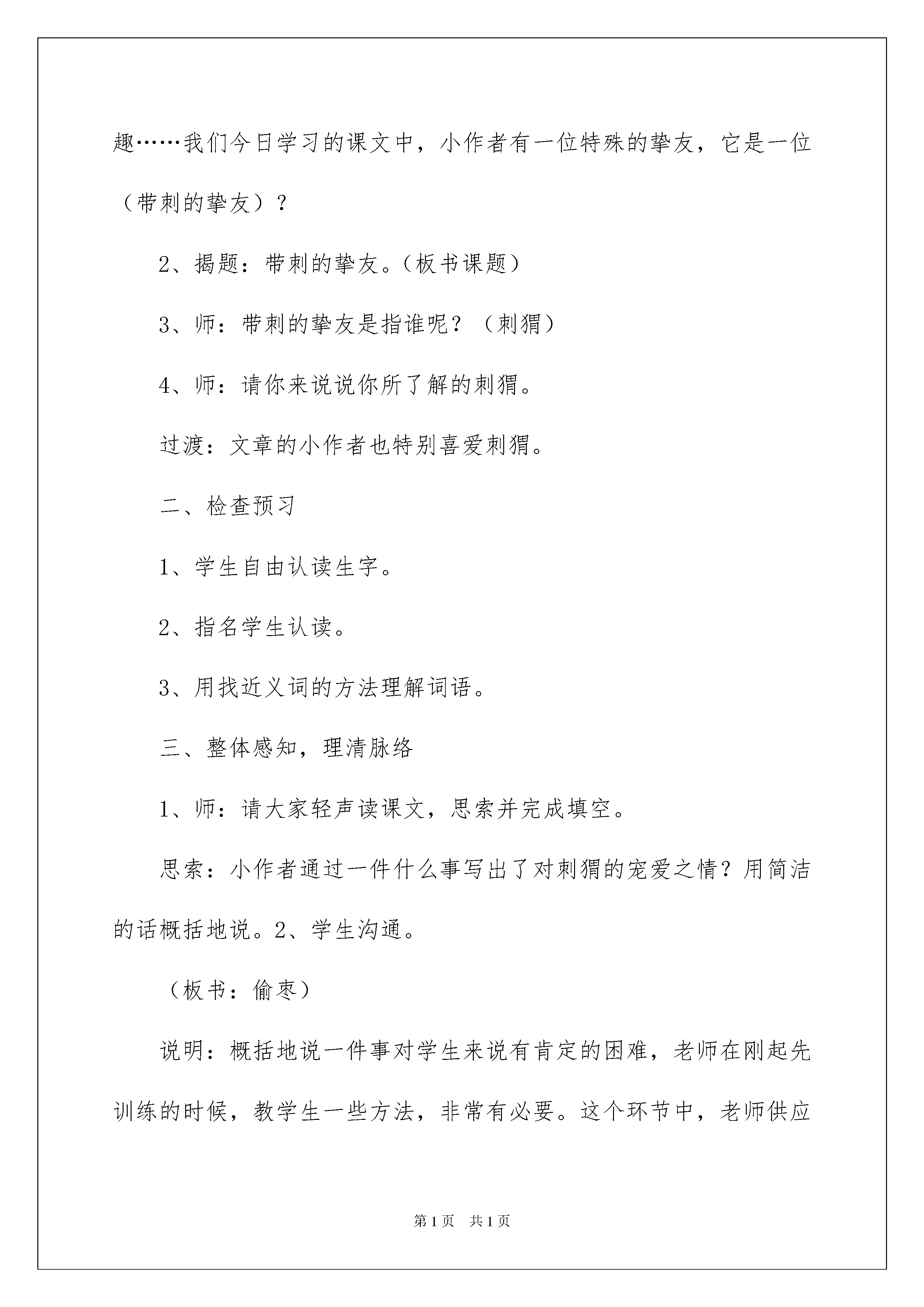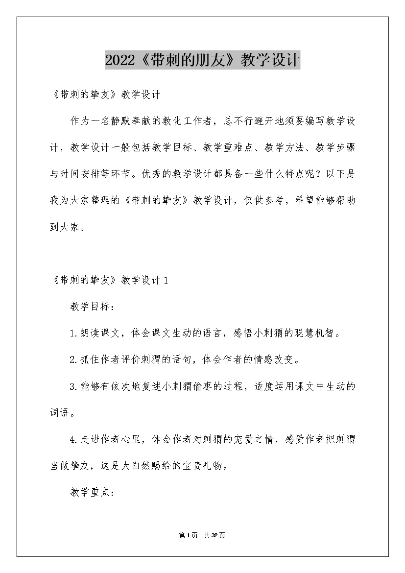 2022带刺的朋友教学设计带刺的挚友教学设计作为一位优秀的人民老师很有必要细心设计一份教学设计教学设计要遵循教学过程的基本规律选择教学目标以解决教什么的问题。那么问题来了教学设计应当怎么写?以下是我为大家整理的带刺的挚友教学设