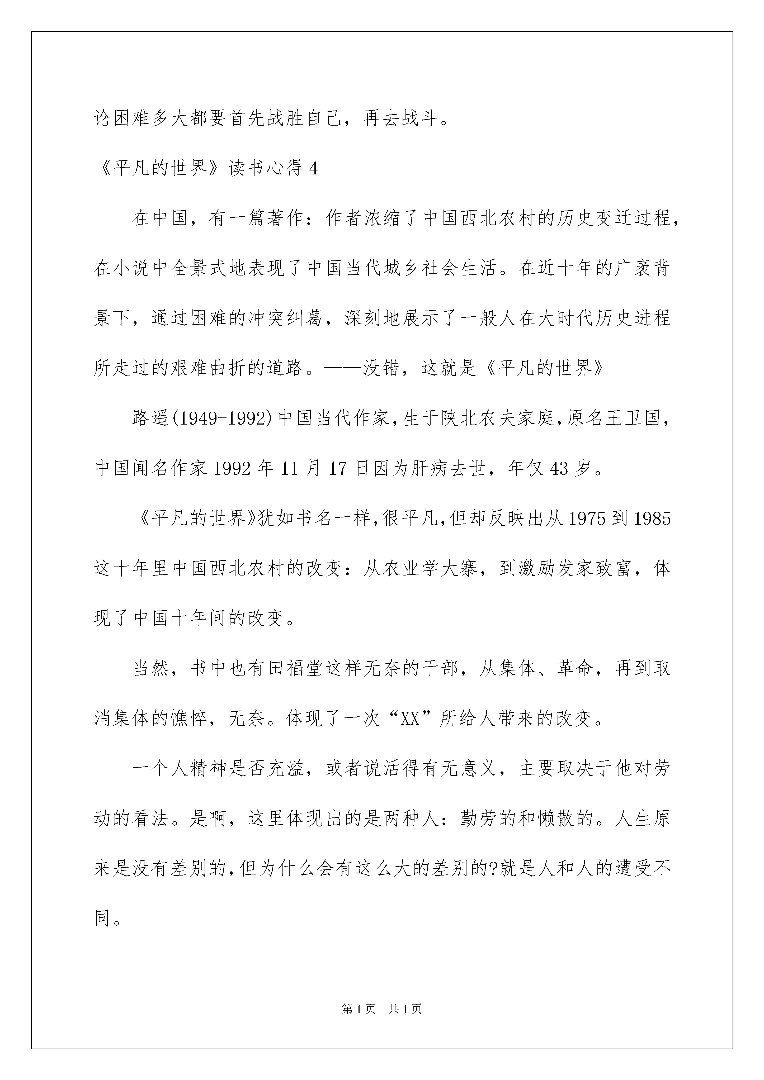 2022《平凡的世界》读书心得《平凡的世界》读书心得当阅读完一本名著后,信任你肯定有许多值得共享的收获,此时须要仔细思索读书心得如何写了哦。那要怎么写好读书心得呢?下面是我帮大家整理的《平凡的世界》读书心得,希望对大家有所帮助。《平凡的世界》读书心得1一百多万字的作品,竟也很快地读完了,只是因为一份真实吧。若干个家庭,若干个场景,若干个人物的命运,若