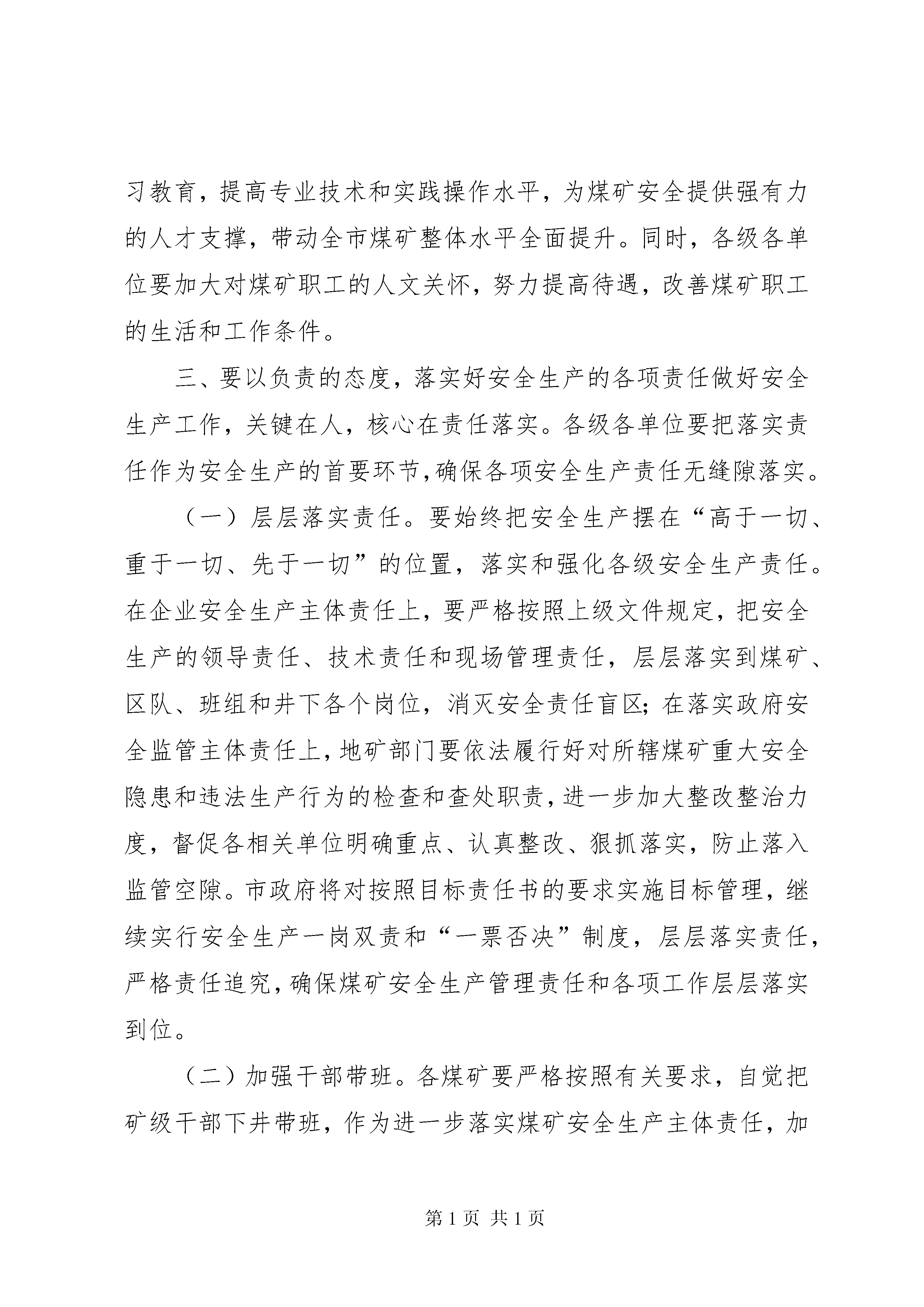 在全市煤炭工作会议上的讲话今天这次会议主要任务是总结2019年的成绩和不足分析当前形势安排部署今年工作推动全市煤炭工业安全稳定发展。刚才X处煤矿作了表态发言希望大家相互学习借鉴;X局长通报了2019年安全执法检查情况各单位要对号入座举一反三抓好整改;X主任作了很好的工作报告大家要认真抓好贯彻落实。下面针对2020年工作我再强调四个方面。一、精准发力抓好安全生产。过去的一年全市煤炭系统以迎接建国70周年专项行动为抓手严责任、控风险、除隐患全力保安尤其是新冠肺炎疫情以来大家勇于担当、迎难而上努力克服疫情给煤矿