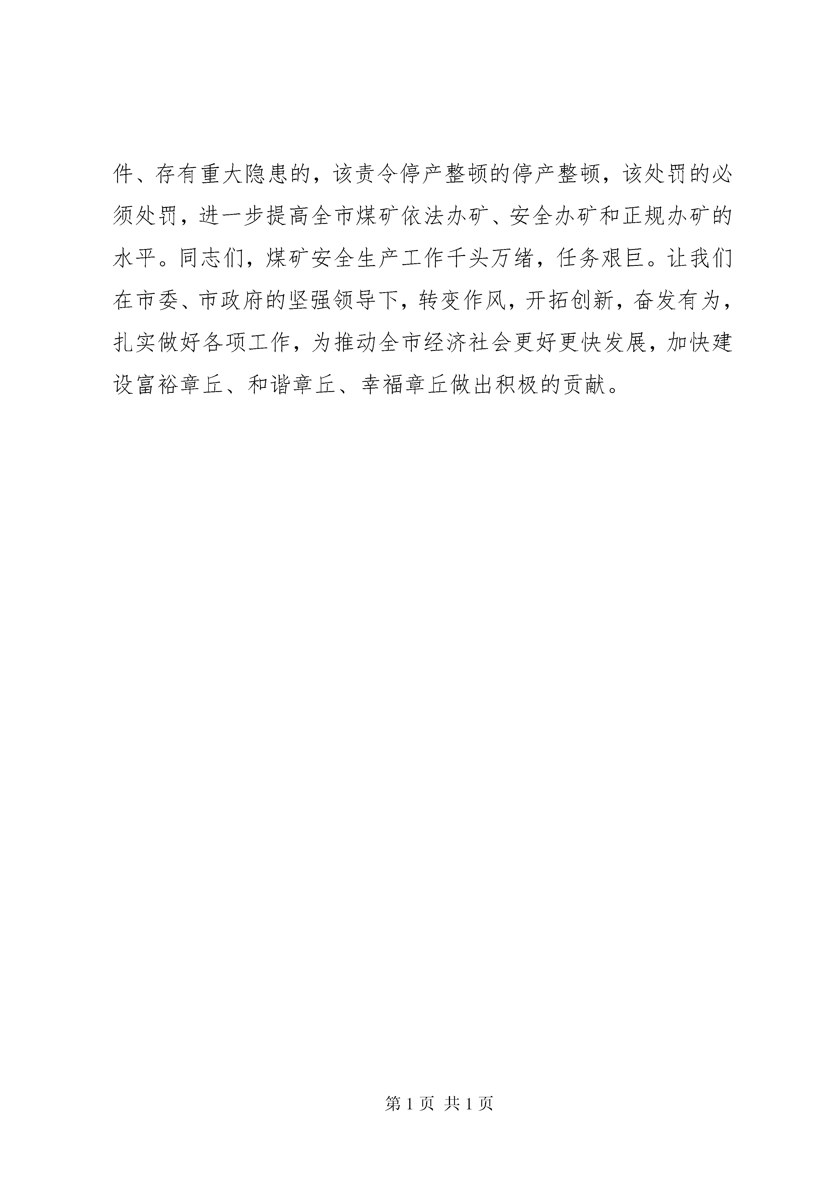 全市煤炭工作会议讲话稿同志们:今天召开这次会议主要是贯彻落实各级安全生产和煤炭工作会议精神全面总结20**年工作安排部署20**年任务确保全市煤矿安全生产为全市经济社会又好又快发展提供有力支撑。刚才方圆同志客观理性地通报了去年情况全面具体地安排了今年工作我完全赞同请大家按照要求抓好贯彻落实。会上还对20**年度先进单位和个人进行了隆重表彰并层层签订了安全生产目标责任书大家要对照职责比学先进不断提高抓安全生产的意识和水平确保全市煤矿安全生产、科学生产。下面就做好煤矿安全生产工