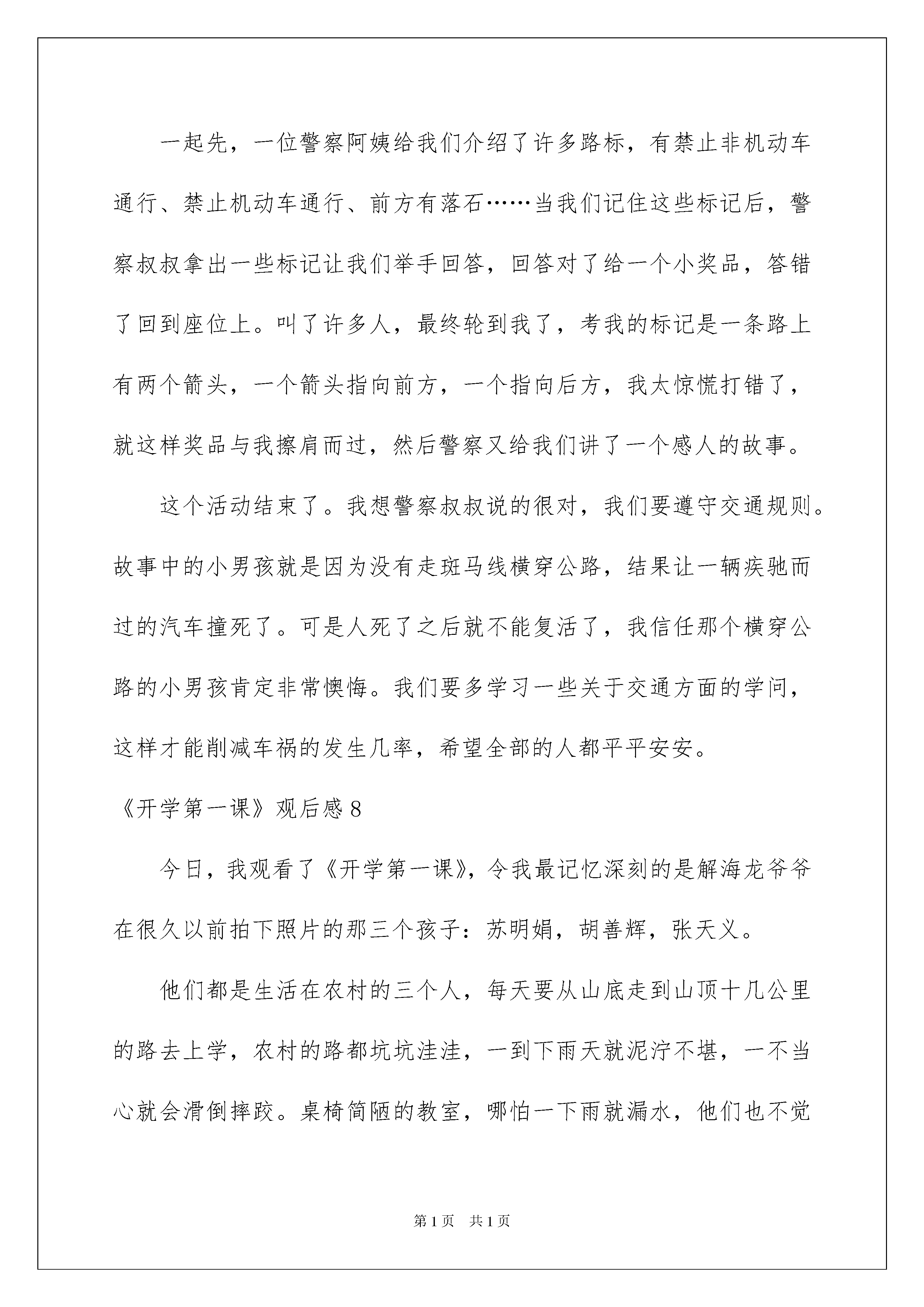 2022《开学第一课》观后感《开学第一课》观后感当看完一部作品后,肯定有不少感悟吧,让我们好好写份观后感,把你的收获感想写下来吧。那么观后感究竟应当怎么写呢?以下是我收集整理的《开学第一课》观后感,欢迎大家共享。《开学第一课》观后感1节目会请到许多长时的老红军或他们的后代,讲解并描述他们的英雄故事。有几个战士的传奇经验给我的印象很深。有一个战士,在