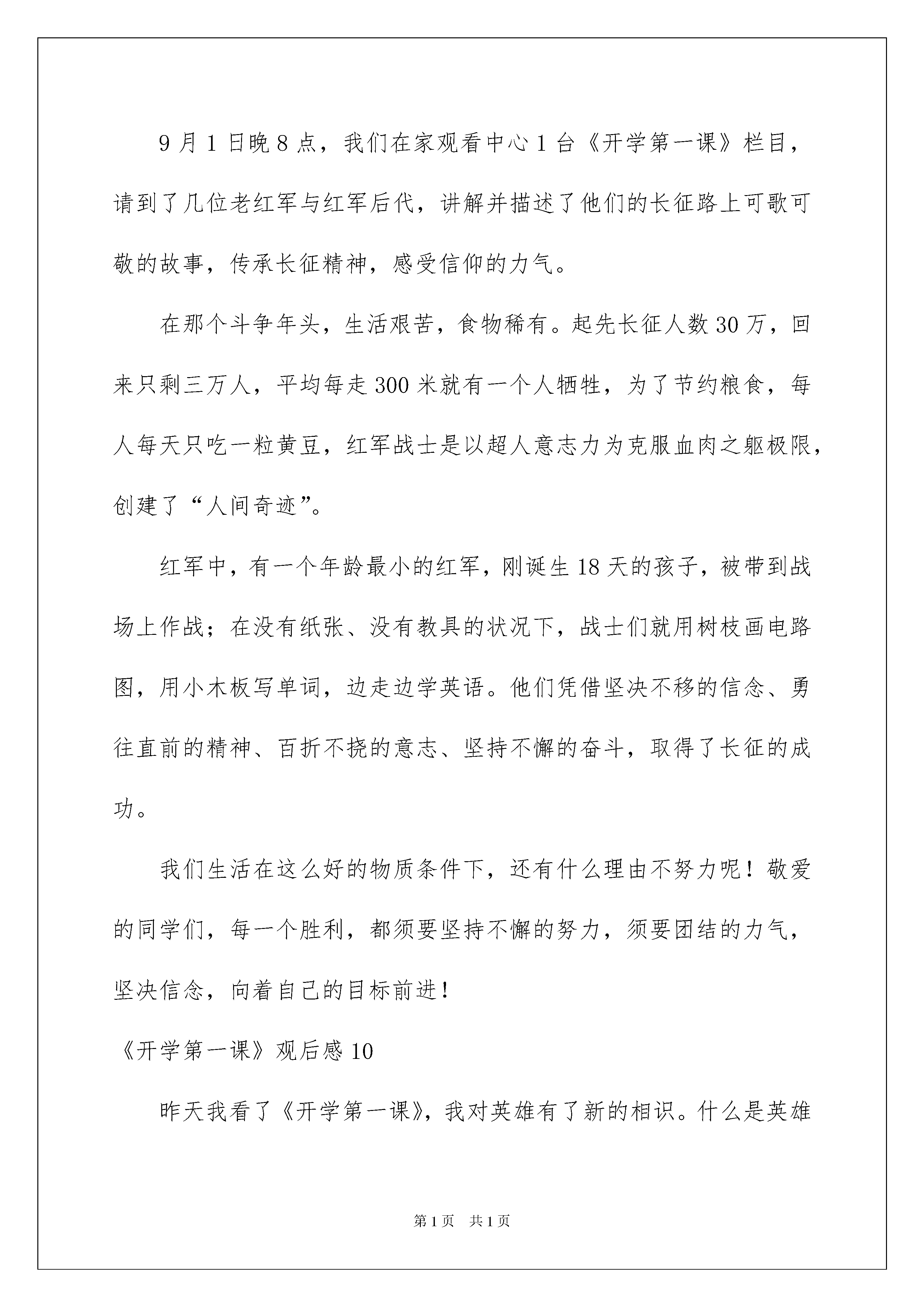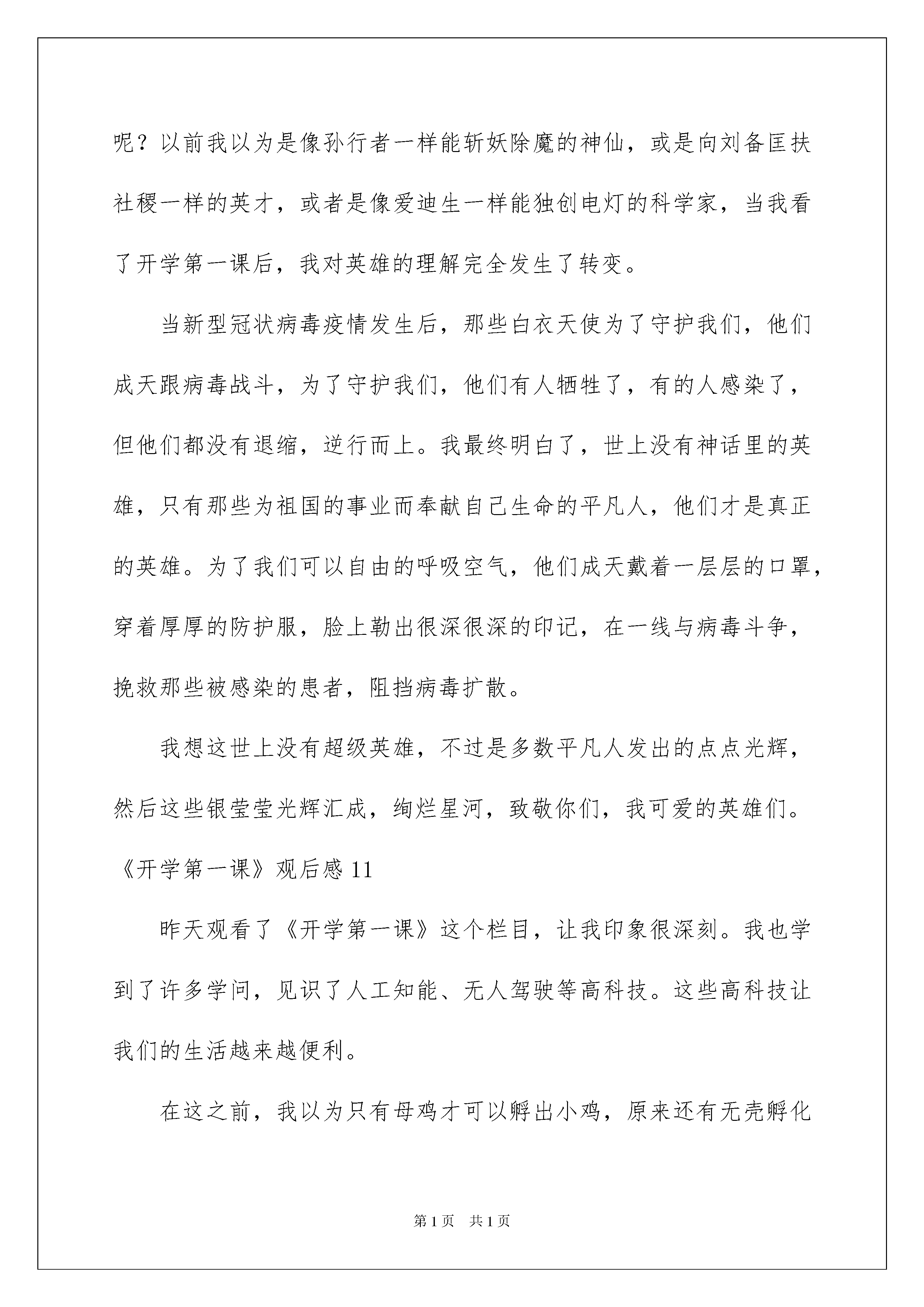 2022《开学第一课》观后感《开学第一课》观后感(合集15篇)当观看完一部影视作品后,你有什么总结呢?此时须要仔细地做好记录,写写观后感了。为了让您不再为写观后感头疼,下面是我收集整理的《开学第一课》观后感,欢迎大家借鉴与参考,希望对大家有所帮助。《开学第一课》观后感1时间在每个人的生命中仿佛一名匆忙过客,来去皆无影无踪。转瞬间又是一年开学季,同学
