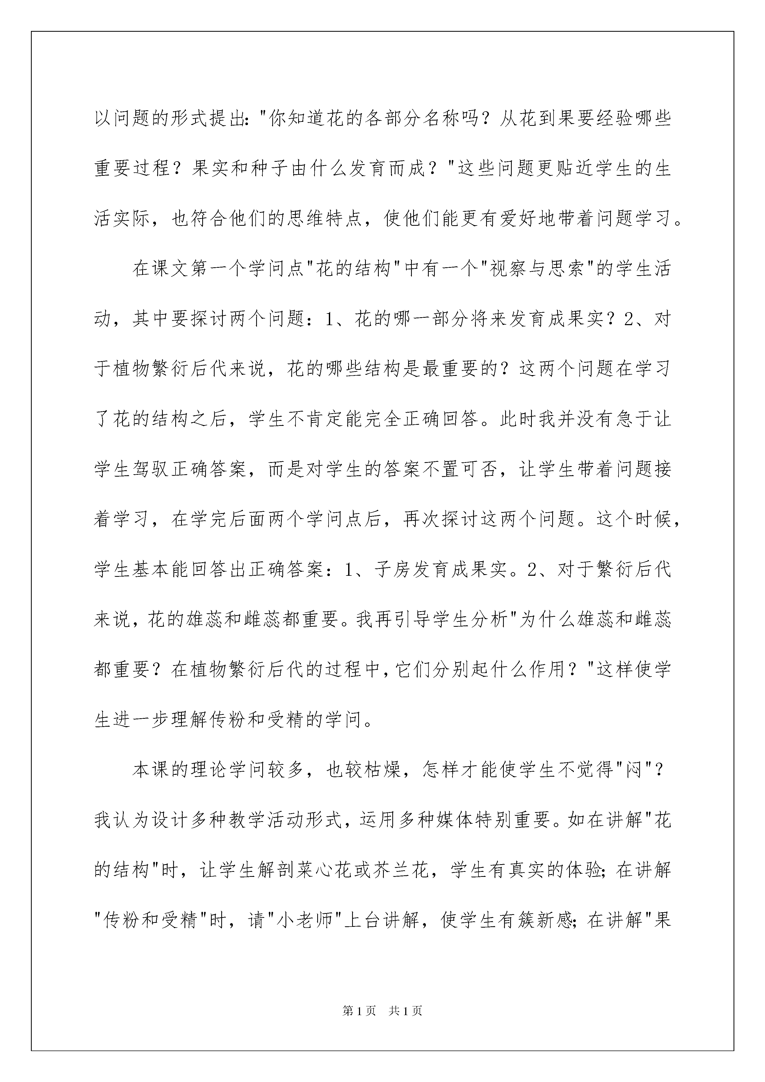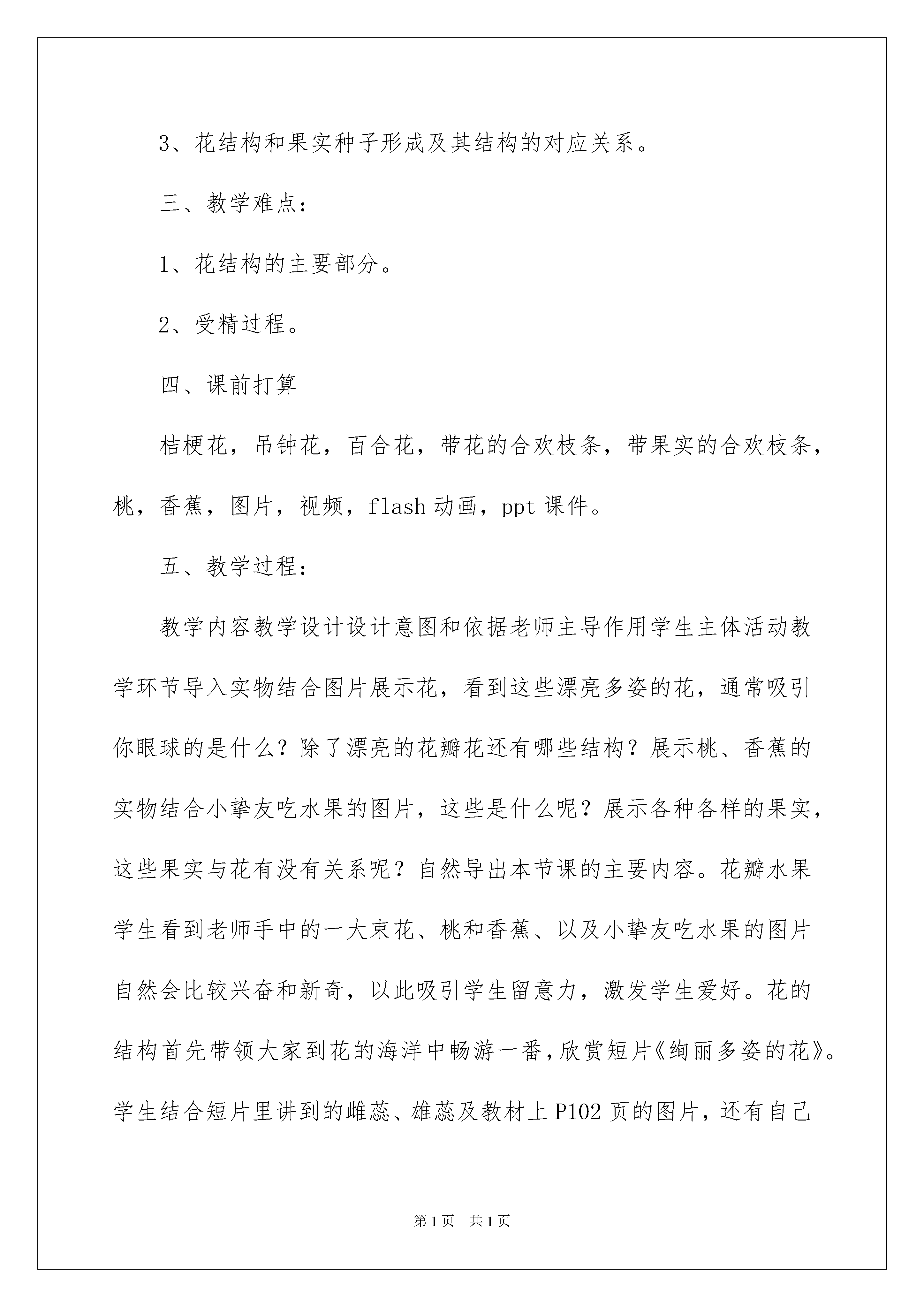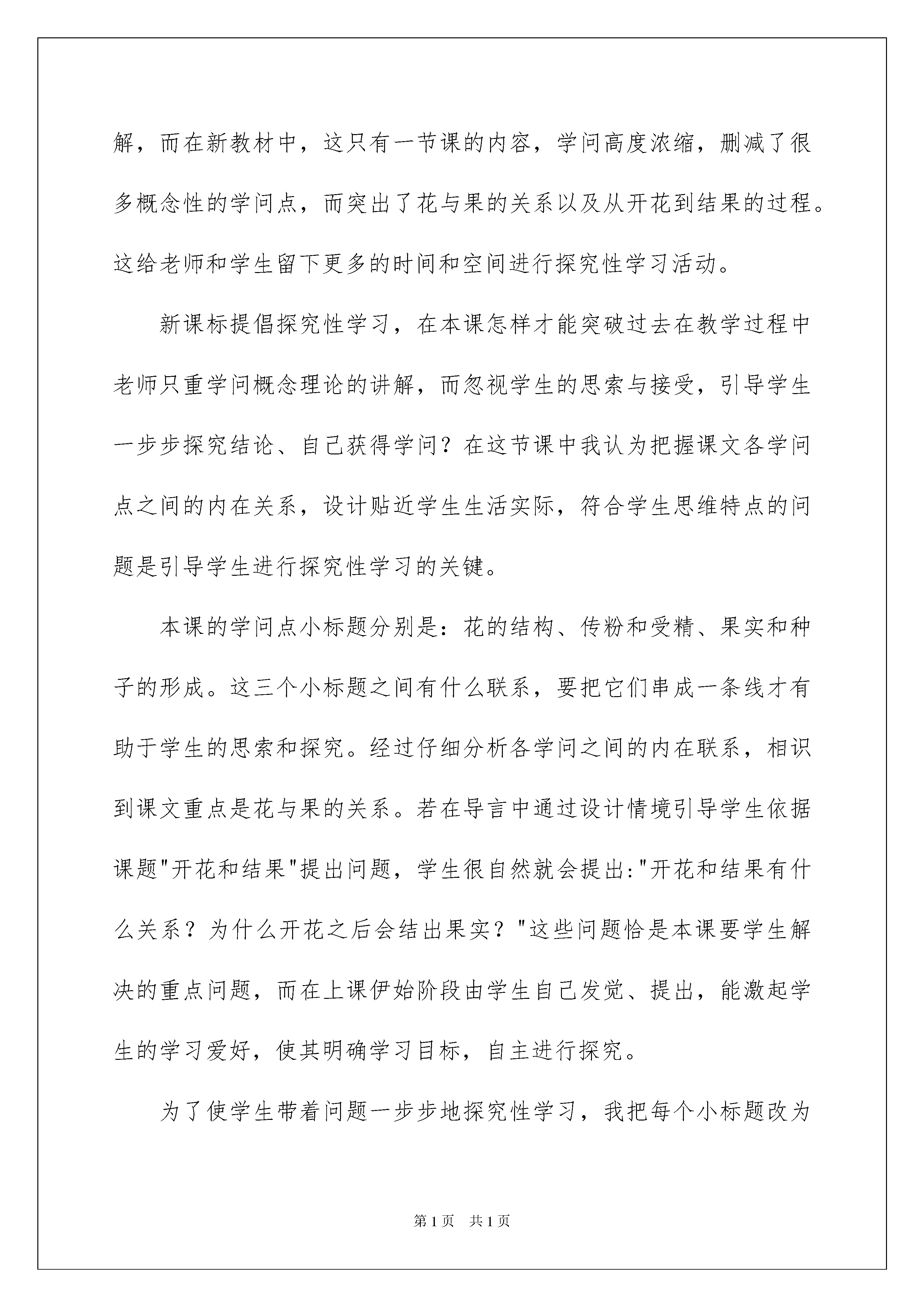 2022《开花和结果》教学设计《开花和结果》教学设计作为一名教学工作者,就难以避开地要打算教学设计,借助教学设计可以更好地组织教学活动。那么你有了解过教学设计吗?下面是我整理的《开花和结果》教学设计,希望能够帮助到大家。《开花和结果》教学设计1一、教学对象分析:初一的学生朝气蓬勃,酷爱大自然,对新颖的事物充溢新奇,希望探究其中的奥妙。而开花之后会结