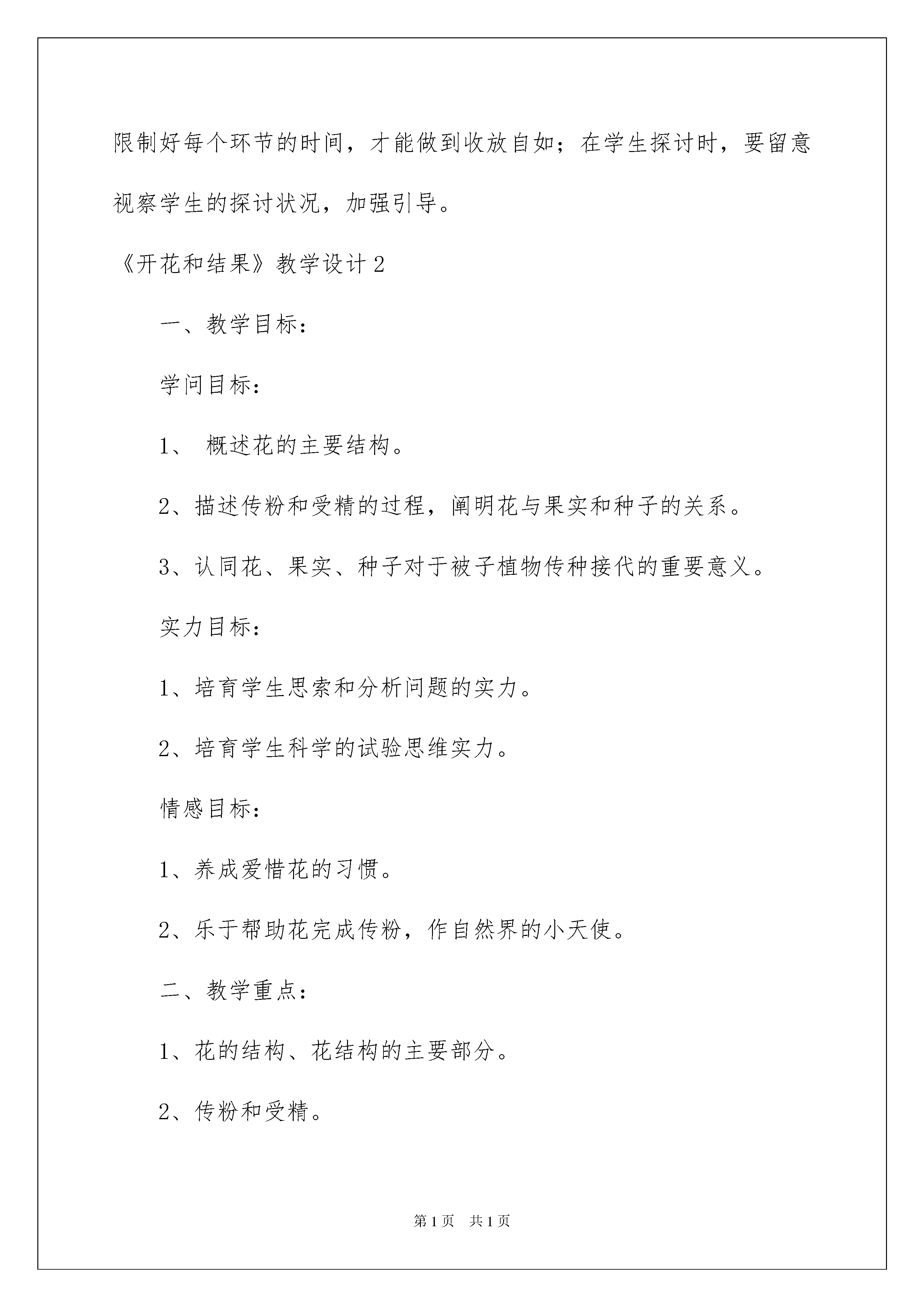 2022《开花和结果》教学设计《开花和结果》教学设计作为一名教学工作者就难以避开地要打算教学设计借助教学设计可以更好地组织教学活动。那么你有了解过教学设计吗?下面是我整理的《开花和结果》教学设计希望能够帮助到大家。《开花和结果