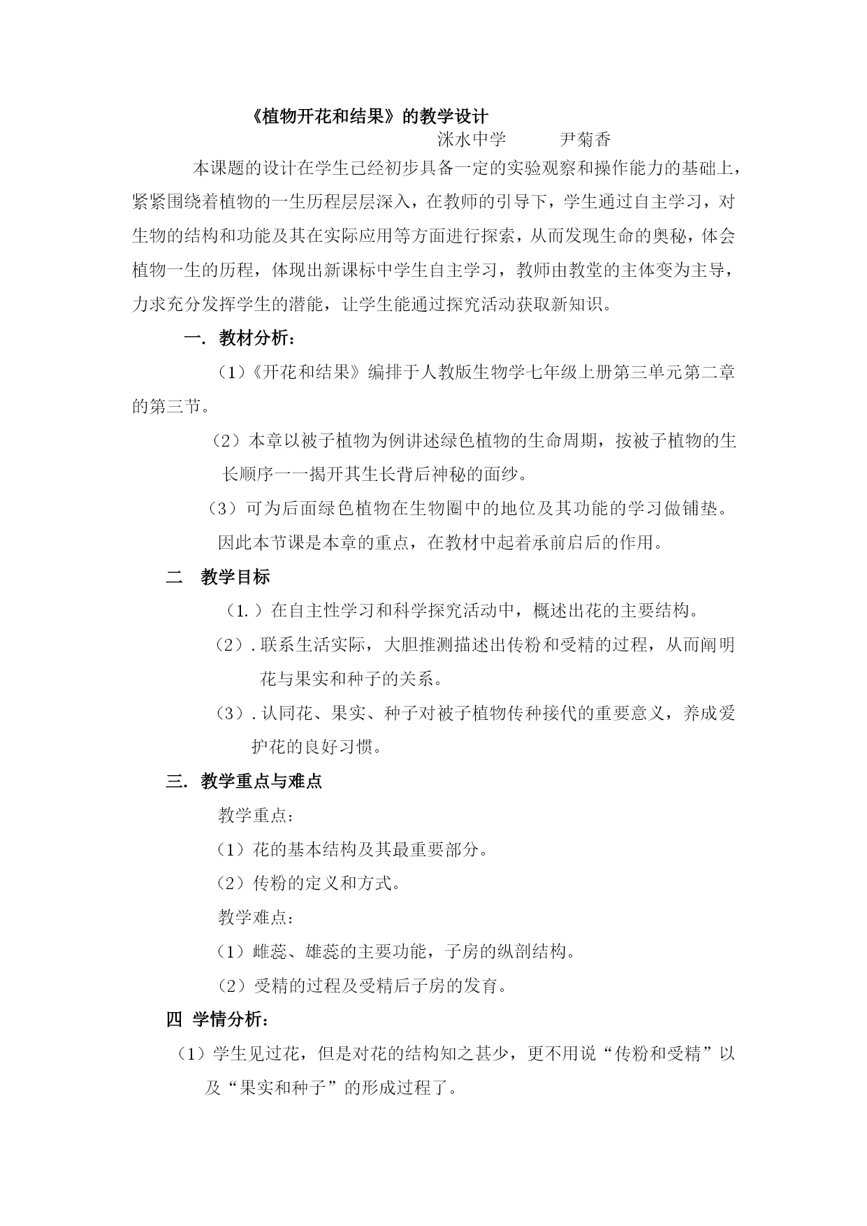 《植物开花和结果》的教学设计洣水中学尹菊香本课题的设计在学生已经初步具备一定的实验观察和操作能力的基础上,紧紧围绕着植物的一生历程层层深入,在教师的引导下,学生通过自主学习,对生物的结构和功能及其在实际应用等方面进行探索,从而发现生命的奥秘,体会植物一生的历程,体现出新课标中学生自主学习,教师由教堂的主体变为主导,力求充分发挥学生的潜能,让学生能通过探究活动获取新知识。一.教材分析:(1)《开花和结果》编排于人教版生物学七年级上册第三单元第二章的第三节。(2)本章以被子植物为例讲述绿色植物的生命周期,按被