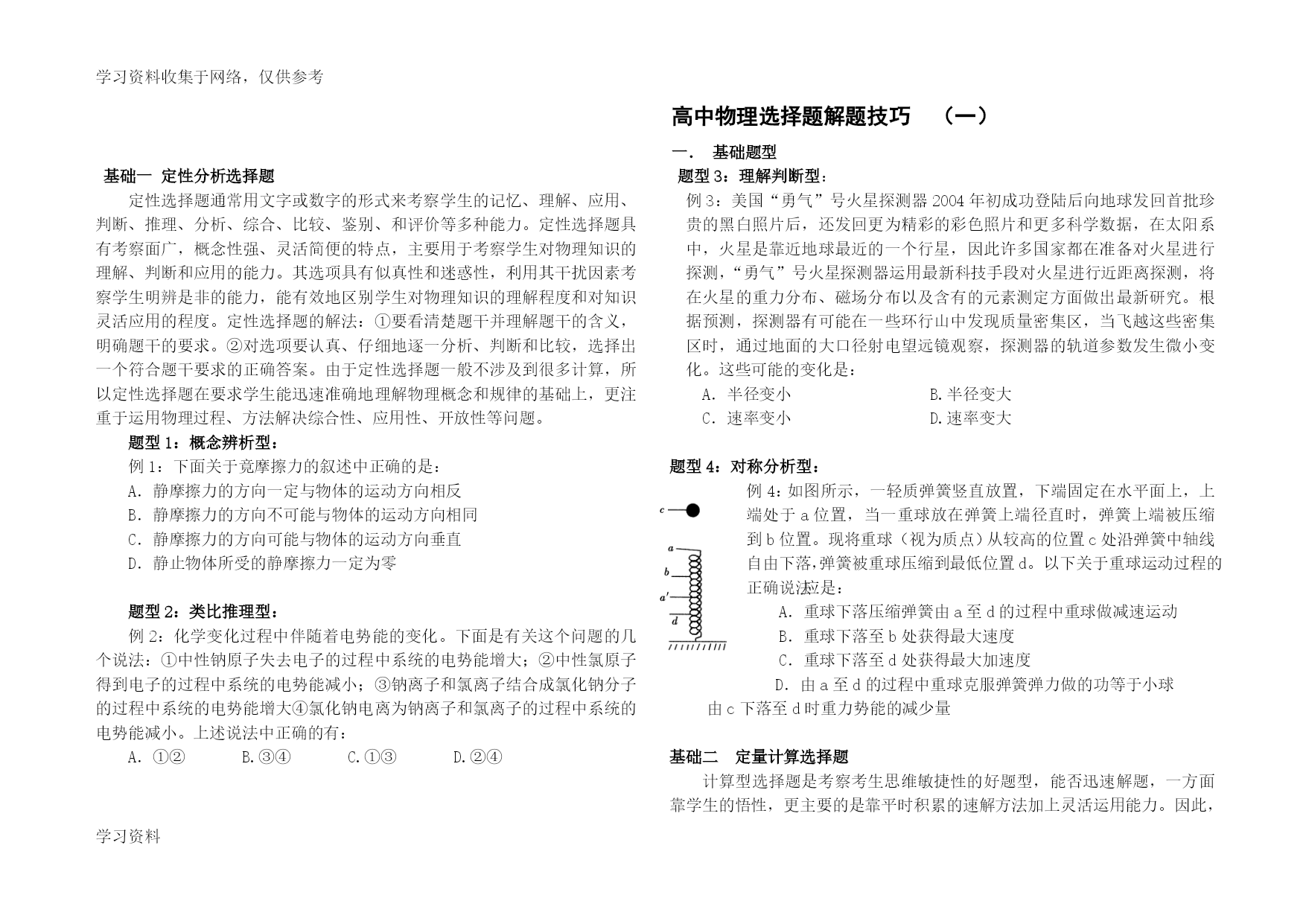 高考物理选择题的解题技巧1.直接判断法这种方法主要应用于考查基本概念,基本规律的题型中,只要牢固掌握了基础知识,就可直接判断选出正确答案。例1.关于机械能,下列说法正确的是()A.作变速运动的物体,有摩擦力存在时,机械能一定减少B.作变速运动的物体,若使物体产生加速度的力不是重力,则物体的机械能一定守恒C.作变速运动的物体,只受重力作用时,机械能一定守恒D.在水平面上作变速运动的物体,它的机械能一定守恒解析:选项A中,不明确摩擦力是动力还是阻力,故机械能不一定减少,故选项A错误;选项B中,已指出使物体产生