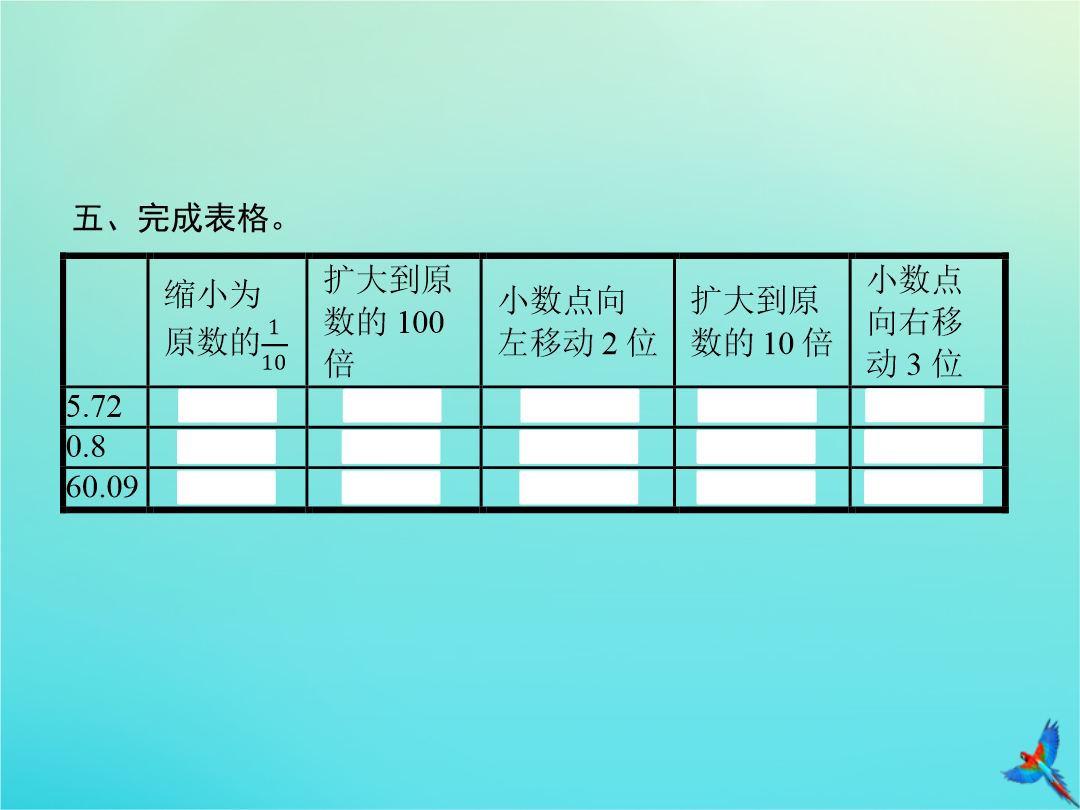 第3课时阶段演练一、我会填。1.小数点向右移动三位,小数就(扩大)到原数的(1000)倍。2.小数点向左移动两位,小数就(缩小)到原数的()。3.5.3扩大到它的100倍是(530),缩小到它的是(0.0053)。4.下面树叶上可以填哪些数字?5.56cm=(0.56)m89角=(8.9)元830kg=(0.83)t5090g=(5.09)kg600dm2=(6)m23.08m=(3080)mm二、我会比。(在○里填上“>”“<”或“=”)三、我会算。7.56×10=75.67.36×10=73.60.8