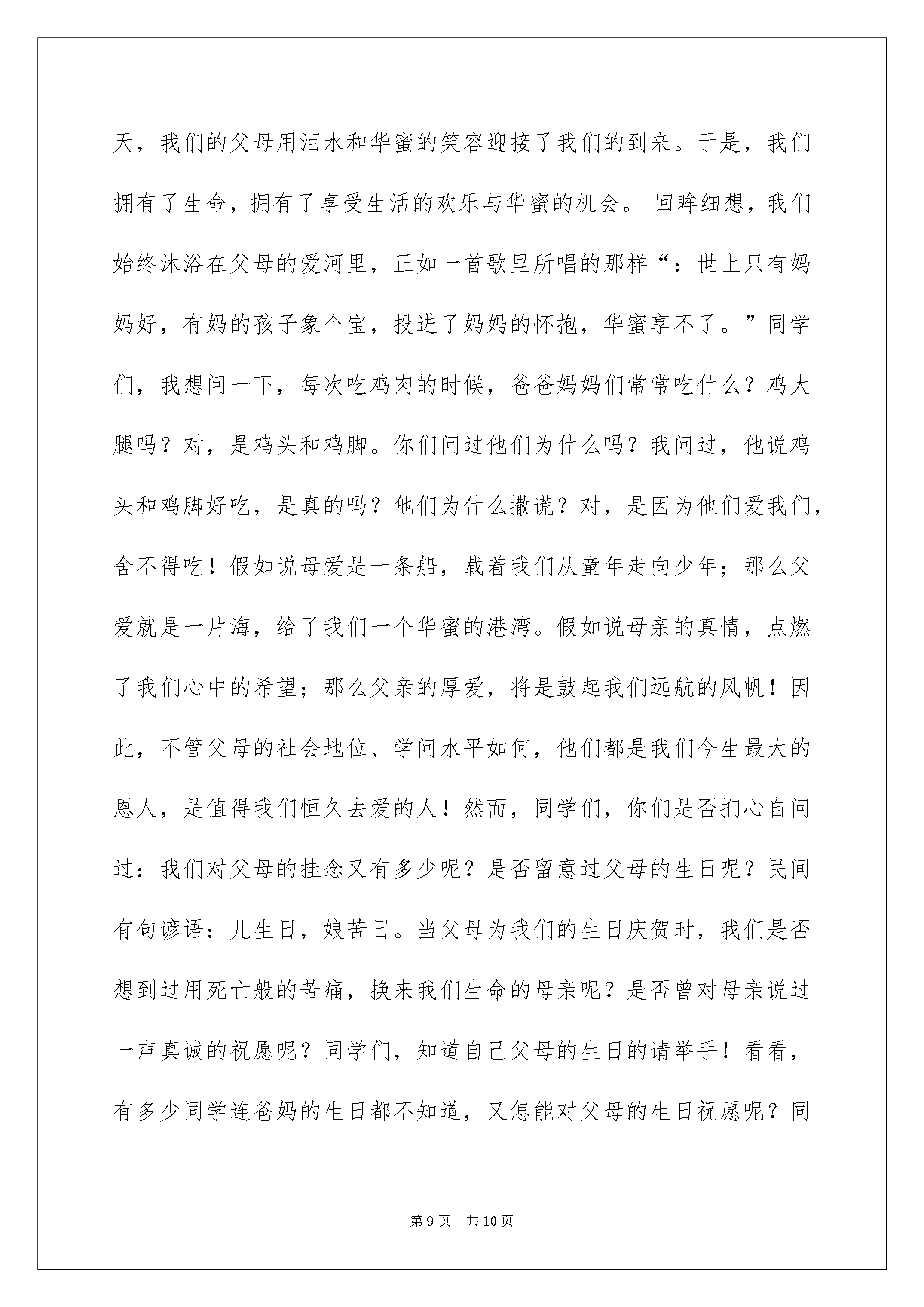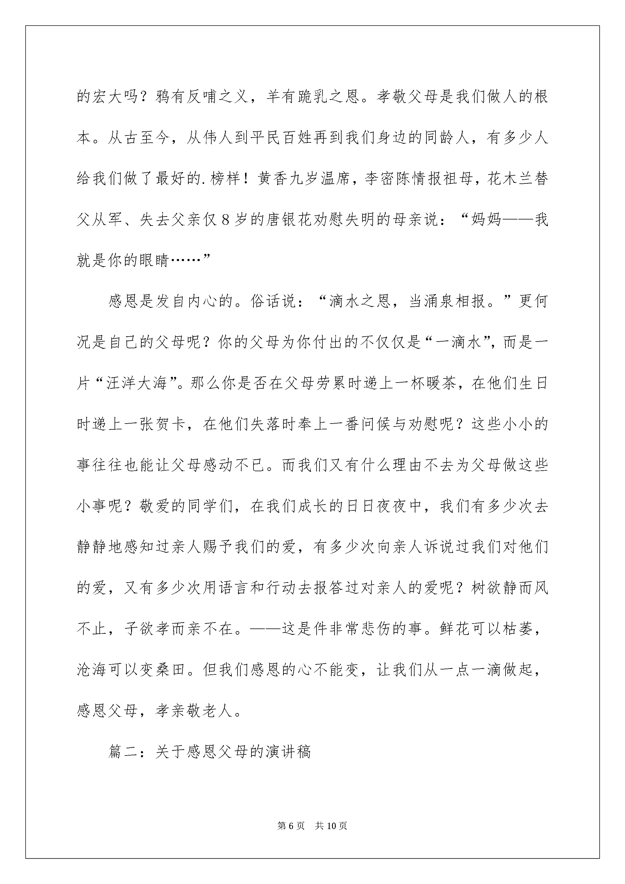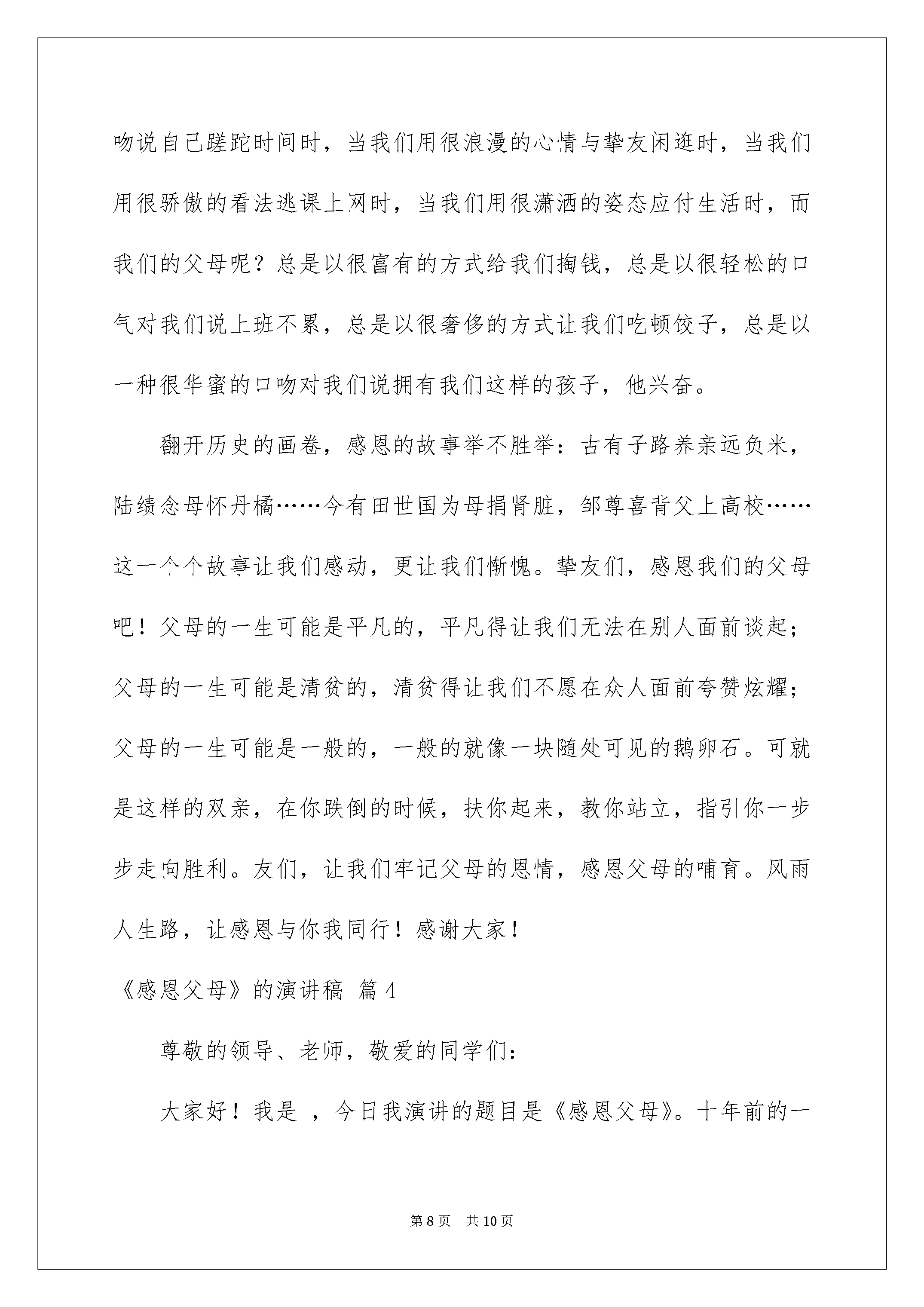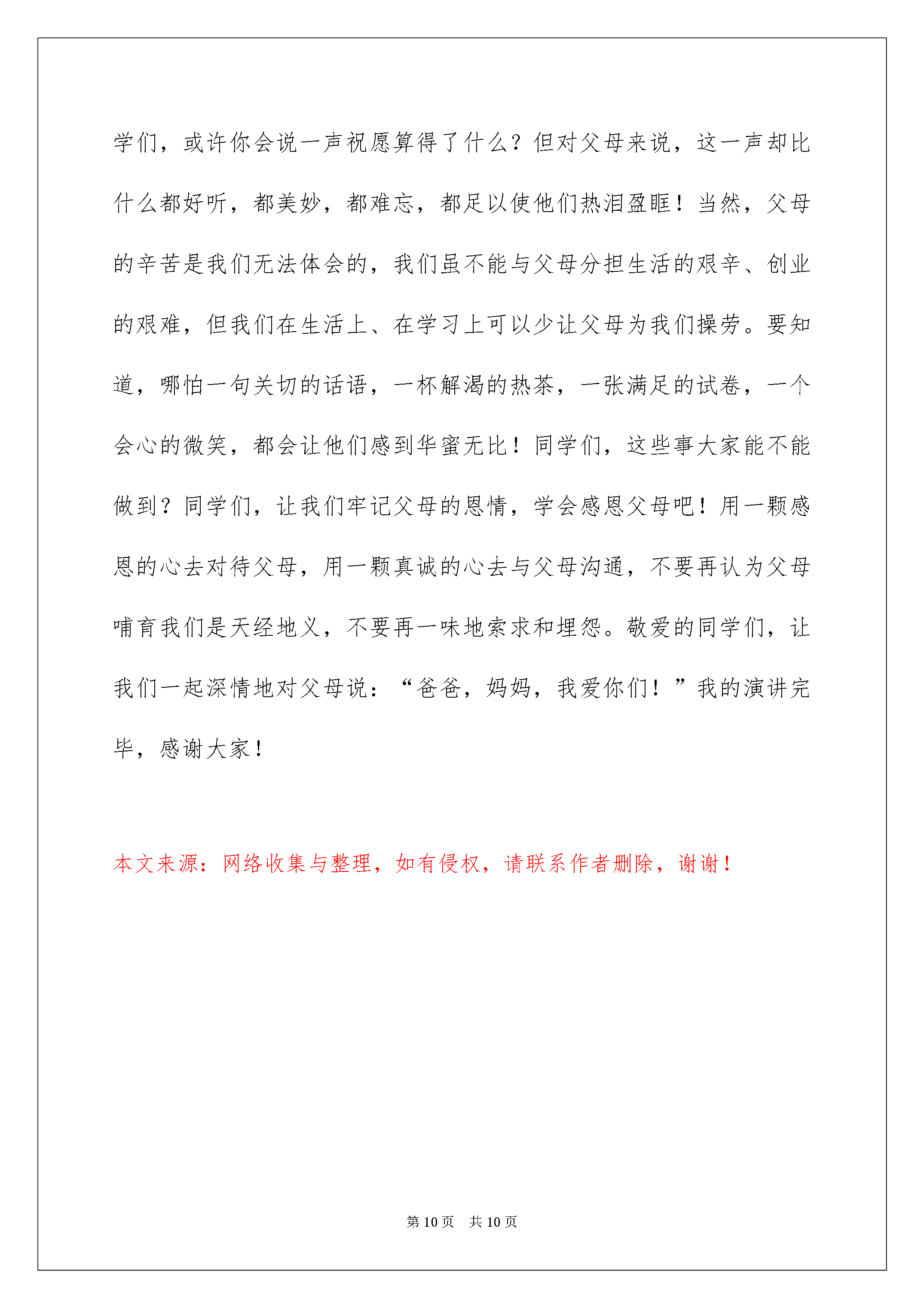 2022《感恩父母》的演讲稿《感恩父母》的演讲稿4篇演讲稿可以提高演讲人的自信念,有助发言人更好地呈现自己。在我们平凡的日常里,越来越多人会去运用演讲稿,演讲稿的留意事项有很多,你确定会写吗?下面是我为大家整理的《感恩父母》的演讲稿4篇,欢迎大家借鉴与参考,希望对大家有所帮助。《感恩父母》的演讲稿篇1敬重老师,敬爱的同学们:大家好!我曾听见有人说过