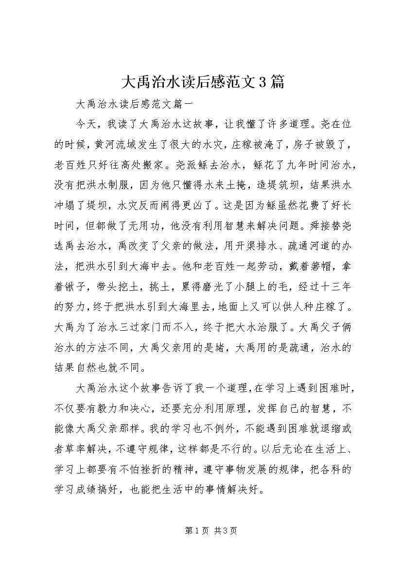 大禹治水读后感范文3篇大禹治水读后感范文篇一今天我读了大禹治水这故事让我懂了许多道理。尧在位的时候黄河流域发生了很大的水灾庄稼被淹了房子被毁了老百姓只好往高处搬家。尧派鲧去治水鲧花了九年时间治水没有把洪水制服因为他只懂得水来土掩造堤筑坝结果洪水冲塌了堤坝水灾反而闹得更凶了。这是因为鲧虽然花费了好长时间但都做了无用功他没有利用智慧来解决问题。舜接替尧选禹去治水禹改变了父亲的做法用开渠排水、疏通河道的办法把洪水引到大海中去。他和老百姓一起劳动戴着箬帽拿着锹子带头挖土挑土累得磨光