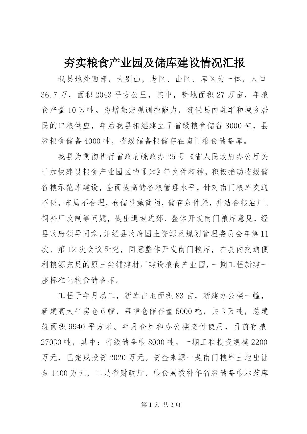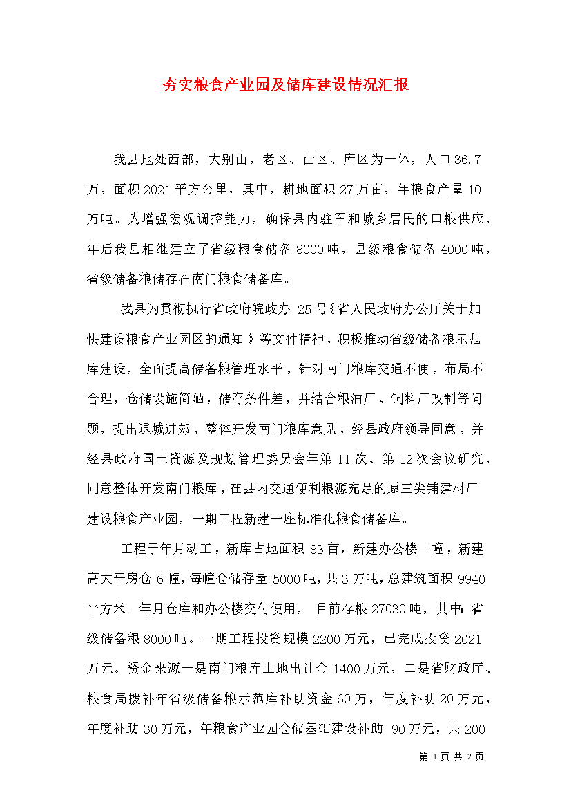 夯实粮食产业园及储库建设情况汇报我县地处西部大别山老区、山区、库区为一体人口36.7万面积2043平方公里其中耕地面积27万亩年粮食产量10万吨。为增强宏观调控能力确保县内驻军和城乡居民的口粮供应年后我县相继建立了省级粮食储备8000吨县级粮食储备4000吨省级储备粮储存在南门粮食储备库。我县为贯彻执行省政府皖政办25号《省人民政府办公厅关于加快建设粮食产业园区的通知》等文件精神积极推动省级储备粮示范库建设全面提高储备粮管理水平针对南门粮库交通不便布局不合理仓储设施简陋储存