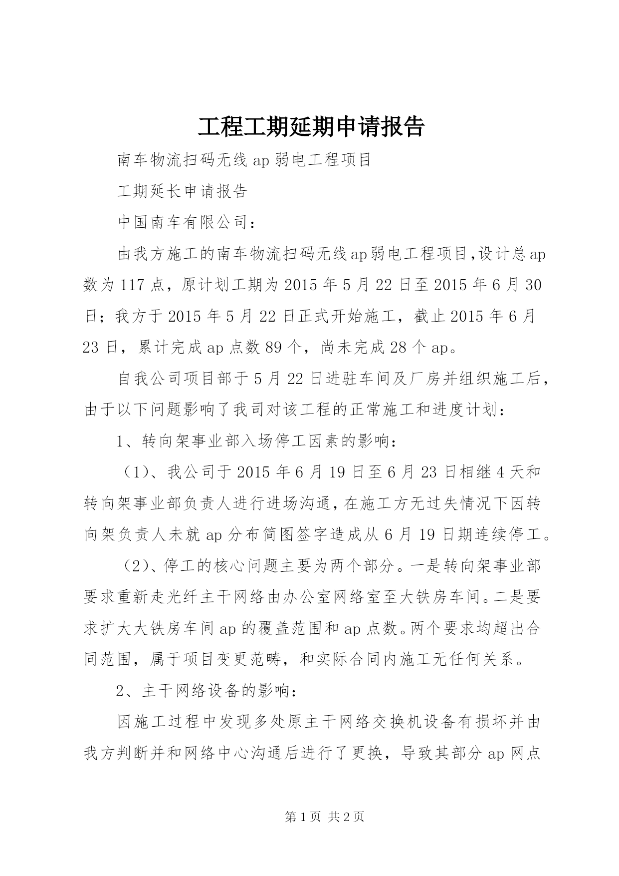 第PAGE\*Arabic\*MERGEFORMAT2页共NUMPAGES\*MERGEFORMAT2页工程工期延期申请报告南车物流扫码无线ap弱电工程项目工期延长申请报告中国南车有限公司:由我方施工的南车物流扫码无线ap弱电工程项目,设计总ap数为117点,原计划工期为2015年5月22日至2015年6月30日;我方于2015年5月22日正式开始施工,截止2015年6月23日,累计完成ap点数89个,尚未完成28个ap。自我公司项目部于5月22日进驻车间及厂房并组织施工后,由于以下问题影响了