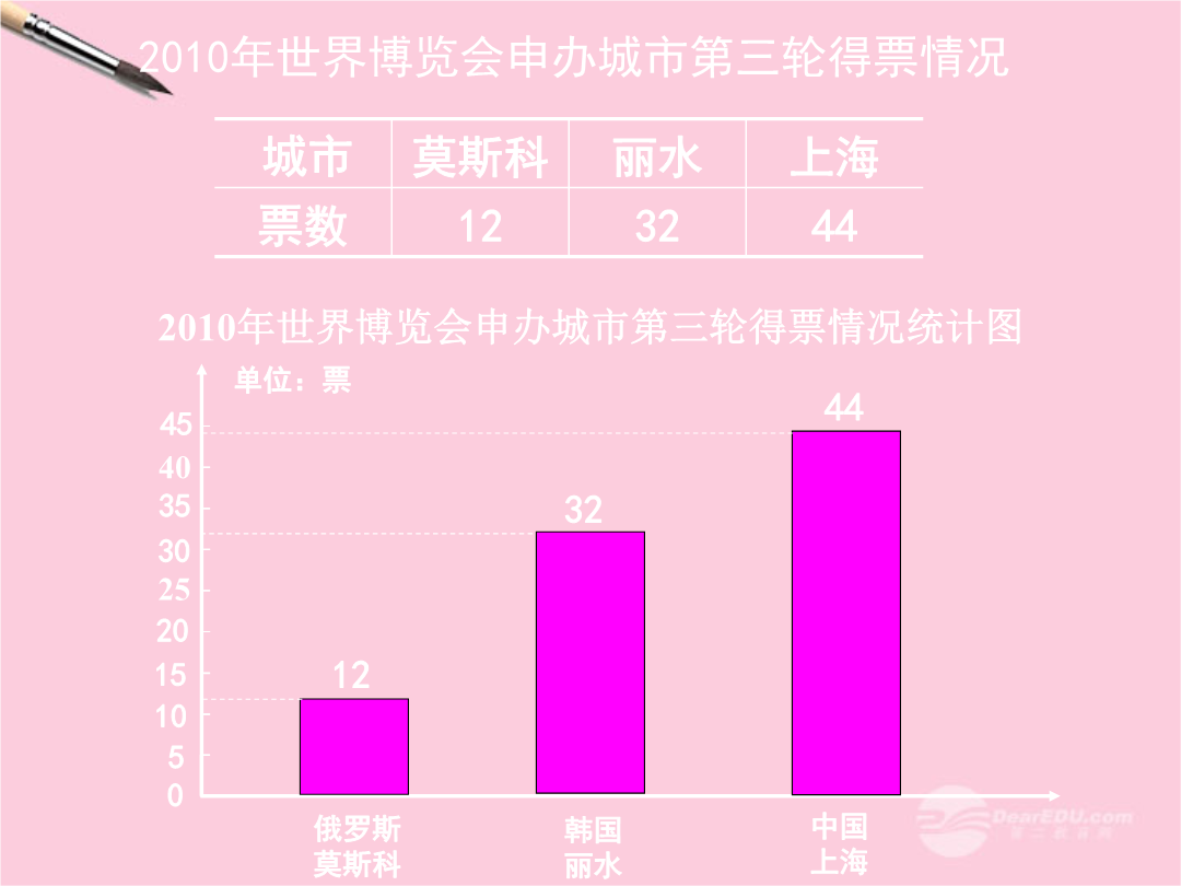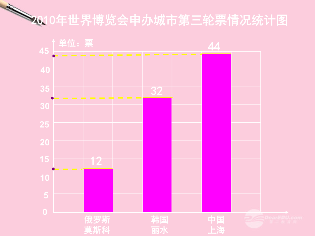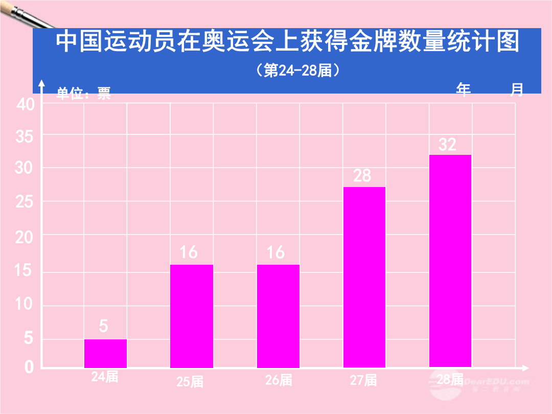 冀教版四年级数学上册教学目标波兰弗罗茨瓦夫:俄罗斯莫斯科:韩国丽水:墨西哥克雷塔罗:中国上海:2010年世界博览会申办城市第一轮得票情况统计图2010年世界博览会申办城市第三轮得票情况如下表44我国运动员在第24-28届奥运会上获得的金牌数如下表。中国运动员在奥运会上获得金牌数量统计图(第24-28届)年月你能不能解释一下图中所反映的信息?考考你!通过这张图,你能不能判断这个班级这次考试哪个学科的成绩好?为什么?本课小结