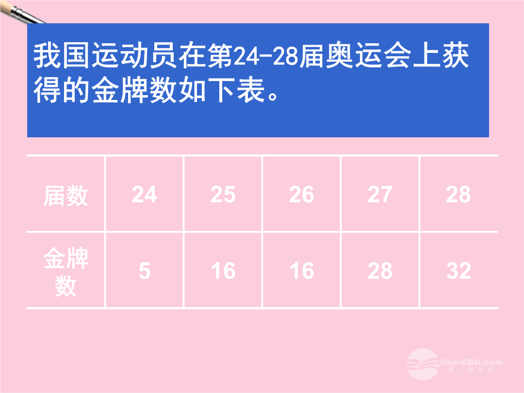 冀教版四年级数学上册教学目标波兰弗罗茨瓦夫:俄罗斯莫斯科:韩国丽水:墨西哥克雷塔罗:中国上海:2010年世界博览会申办城市第一轮得票情况统计图2002年12月2010年世界博览会申办城市第三轮得票情况如下表44我国运动员在第24-28届奥运会上获得的金牌数如下表。中国运动员在奥运会上获得金牌数量统计图(第24-28届)年月我国主要河流长度情况统计图年月~本课小结