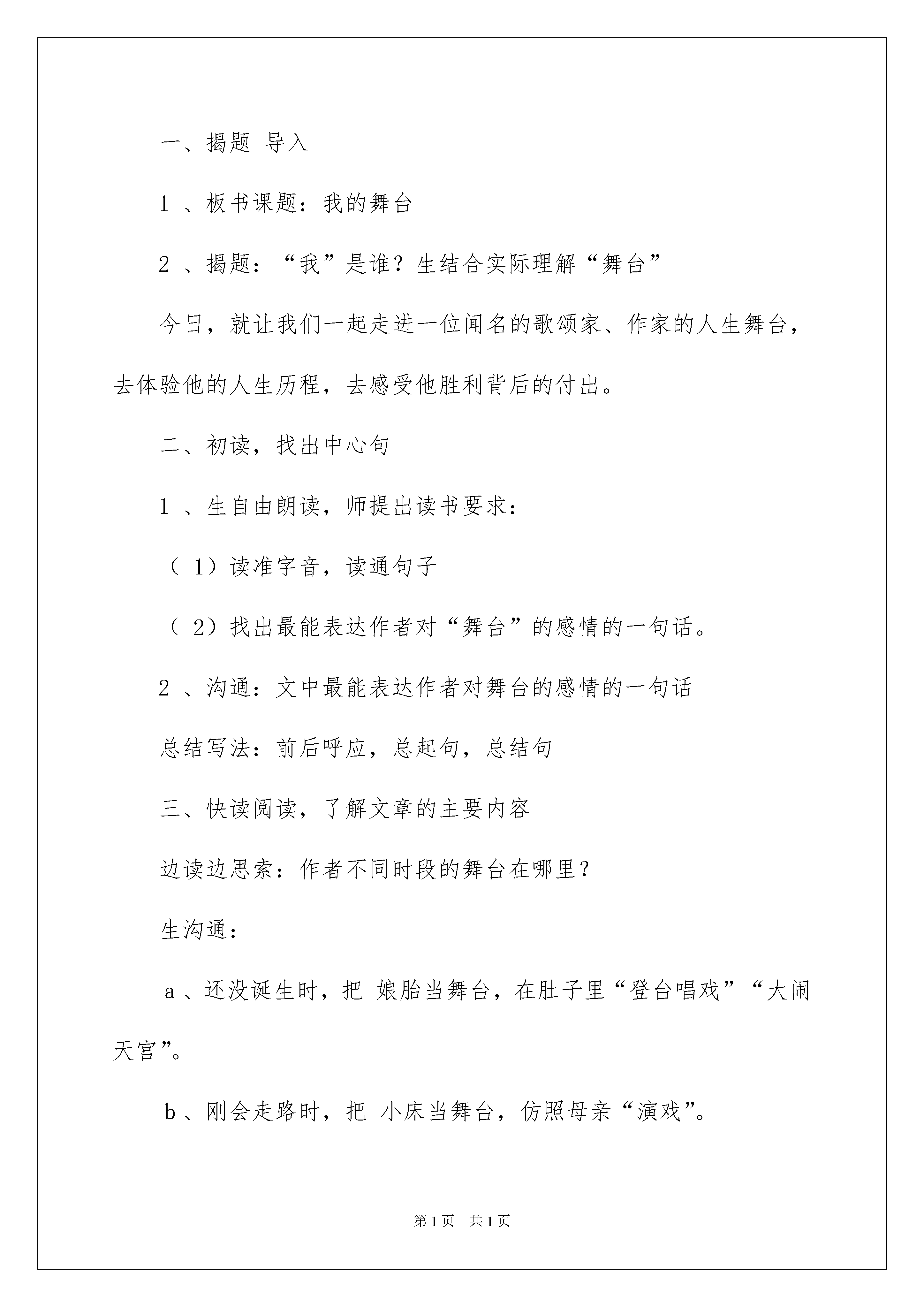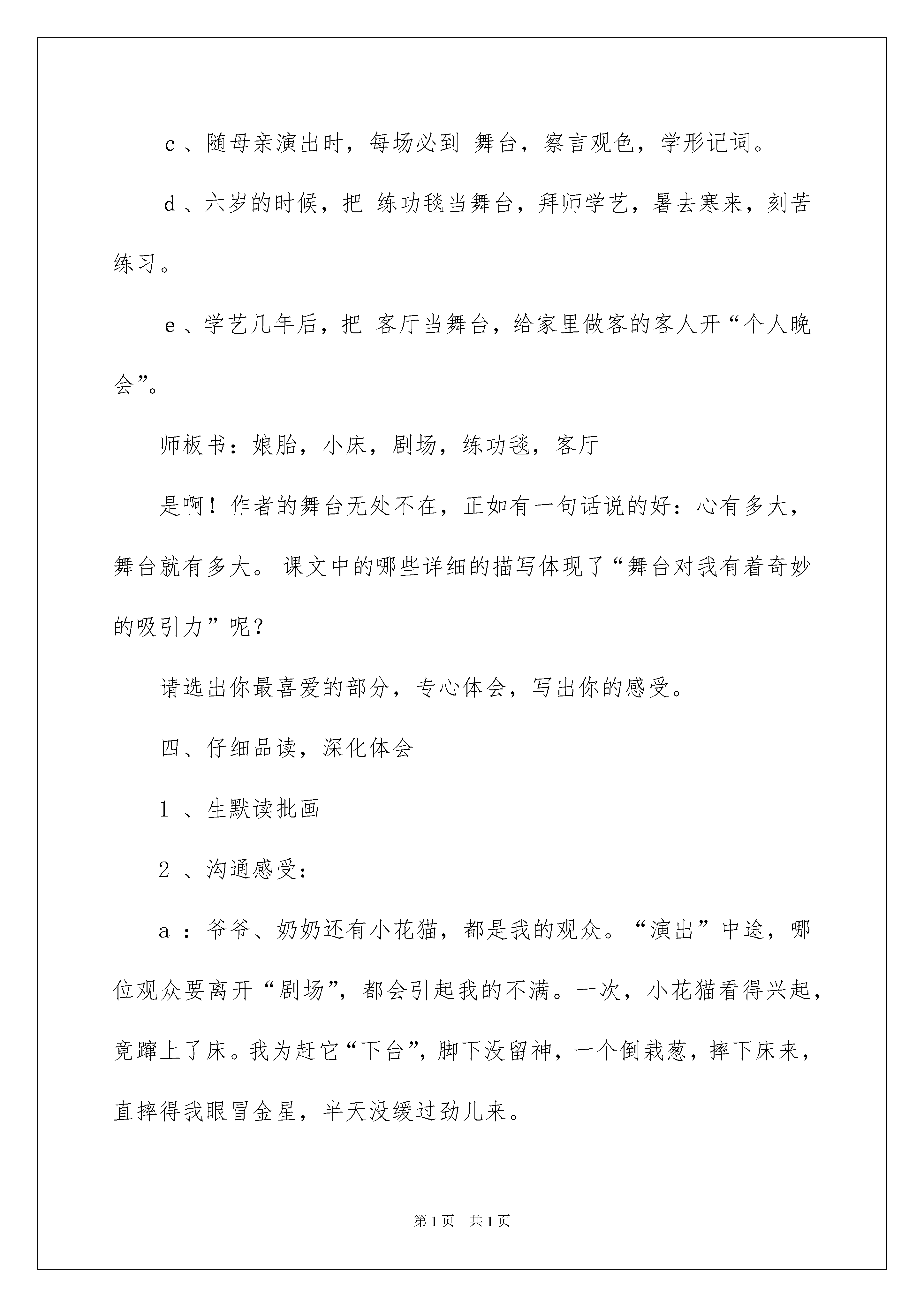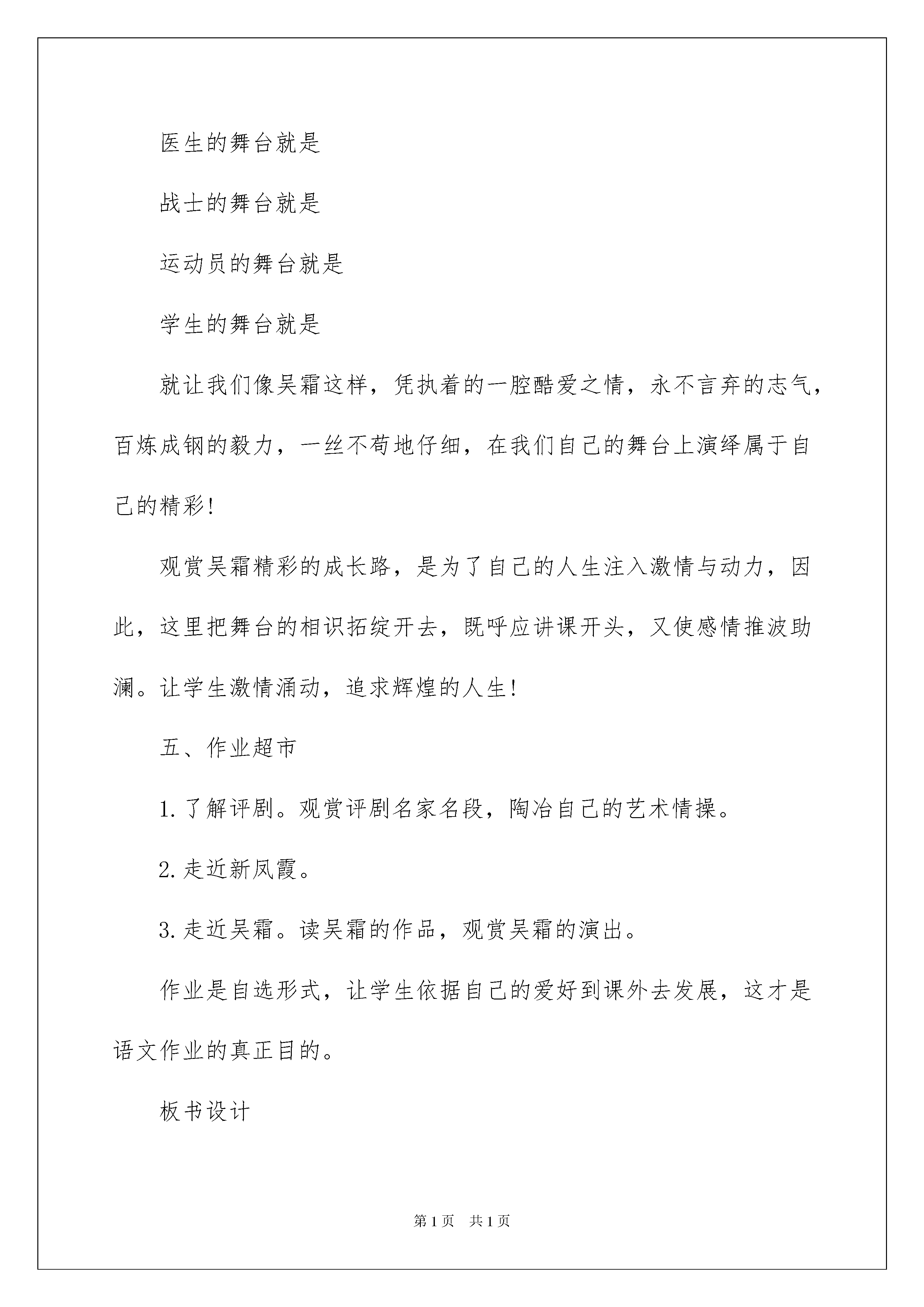 2022《我的舞台》教学设计《我的舞台》教学设计作为一名人民老师,就难以避开地要打算教学设计,教学设计是对学业业绩问题的解决措施进行策划的过程。那么应当如何写教学设计呢?以下是我为大家收集的《我的舞台》教学设计,希望对大家有所帮助。《我的舞台》教学设计1教学目标:1.读读记记“不解之缘、为所欲为、窃窃私语、无言以对、身材、风度”等词语,丰富词汇,积累语言。2.用比较快的速度读懂课文,感受“舞台对我有着奇妙的吸引力”,体会作者学艺的艰辛以及不一般的志气和毅力。3.感受戏剧表演艺术的奇妙魅力。重难点:透过字里行间,体会作者学艺的艰辛及超人的志气和毅力,感悟胜利来自于勤学苦练的成长之道。学具打算:PPT新凤霞、吴霜、评剧等资料。教学时间:一课时教学流程:一、积累词语1.建立舞台语言意象。板书:舞台。提到“舞台”,脑海中出现出哪些词语?自由发言。一行接力。缤纷、绚丽、五花八门、奇妙、辉煌……词语的搭配运用是积累词语的一个传统做法,也是一个很好用的方法,是适合于每个年级的学生的训练方法。因为要丰富舞台的意象,所以此处支配()的舞台的练习。2.出示课题。二、整体感知,直奔重点。1.速读课文,思索:文中的“我”指的是谁?我的舞台分别在哪里?提示运用小标题的方法归纳课文梗概的方法。2.沟通板书。整体感知,理清文章脉络是走进文本深处的基础,方法许多,此处由课题引发,学生学习起来可能会比较顺畅。三、品读课文,习言得意。要求:仔细默读课文,读到吸引自己的地方,就反复回读几遍,有了思索和感受可以用笔记在书上,打算沟通。沟通要点:过渡:我们根据课文的叙述依次,观赏吴霜在不同的舞台之上同样精彩的演出。1.娘胎“大闹天宫”。(幽默风趣的语言,让人忍俊不禁)2.床上惊魂。(A载歌载舞,憨态可掬。B从小喜爱表演。C赶猫下台,惊魂一刻。)以上二处为略学,课文写得明白,所以没必要再挖掘。同时也是体现略读课文的特点。3.侧台学戏。A每场必到。路途远,演出晚,都不怕,体现了一个孩子对戏剧艺术发自内心的酷爱。B选择在侧台看戏。小吴霜在侧台只顾(学母亲演戏的身材,记母亲演戏的戏文,揣摩戏曲中的板眼……)遗忘了(侧台人多声杂,又热又闷,双腿都站麻了,大汗淋漓……)这就叫做“兴味盎然”。说说这个词语的意思,有过“兴味盎然”的体验吗?C播放《花为媒》选段。D让我们“兴味盎然”地再读一读这一段文字。运用“牵一发动全身”的方法,表面在理解兴味盎然,实质是顺藤摸瓜,体会作者酷爱表演艺术的内心。因为第八组课文就是要“感受艺术”的魅力,所以要立足文本,放大课文中提到的评剧艺术,开放语文学习,从而受到艺术的熏陶。4.院子学艺。A黑脸师傅让人过目不忘,因为他是那么(魁梧、严厉、凶神恶煞一般)B严格训练:抓住一系列动作朗读体现学艺之艰辛。C奶奶目不忍视,抹眼泪衬托训练之残酷。D学艺过程中的血与汗、泪与痛,怎一个艰辛了得呀!让我们不由得想到这样的话:台上一分钟,台下十年功。胜利的花,人们只惊慕她现时的明艳,然而当时它的芽儿,浸透了奋斗的泪泉,洒遍了牺牲的血雨。——冰心只要功夫深,铁棒磨成针。吃得苦中苦,方为人上人。永不言弃,百炼成钢。——老师这也是引导学生细读的地方。一是咬文嚼字,从一系列动作的刻画体会学艺的不简单,学艺的艰辛。二是充分发挥朗读的作用,用感情朗读再现情境,使学生能够深切体会学艺之苦。三是进行励志教化,把有感而发作为激活积累的一个手段。5.仔细演戏。A抗议大师窃窃私语。(猜想两位艺术大师可能小声地谈什么?)(莫非他们不懂得敬重演员吗?——兴奋、不由自主)B据理力争。“醇厚做人,仔细演戏。”次重点,请学生变换角色,进行超文本阅读,绽开想象,即兴表达,体会小霜霜的天真和仔细。四、感悟中心。1.齐读第一自然段和最终一自然段。2.明确作用。总领全文。总结全文,(板书:成长)照应前文,点题,画龙点睛。没有这二个自然段,文章就显得松散,有了这二个自然段,文章就结构严谨,中心明确,更加耐人寻味。写作时千万不能忽视这开头和结尾的重要作用。读写结合是阅读教学的一个重要的支点,形式当然可以多种多样,以上就是无疑而问,明确开头和结尾的重要作用,从而为学生的习作服务。3.这酷爱,这志气,这毅力,这仔细,成就了一个怎样的吴霜呢?拓展资料,用吴霜的胜利励志。吴霜,新凤霞之女。我国当代闻名的花腔女高音歌颂家、剧作家、画家和作家。早年毕业于中心音乐学院,后留美6年学习西乐。代表作品《光明三部曲》《别为你的相貌发愁》《女人美丽》《父女惊魂》。著有《别问我的父母是谁》《吴霜看人》等作品以及电视剧《新凤霞传奇》等。4.深化舞台的内涵。我们每个人都有自己的舞台。填空