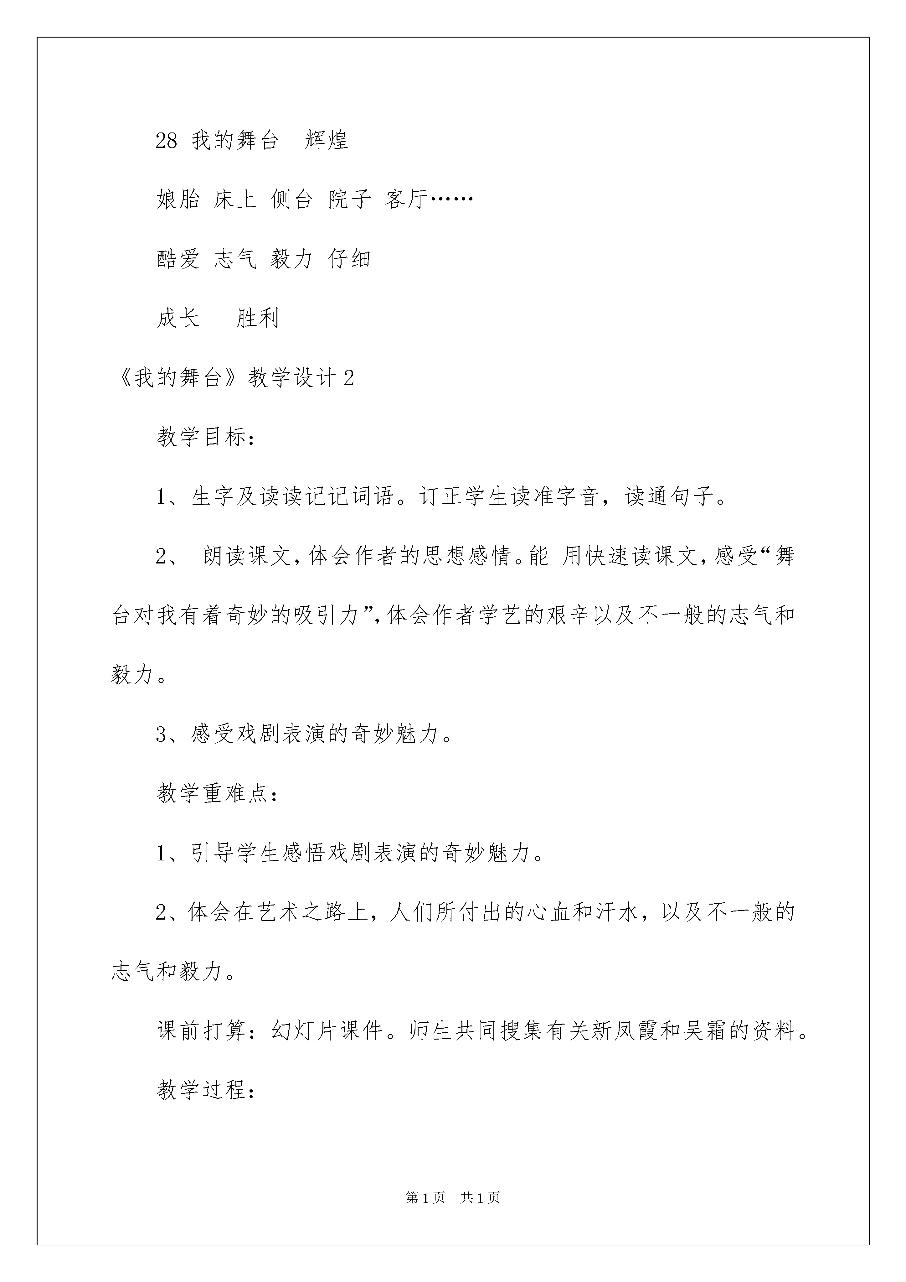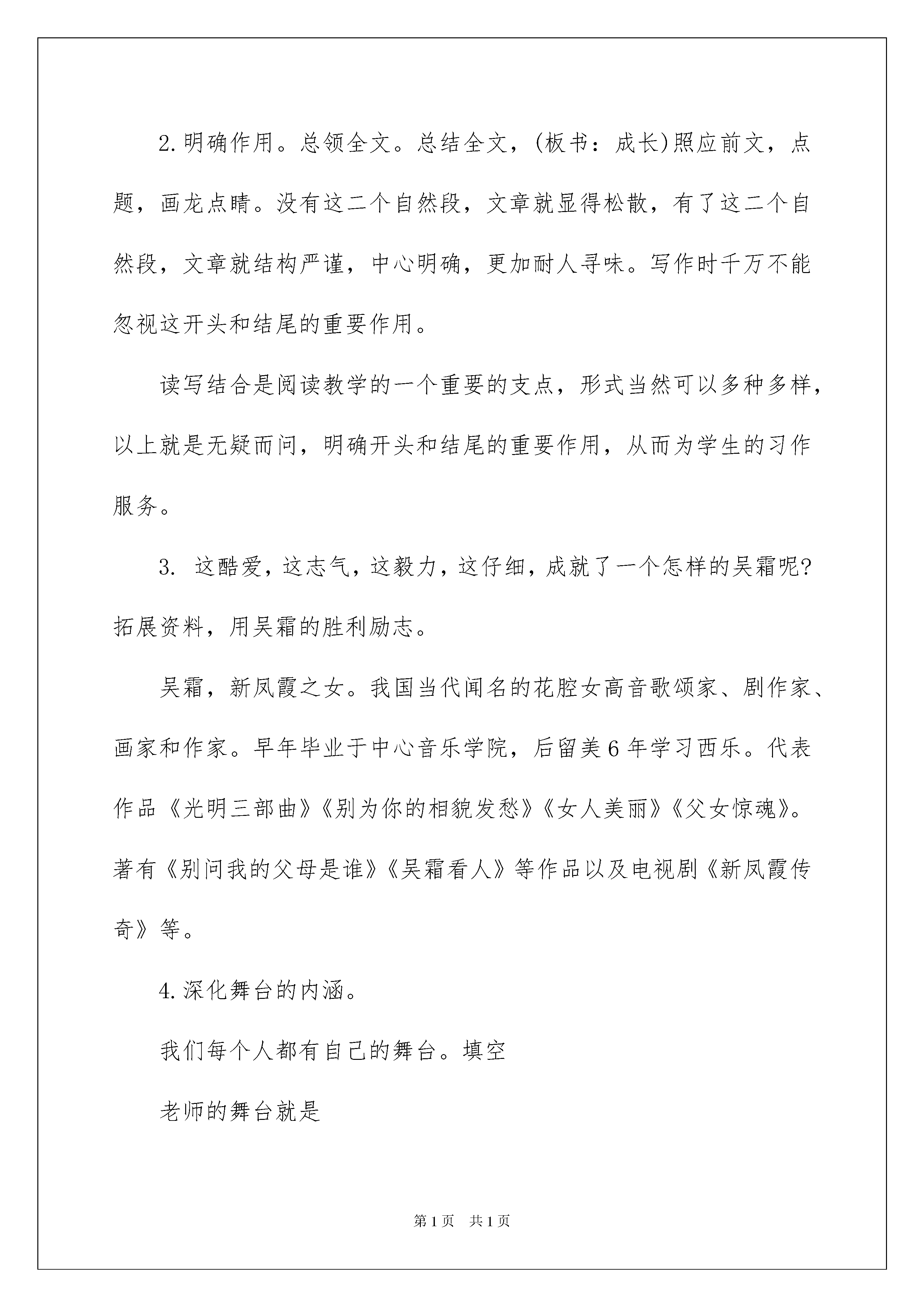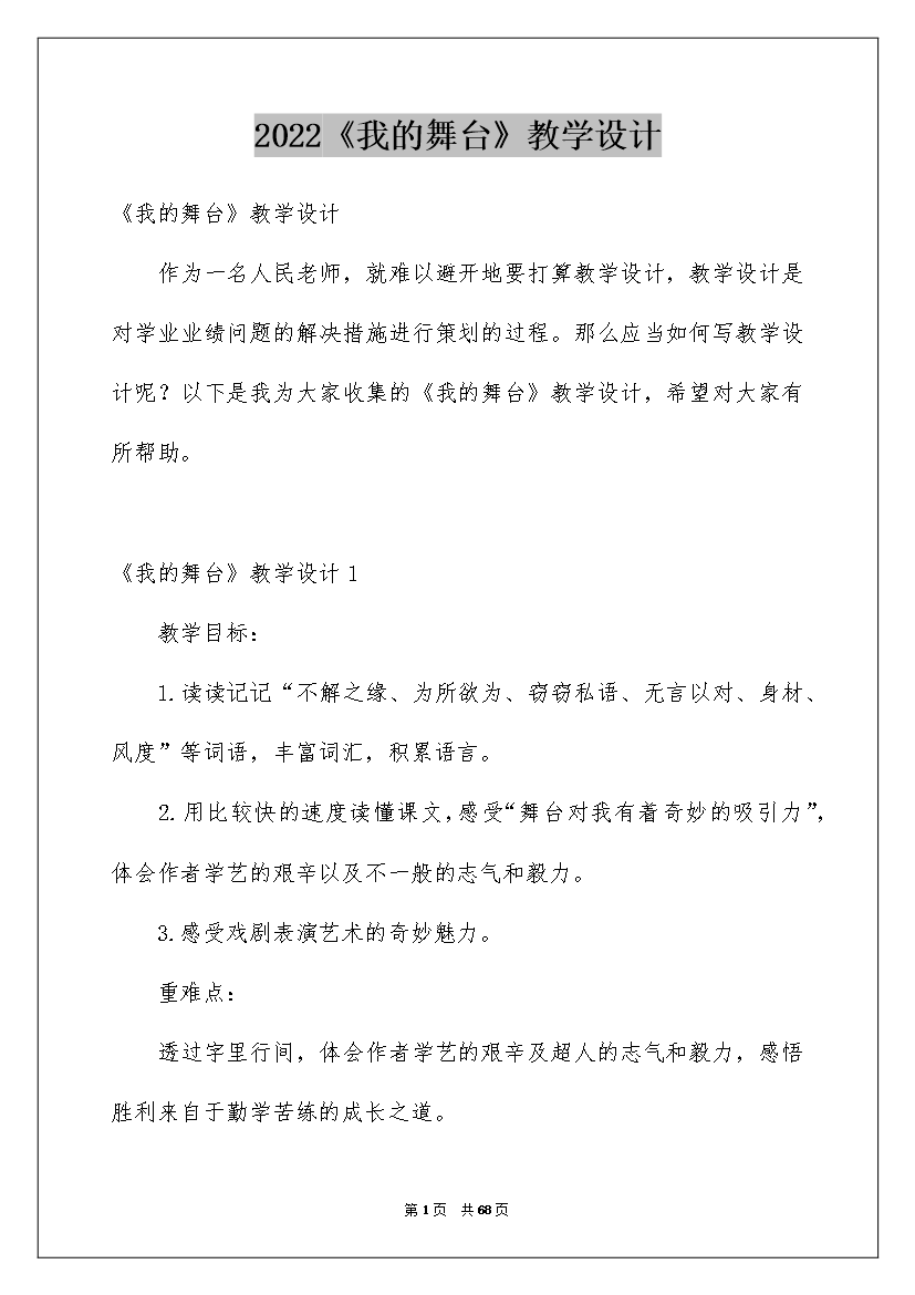 2022《我的舞台》教学设计《我的舞台》教学设计作为一名人民老师,就难以避开地要打算教学设计,教学设计是对学业业绩问题的解决措施进行策划的过程。那么应当如何写教学设计呢?以下是我为大家收集的《我的舞台》教学设计,希望对大家有所帮助。《我的舞台》教学设计1教学目标:1.读读记记“不解之缘、为所欲为、窃窃私语、无言以对、身材、风度”等词语,丰富词汇,积累语言。2.用比较快的速度读懂课文,感受“舞台对我有着奇妙的吸引力”,体会作者学艺的艰辛以及不一般的志气和毅力。3.感受戏剧表演艺术的奇妙魅力。重难点:透过字里行间,体会作者学艺的艰辛及超人的志气和毅力,感悟胜利来自于勤学苦练的成长之道。学具打算:PPT新凤霞、吴霜、评剧等资料。教学时间:一课时教学流程:一、积累词语1.建立舞台语言意象。板书:舞台。提到“舞台”,脑海中出现出哪些词语?自由发言。一行接力。缤纷、绚丽、五花八门、奇妙、辉煌……词语的搭配运用是积累词语的一个传统做法,也是一个很好用的方法,是适合于每个年级的学生的训练方法。因为要丰富舞台的意象,所以此处支配()的舞台的练习。2.出示课题。二、整体感知,直奔重点。1.速读课文,思索:文中的“我”指的是谁?我的舞台分别在哪里?提示运用小标题的方法归纳课文梗概的方法。2.沟通板书。整体感知,理清文章脉络是走进文本深处的基础,方法许多,此处由课题引发,学生学习起来可能会比较顺畅。三、品读课文,习言得意。要求:仔细默读课文,读到吸引自己的地方,就反复回读几遍,有了思索和感受可以用笔记在书上,打算沟通。沟通要点:过渡:我们根据课文的叙述依次,观赏吴霜在不同的舞台之上同样精彩的演出。1.娘胎“大闹天宫”。(幽默风趣的语言,让人忍俊不禁)2.床上惊魂。(A载歌载舞,憨态可掬。B从小喜爱表演。C赶猫下台,惊魂一刻。)以上二处为略学,课文写得明白,所以没必要再挖掘。同时也是体现略读课文的特点。3.侧台学戏。A每场必到。路途远,演出晚,都不怕,体现了一个孩子对戏剧艺术发自内心的酷爱。B选择在侧台看戏。小吴霜在侧台只顾(学母亲演戏的身材,记母亲演戏的戏文,揣摩戏曲中的板眼……)遗忘了(侧台人多声杂,又热又闷,双腿都站麻了,大汗淋漓……)这就叫做“兴味盎然”。说说这个词语的意思,有过“兴味盎然”的体验吗?C播放《花为媒》选段。D让我们“兴味盎然”地再读一读这一段文字。运用“牵一发动全身”的方法,表面在理解兴味盎然,实质是顺藤摸瓜,体会作者酷爱表演艺术的内心。因为第八组课文就是要“感受艺术”的魅力,所以要立足文本,放大课文中提到的评剧艺术,开放语文学习,从而受到艺术的熏陶。4.院子学艺。A黑脸师傅让人过目不忘,因为他是那么(魁梧、严厉、凶神恶煞一般)B严格训练:抓住一系列动作朗读体现学艺之艰辛。C奶奶目不忍视,抹眼泪衬托训练之残酷。D学艺过程中的血与汗、泪与痛,怎一个艰辛了得呀!让我们不由得想到这样的话:台上一分钟,台下十年功。胜利的花,人们只惊慕她现时的明艳,然而当时它的芽儿,浸透了奋斗的泪泉,洒遍了牺牲的血雨。——冰心只要功夫深,铁棒磨成针。吃得苦中苦,方为人上人。永不言弃,百炼成钢。——老师这也是引导学生细读的地方。一是咬文嚼字,从一系列动作的刻画体会学艺的不简单,学艺的艰辛。二是充分发挥朗读的作用,用感情朗读再现情境,使学生能够深切体会学艺之苦。三是进行励志教化,把有感而发作为激活积累的一个手段。5.仔细演戏。A抗议大师窃窃私语。(猜想两位艺术大师可能小声地谈什么?)(莫非他们不懂得敬重演员吗?——兴奋、不由自主)B据理力争。“醇厚做人,仔细演戏。”次重点,请学生变换角色,进行超文本阅读,绽开想象,即兴表达,体会小霜霜的天真和仔细。四、感悟中心。1.齐读第一自然段和最终一自然段。2.明确作用。总领全文。总结全文,(板书:成长)照应前文,点题,画龙点睛。没有这二个自然段,文章就显得松散,有了这二个自然段,文章就结构严谨,中心明确,更加耐人寻味。写作时千万不能忽视这开头和结尾的重要作用。读写结合是阅读教学的一个重要的支点,形式当然可以多种多样,以上就是无疑而问,明确开头和结尾的重要作用,从而为学生的习作服务。3.这酷爱,这志气,这毅力,这仔细,成就了一个怎样的吴霜呢?拓展资料,用吴霜的胜利励志。吴霜,新凤霞之女。我国当代闻名的花腔女高音歌颂家、剧作家、画家和作家。早年毕业于中心音乐学院,后留美6年学习西乐。代表作品《光明三部曲》《别为你的相貌发愁》《女人美丽》《父女惊魂》。著有《别问我的父母是谁》《吴霜看人》等作品以及电视剧《新凤霞传奇》等。4.深化舞台的内涵。我们每个人都有自己的舞台。填空