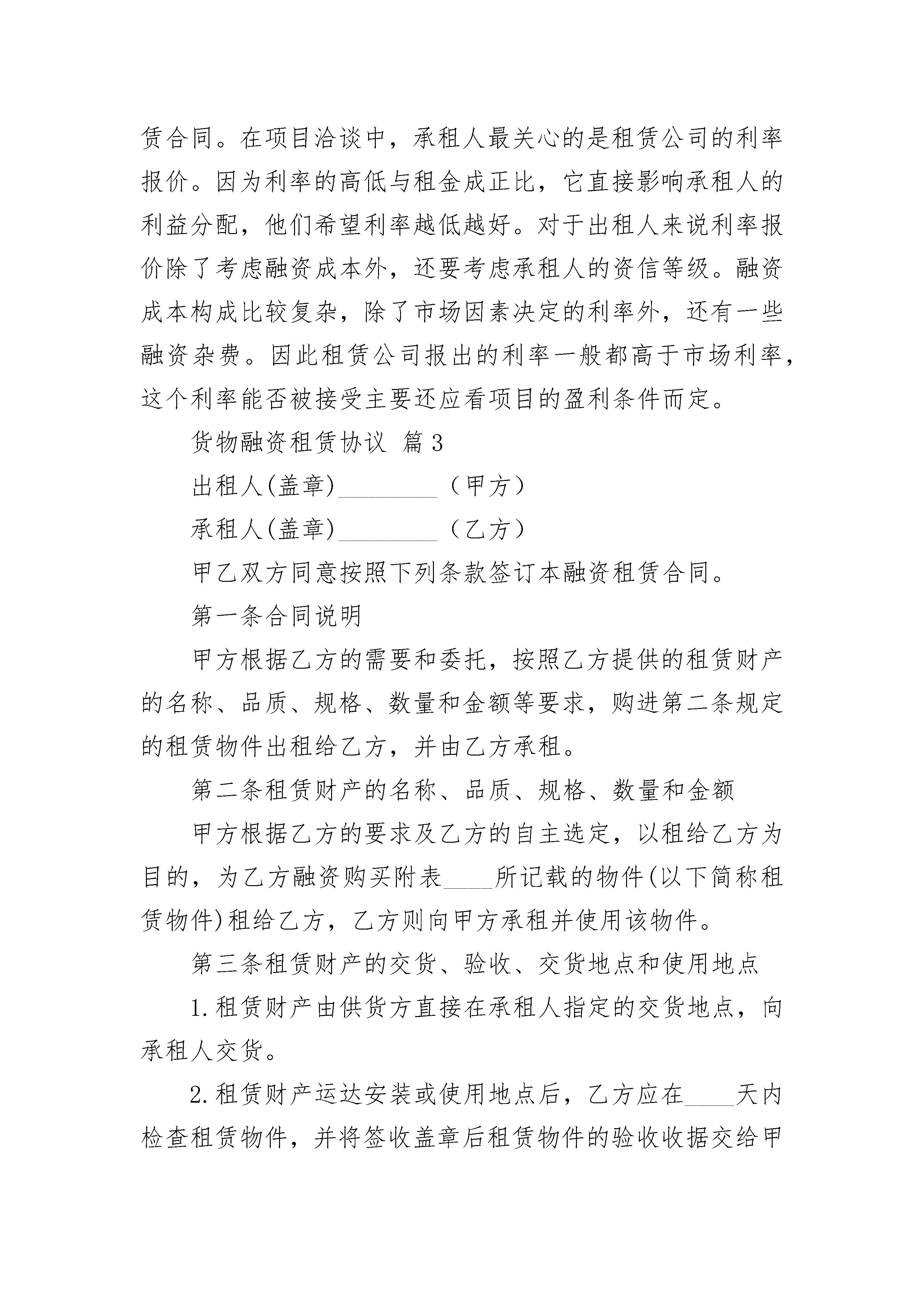 货物融资租赁协议货物融资租赁协议(精选14篇)货物融资租赁协议篇1出租方:______承租方:______甲乙双方同意按照下列条款签订本融资租赁合同。第一条合同说明甲方根据乙方的需要和委托,按照乙方提供的租赁财产的名称、品质、规格、数量和金额等要求,购进第二条规定的租赁物件出租给乙方,并由乙方承租。第二条租赁财产的名称、品质、规格、数量和金额1.财产名称;2.国别;3.规格型号;4.质量标准;5.数量;6.总金额。第三条租赁财产的交货、验收、交货地点和使用地点。1.租赁财产由供货方直接运交承租人的指定