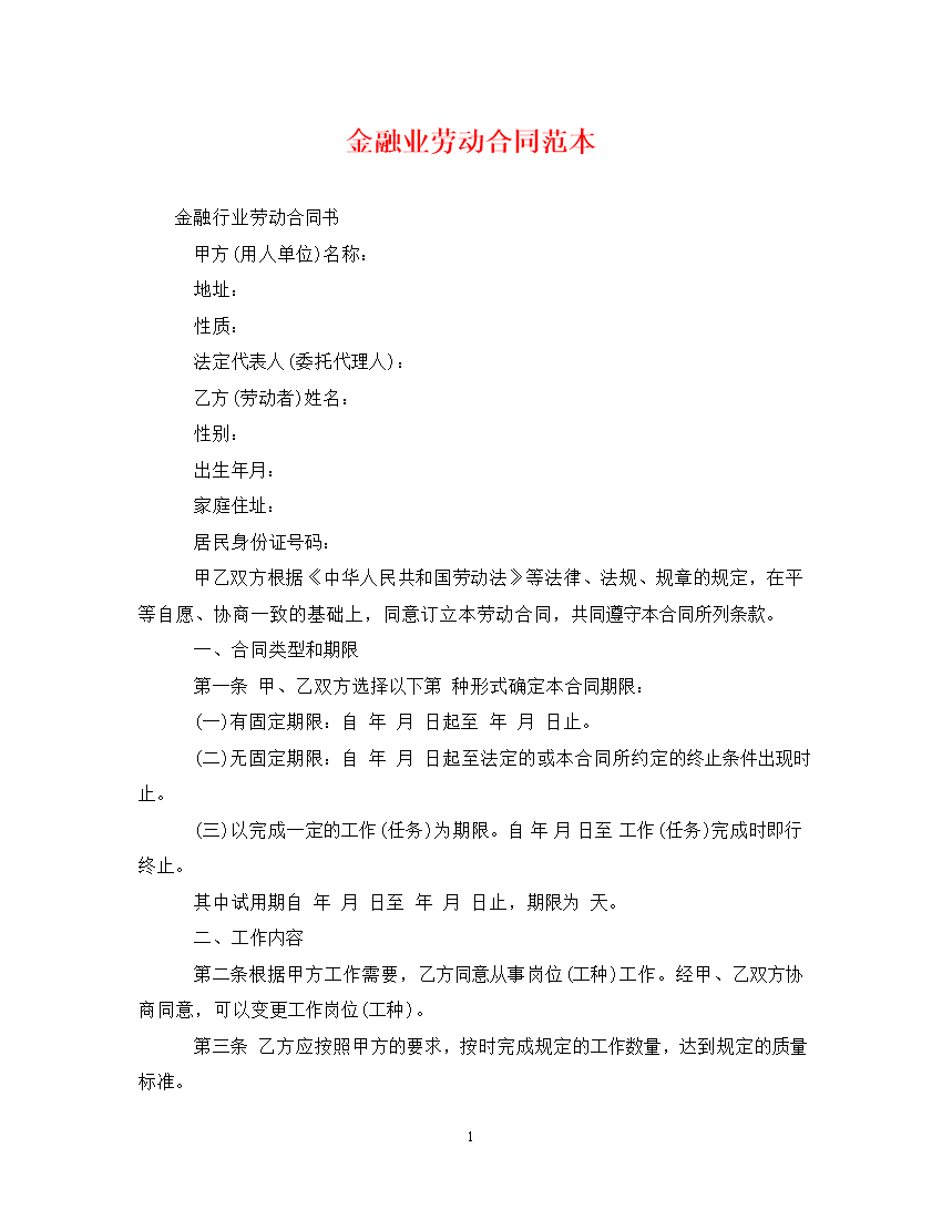 此资料由网络收集而来如有侵权请告知上传者立即删除。资料共分享我们负责传递知识。11金融业劳动合同范本金融行业劳动合同书甲方(用人单位)名称:地址:性质:法定代表人(委托代理人):乙方(劳动者)姓名:性别:出生年月:家庭住址:居民身份证号码:甲乙双方根据《中华人民共和国劳动法》等法律、法规、规章的规定在平等自愿、协商一致的基础上同意订立本劳动合同共同遵守本合同所列条款。一、合同类型和期限第一条甲、乙双方选择以下第种形式确定本合同期限:(一)有固定