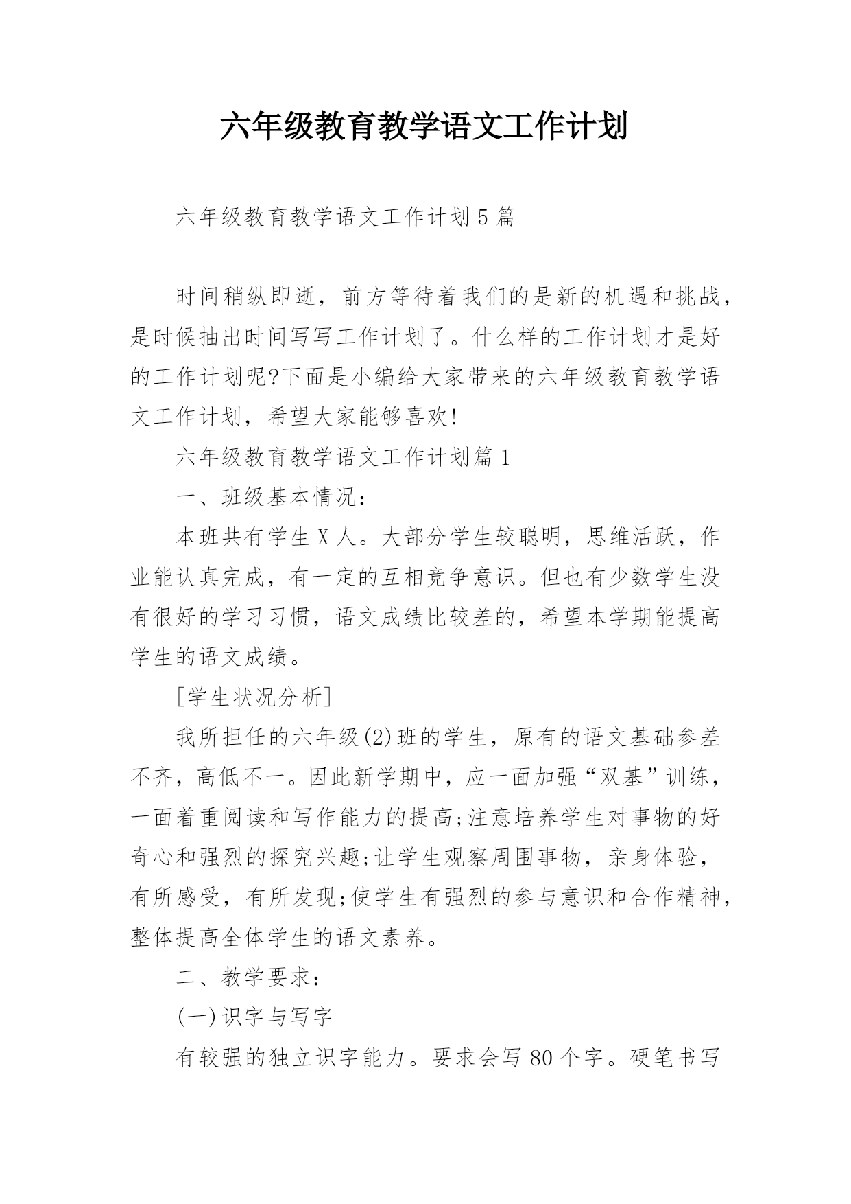 六年级教育教学语文工作计划六年级教育教学语文工作计划5篇时间稍纵即逝,前方等待着我们的是新的机遇和挑战,是时候抽出时间写写工作计划了。什么样的工作计划才是好的工作计划呢?下面是小编给大家带来的六年级教育教学语文工作计划,希望大家能够喜欢!六年级教育教学语文工作计划篇1一、班级基本情况:本班共有学生X人。大部分学生较聪明,思维活跃,作业能认真完成,有一定的互相竞争意识。但也有少数学生没有很好的学习习惯,语文成绩比较差的,希望本学期能提高学生的语文成绩。[学生状况分析]我所担任的六年级(2)班的学生,原有的语