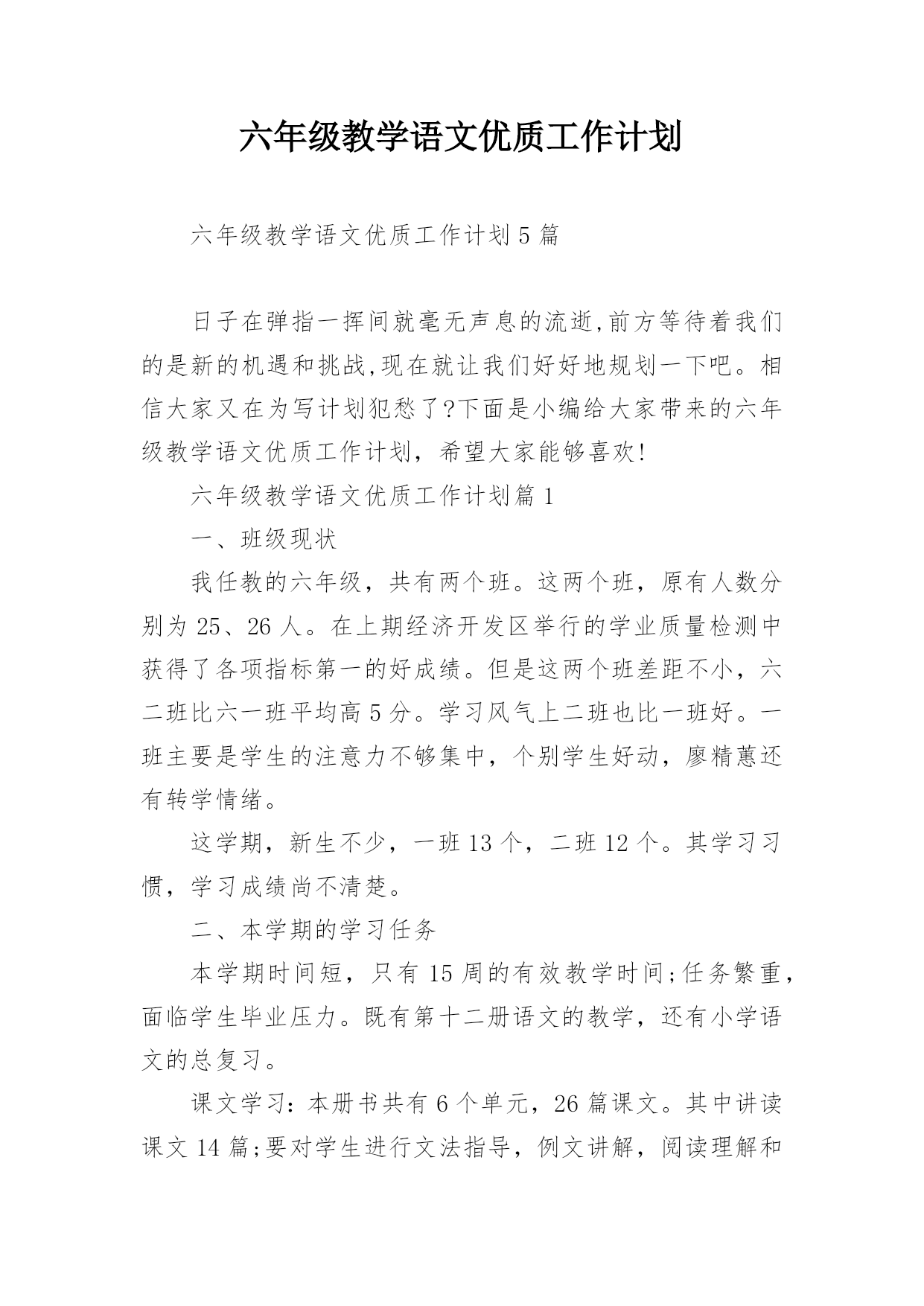 六年级教学语文优质工作计划六年级教学语文优质工作计划5篇日子在弹指一挥间就毫无声息的流逝,前方等待着我们的是新的机遇和挑战,现在就让我们好好地规划一下吧。相信大家又在为写计划犯愁了?下面是小编给大家带来的六年级教学语文优质工作计划,希望大家能够喜欢!六年级教学语文优质工作计划篇1一、班级现状我任教的六年级,共有两个班。这两个班,原有人数分别为25、26人。在上期经济开发区举行的学业质量检测中获得了各项指标第一的好成绩。但是这两个班差距不小,六二班比六一班平均高5分。学习风气上二班也比一班好。一班主要是学生