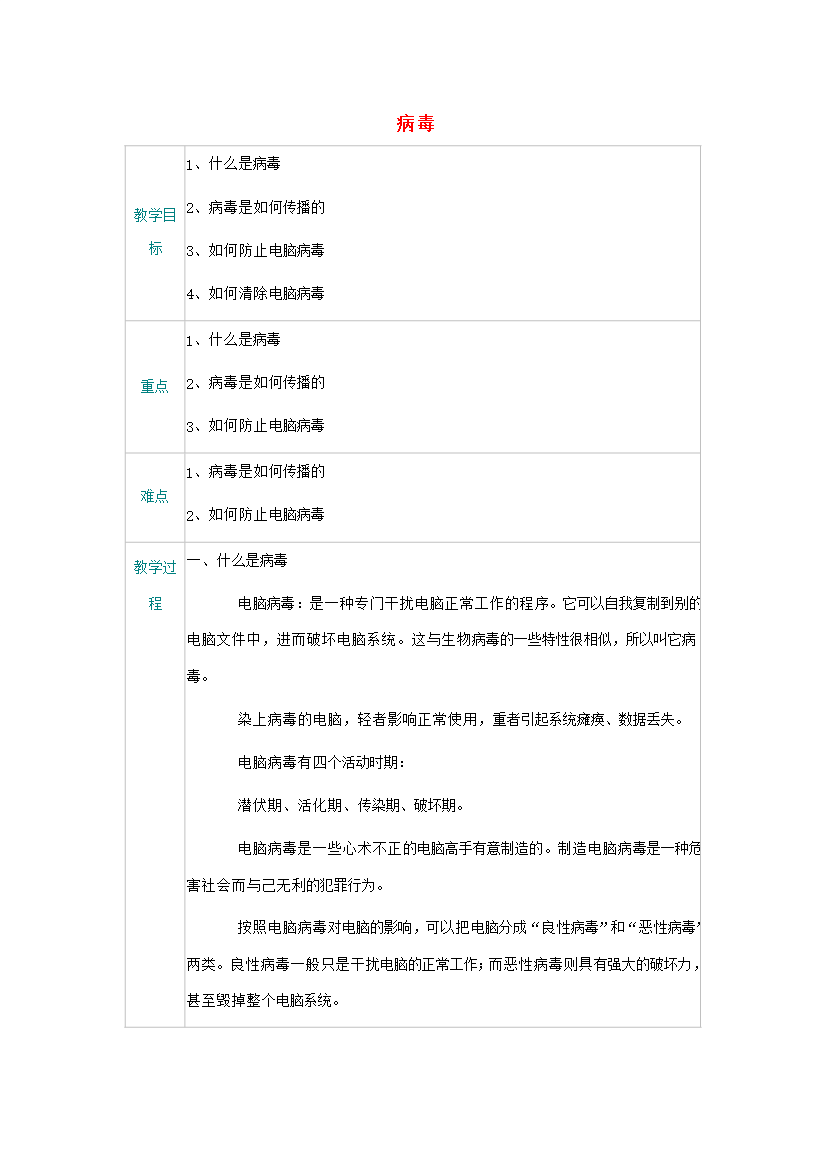 教案-山东-2015_山东省青岛市平度市蓼兰镇何家店中学七年级信息技术上册 病毒教案 新人教版.rar