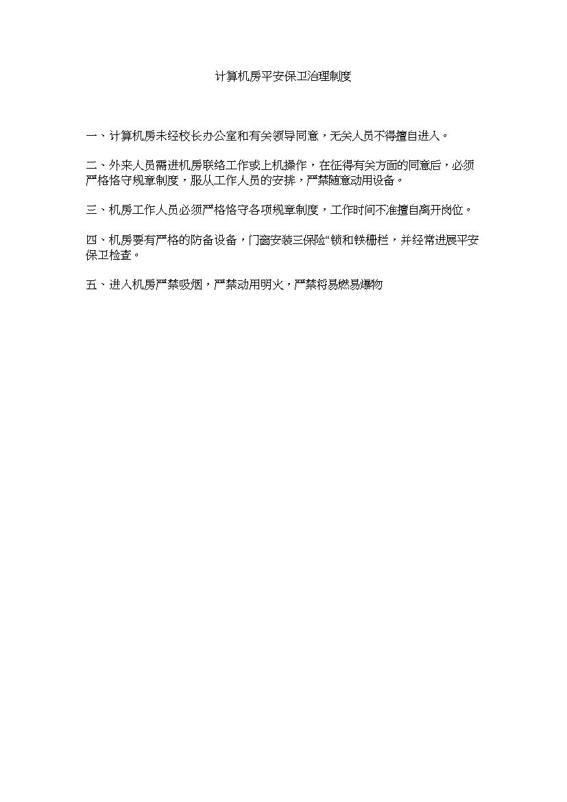 计算机房平安保卫治理制度一、计算机房未经校长办公室和有关领导同意无关人员不得擅自进入。二、外来人员需进机房联络工作或上机操作在征得有关方面的同意后必须严格恪守规章制度服从工作人员的安排严禁随意动用设备。三、机房工作人员必须严格恪守各项规章制度工作时间不准擅自离开岗位。四、机房要有严格的防备设备门窗安装三保险“锁和铁栅栏并经常进展平安保卫检查。五、进入机房严禁吸烟严禁动用明火严禁将易燃易爆物