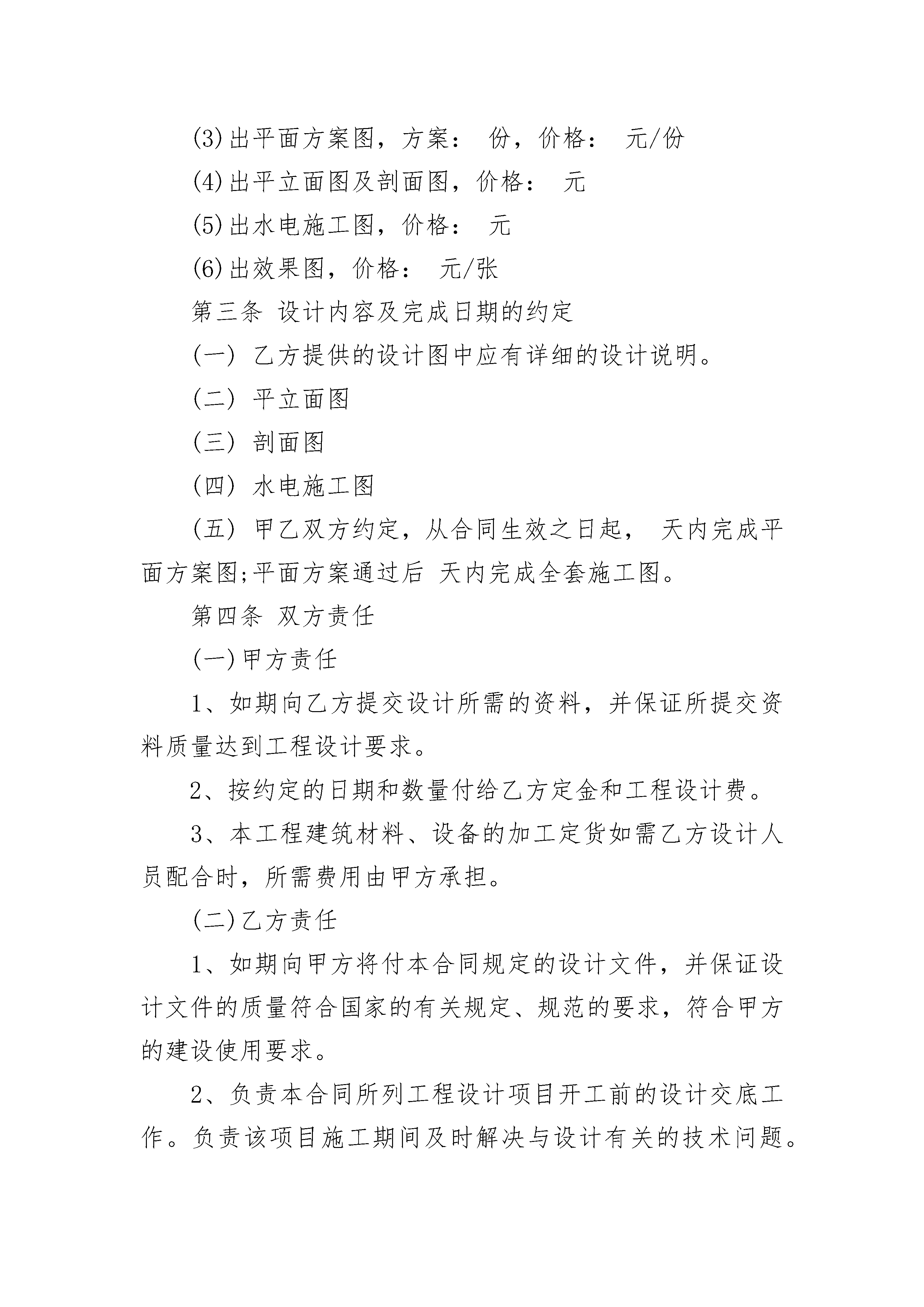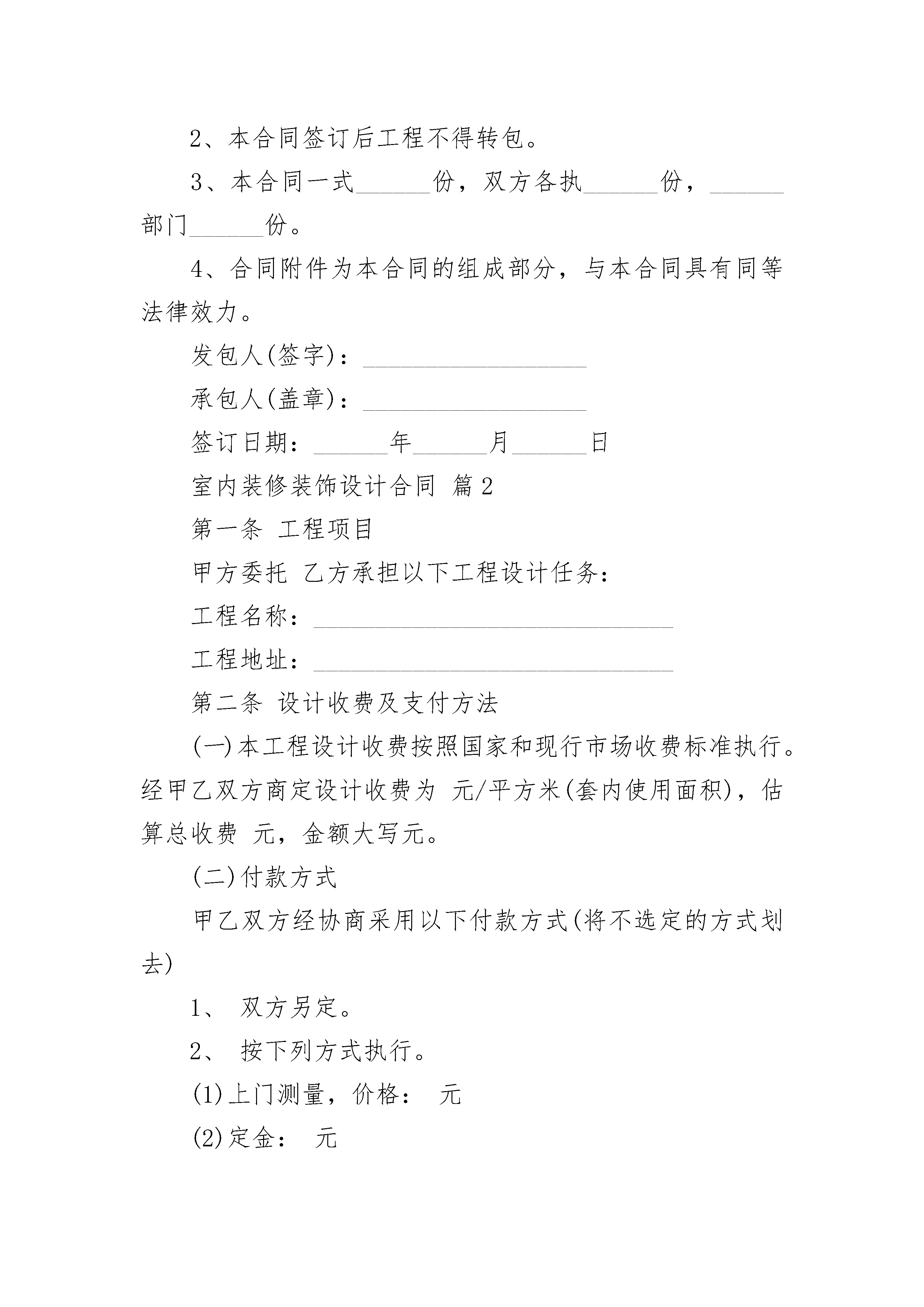 室内装修装饰设计合同在人们越来越相信法律的社会中,合同的地位越来越不容忽视,签订合同也是最有效的法律依据之一。知道吗,写合同可是有方法的哦,以下是小编帮大家整理的室内装修装饰设计合同,希望能够帮助到大家。室内装修装饰设计合同1第一条工程项目甲方委托乙方承担以下工程设计任务:工程名称:_____________________________工程地址:_____________________________第二条设计收费及支付方法(一)本工程设计收费按照国家和现行市场收费标准执行。经甲乙双方商定设计收费为