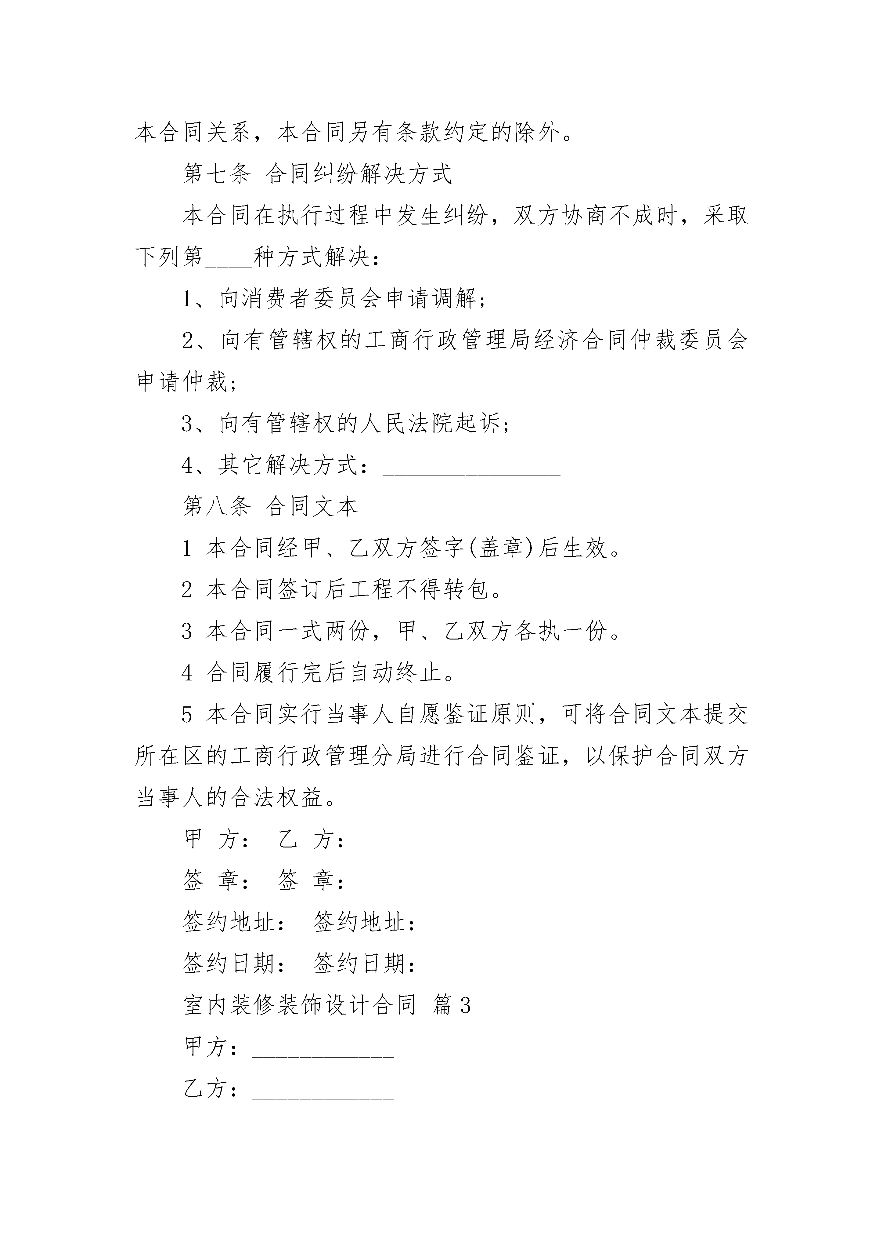 室内装修装饰设计合同室内装修装饰设计合同在人们越来越相信法律的社会中,合同的地位越来越不容忽视,签订合同也是最有效的法律依据之一。知道吗,写合同可是有方法的哦,以下是小编帮大家整理的室内装修装饰设计合同,希望能够帮助到大家。室内装修装饰设计合同1第一条工程项目甲方委托乙方承担以下工程设计任务:工程名称:_____________________________工程地址:_____________________________第二条设计收费及支付方法(一)本工程设计收费按照国家和现行市场收费标准执行。经甲