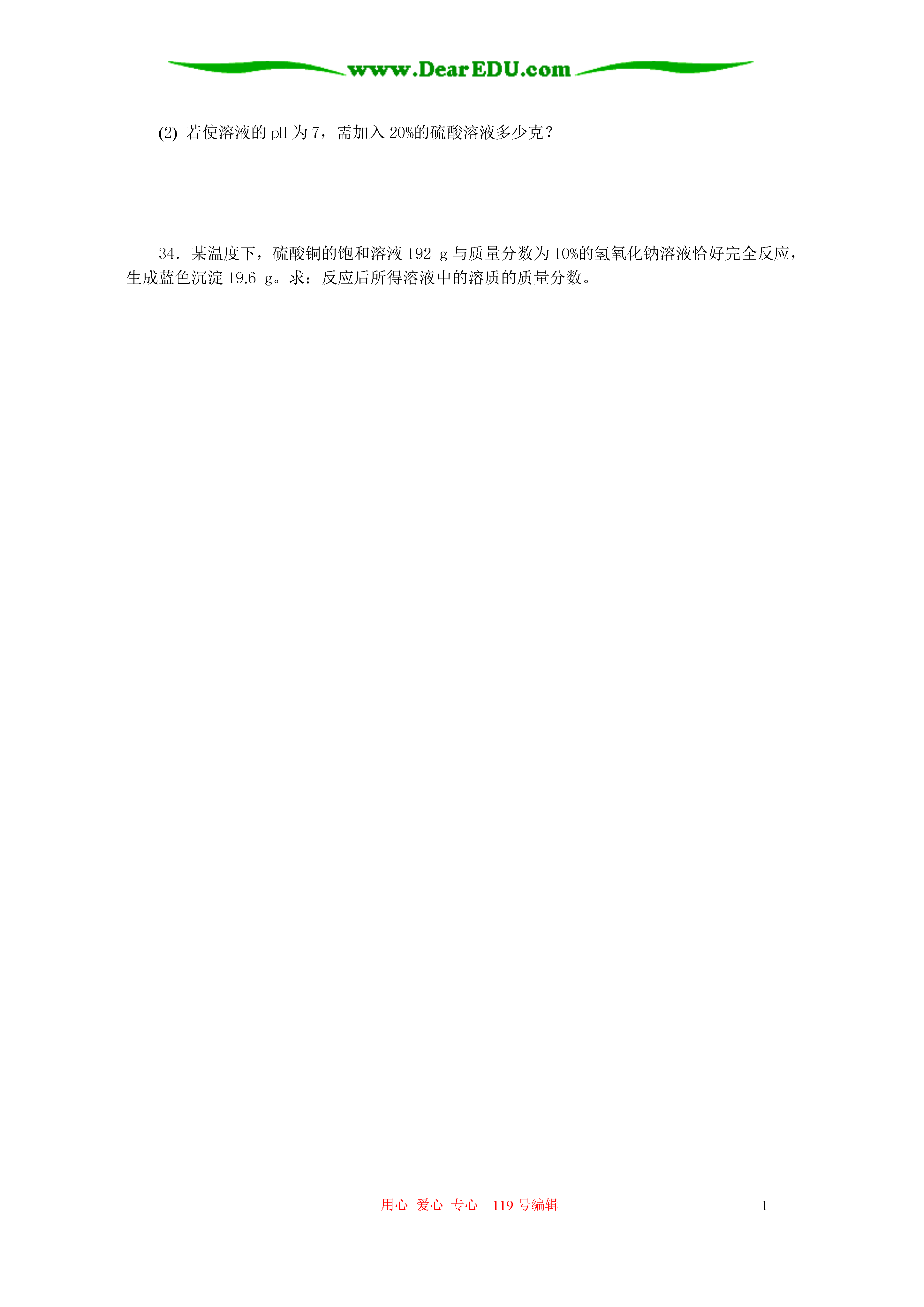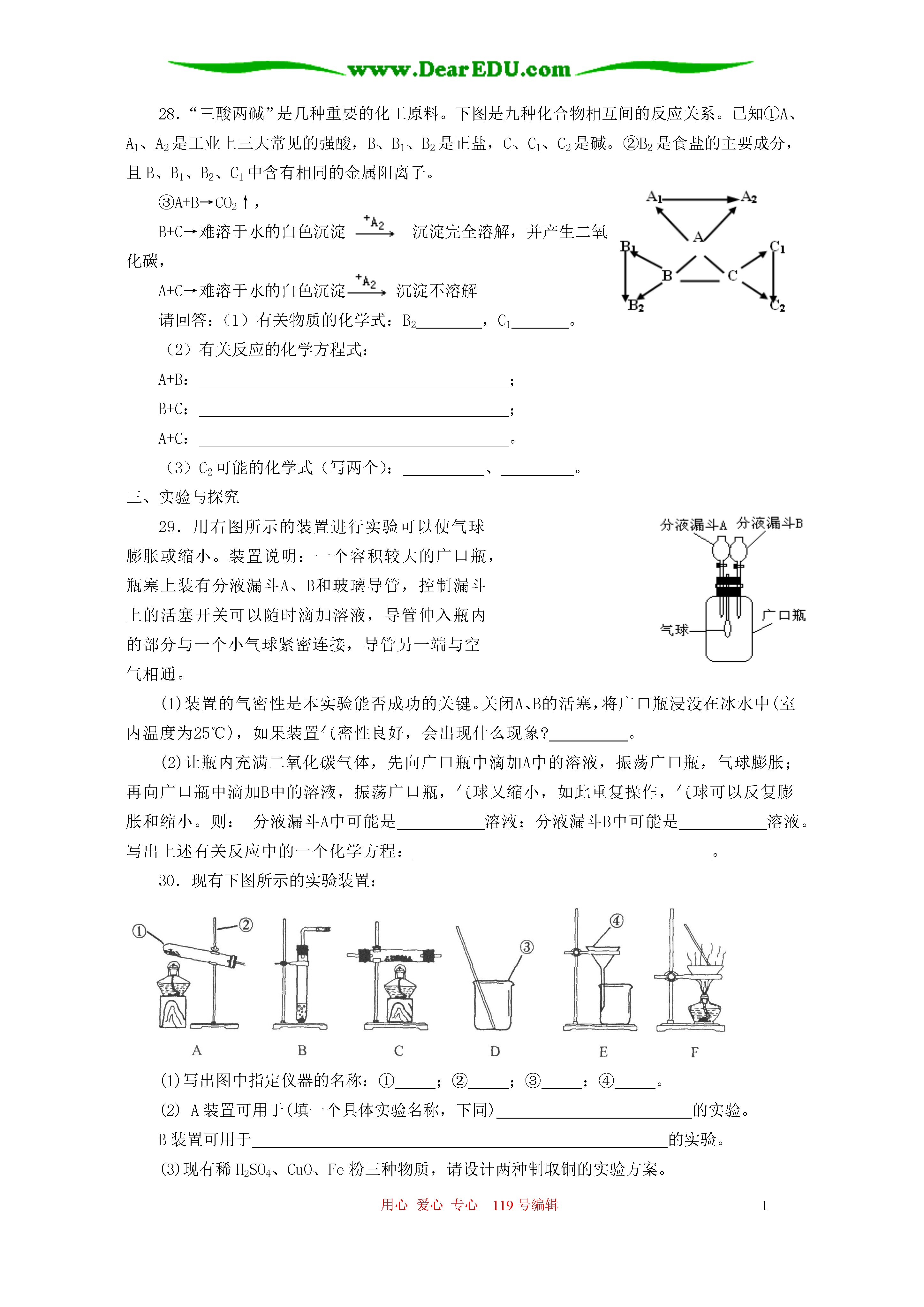 用心爱心专心119号编辑1九年级化学第八章生活中的酸碱盐单元练习一、选择题(每题只有一个选项符合题意,请将你的选项的代号填入题后的括号内。)1.正常雨水与酸雨的差异是()A.正常雨水显中性,酸雨显酸性B.正常雨水的pH约为5.6,酸雨的pH<5.6C.正常雨水不含杂质,酸雨含杂质D.正常雨水降在农村,酸雨降在城市2.中和反应在日常生活和工农业生产中有广泛的应用,下列实例不属于中和反应在生活中的利用的是()A.土壤酸化后加入熟石灰改良B.胃酸分泌过多的病人遵医嘱服用某些含有碱性物质