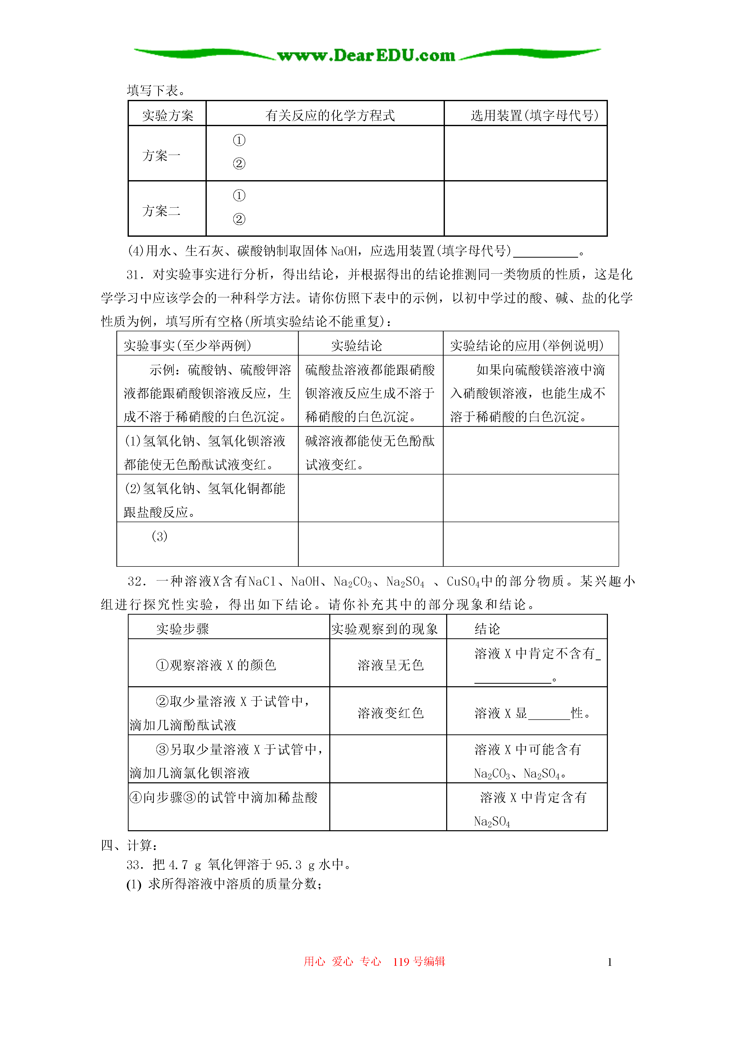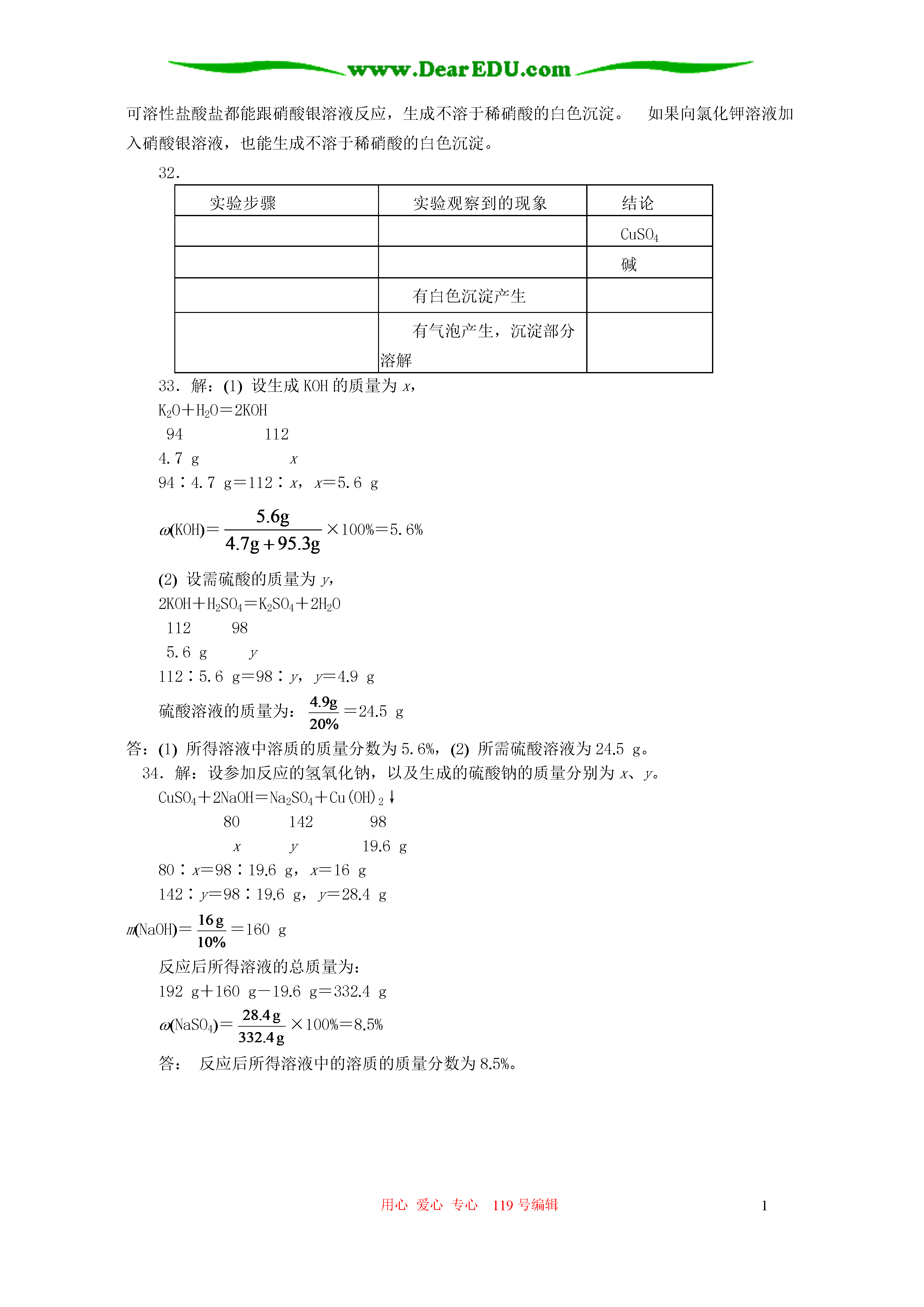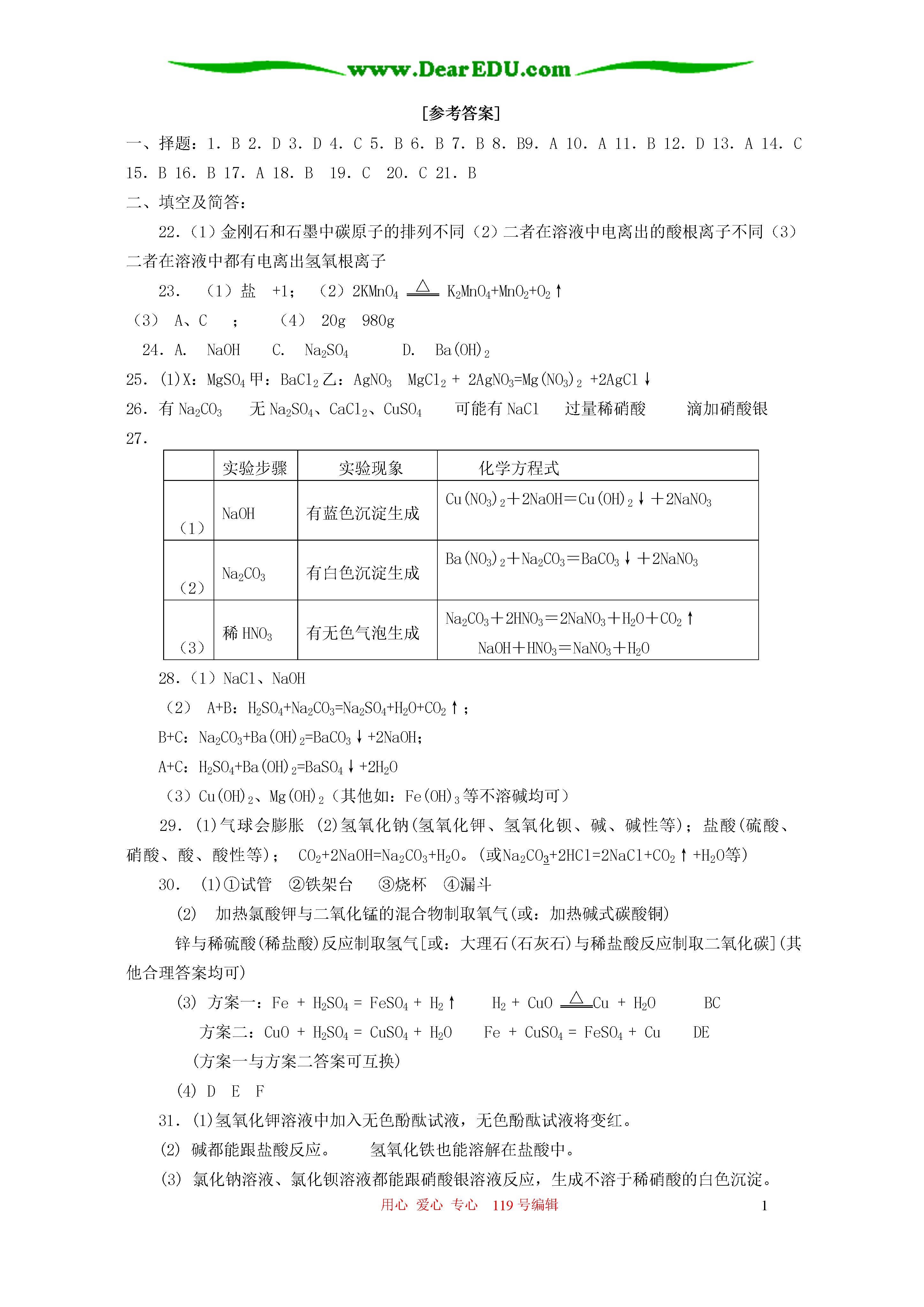 用心爱心专心119号编辑1九年级化学第八章酸碱盐化肥单元测试班级姓名座号成绩可能用到的相对原子质量:Ca=40,C=12,O=16,H=1,Cl=35.5,S=32,N=14,Mg=24,Na=23Ag=108一、选择题(本题有60小题。每小题1.5分,共75分。每小题只有一个正确答案。)1.下列物质溶于水不能产生氯离子的是A.HClB.KClC.KClO3D.MgCl22.下列物质在水溶液中不能导电的是A.硝酸钾B.蔗糖C.硫酸D.氢氧化钠3.下列电离方程式正确的是A.KNO