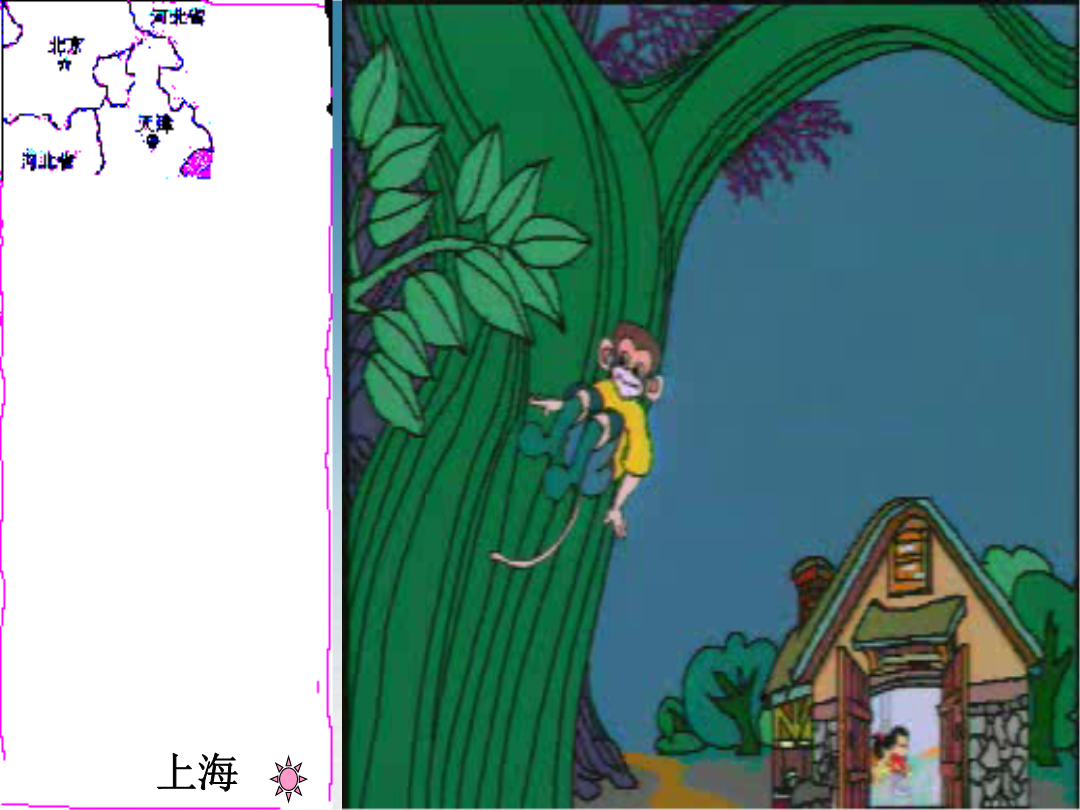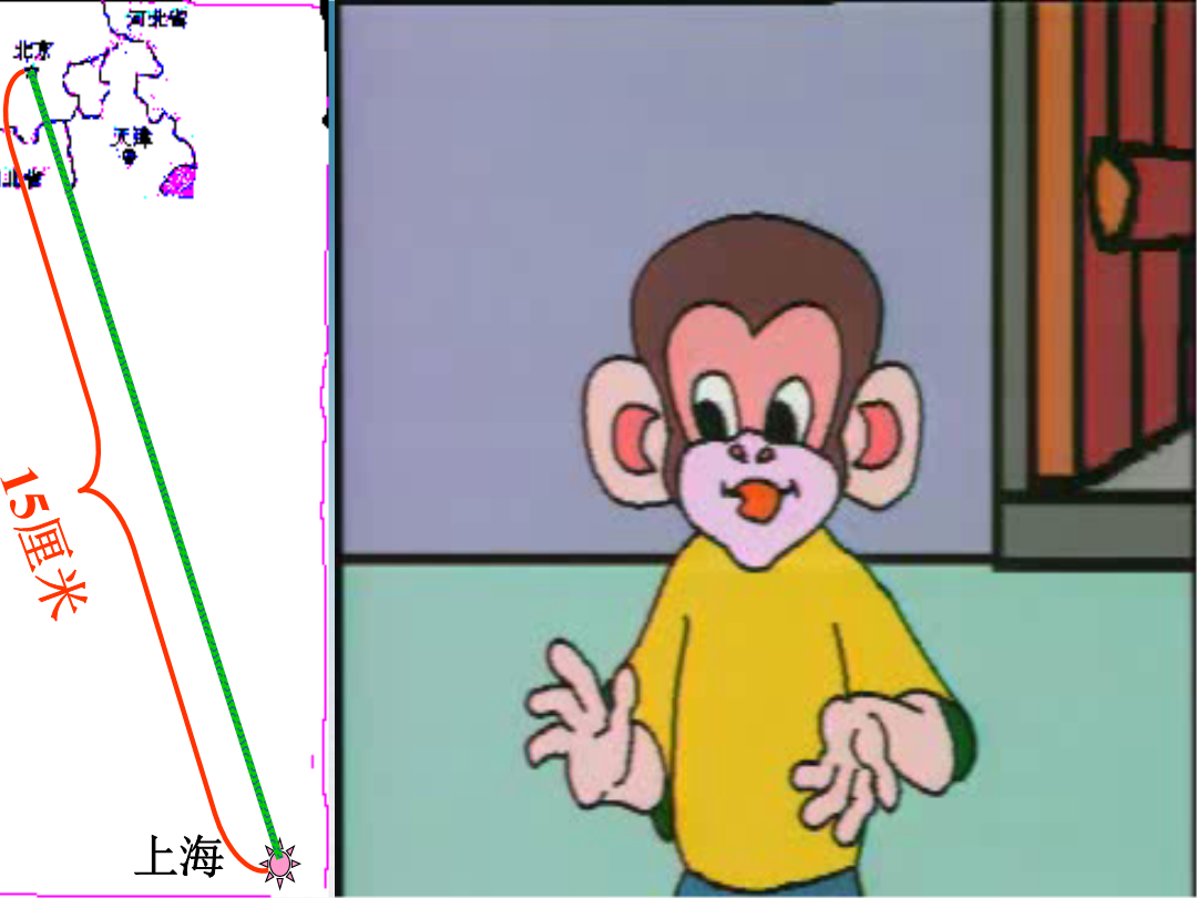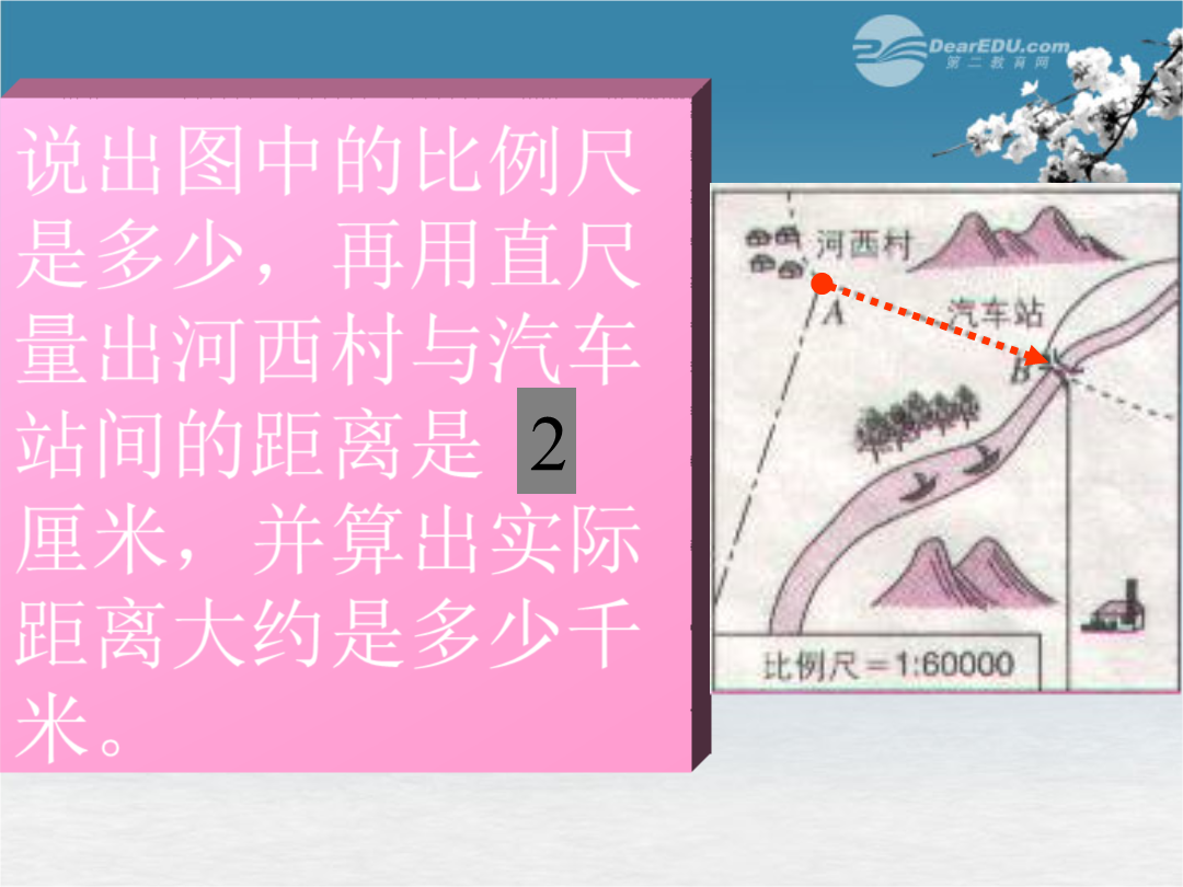 教学目标1千米=()米1.什么叫比例尺?2.怎样求比例尺?比例尺=上海上海说出图中的比例尺是多少,再用直尺量出河西村与汽车站间的距离是厘米,并算出实际距离大约是多少千米。方法一:2×60000=120000(厘米)=1.2(千米)解:设长应画x厘米。110米=11000厘米x=11考考你第一关第二关在一幅1:2000000的地图上,量得甲乙两地的距离是15厘米,这两地的实际距离是多少千米?一列客车和一列慢车同时从两地相对出发,客车每小时行65千米,慢车每小时行多少千米?实践拓展:小组社会实践活动:生活在学