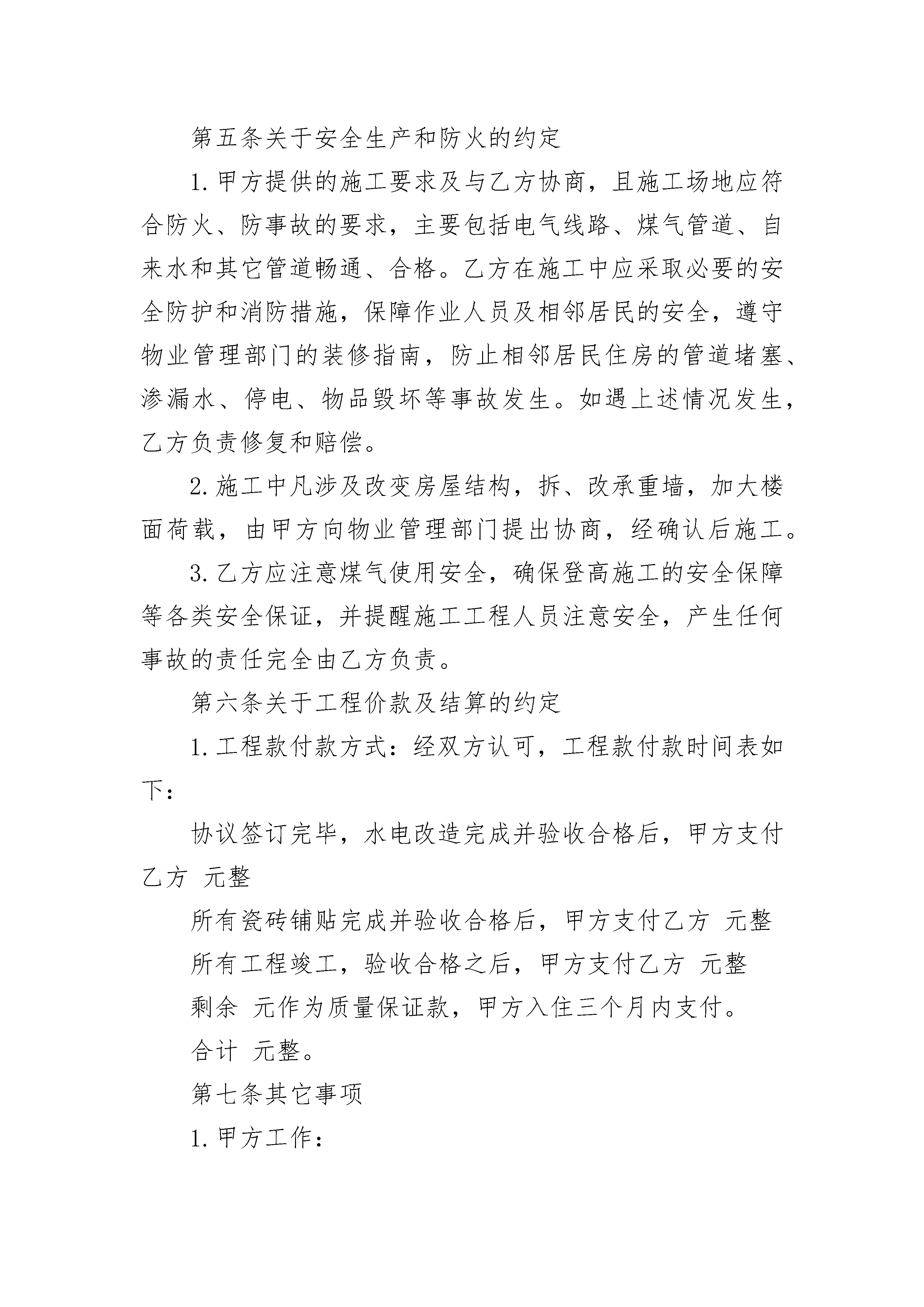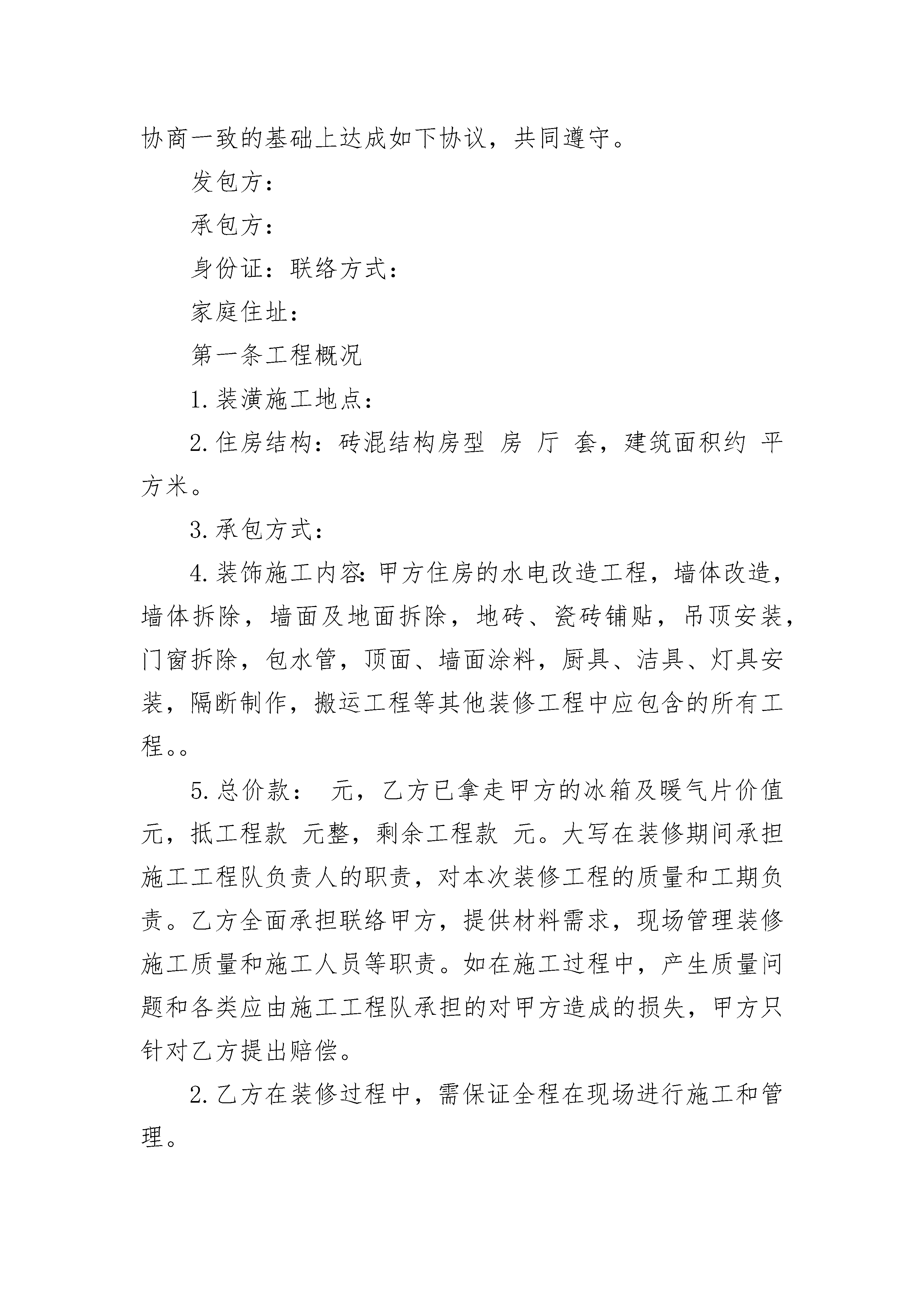 房屋装修包工协议书房屋装修包工协议书(精选3篇)房屋装修包工协议书篇1业主(以下简称甲方):联系电话:施工队(以下简称乙方):联系电话:甲乙双方本着友好合作的态度,按照等相关法律,在平等公正的情况下签定如下合同:一、工程概况工程地址:____________________________________。二、价格清包工费:¥______元,大写:____________整其中水电工______元木工______元瓦工______元油漆工______元垃圾清运费______元三、付款方式1、施工队进场