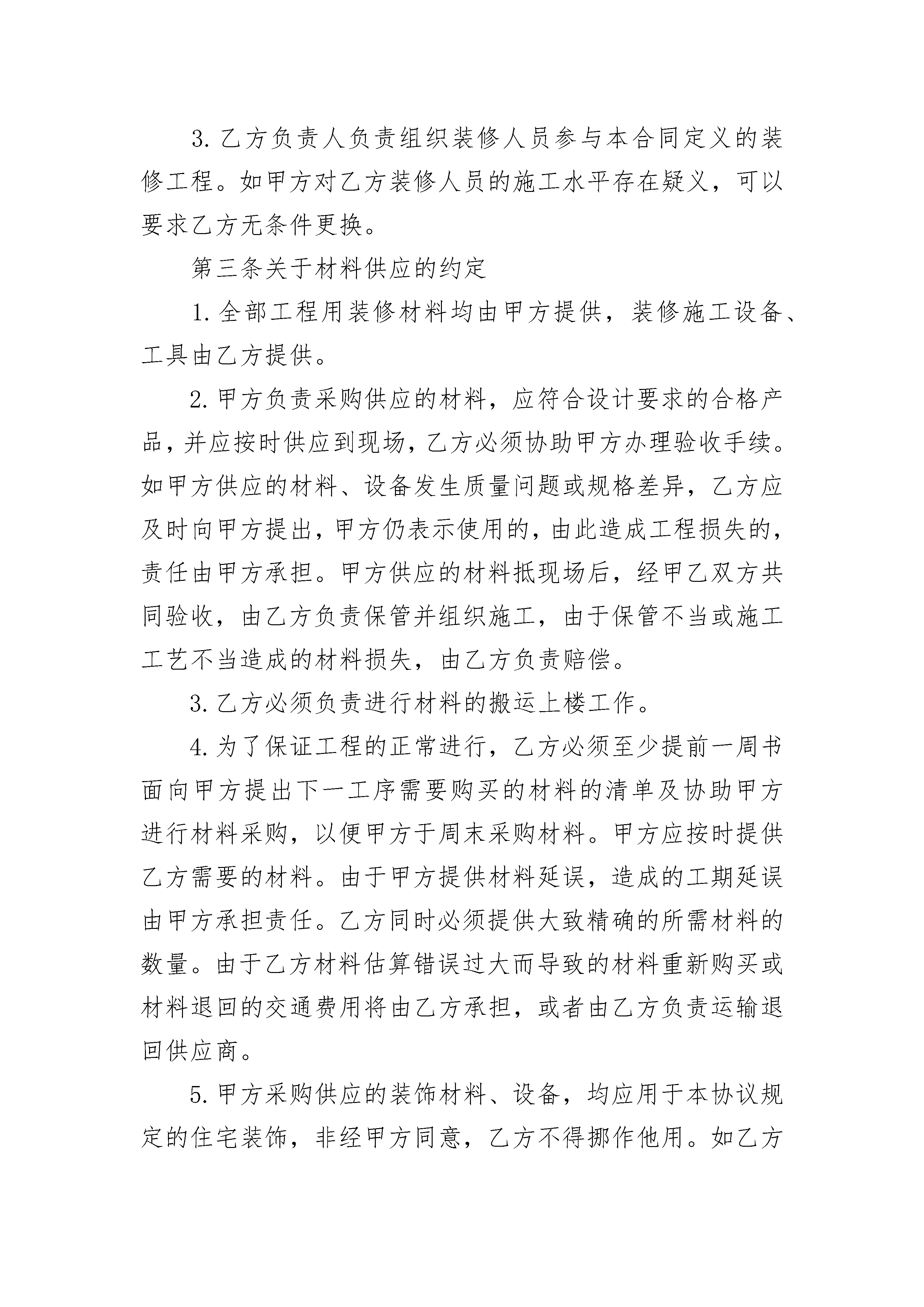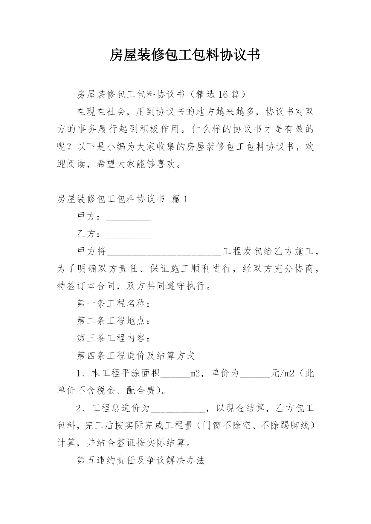房屋装修包工包料协议书房屋装修包工包料协议书(精选16篇)在现在社会,用到协议书的地方越来越多,协议书对双方的事务履行起到积极作用。什么样的协议书才是有效的呢?以下是小编为大家收集的房屋装修包工包料协议书,欢迎阅读,希望大家能够喜欢。房屋装修包工包料协议书篇1甲方:_________乙方:_________甲方将_______________________工程发包给乙方施工,为了明确双方责任、保证施工顺利进行,经双方充分协商,特签订本合同,双方共同遵守执行。第一条工程名称:第二条工程地点:第三条工程内容