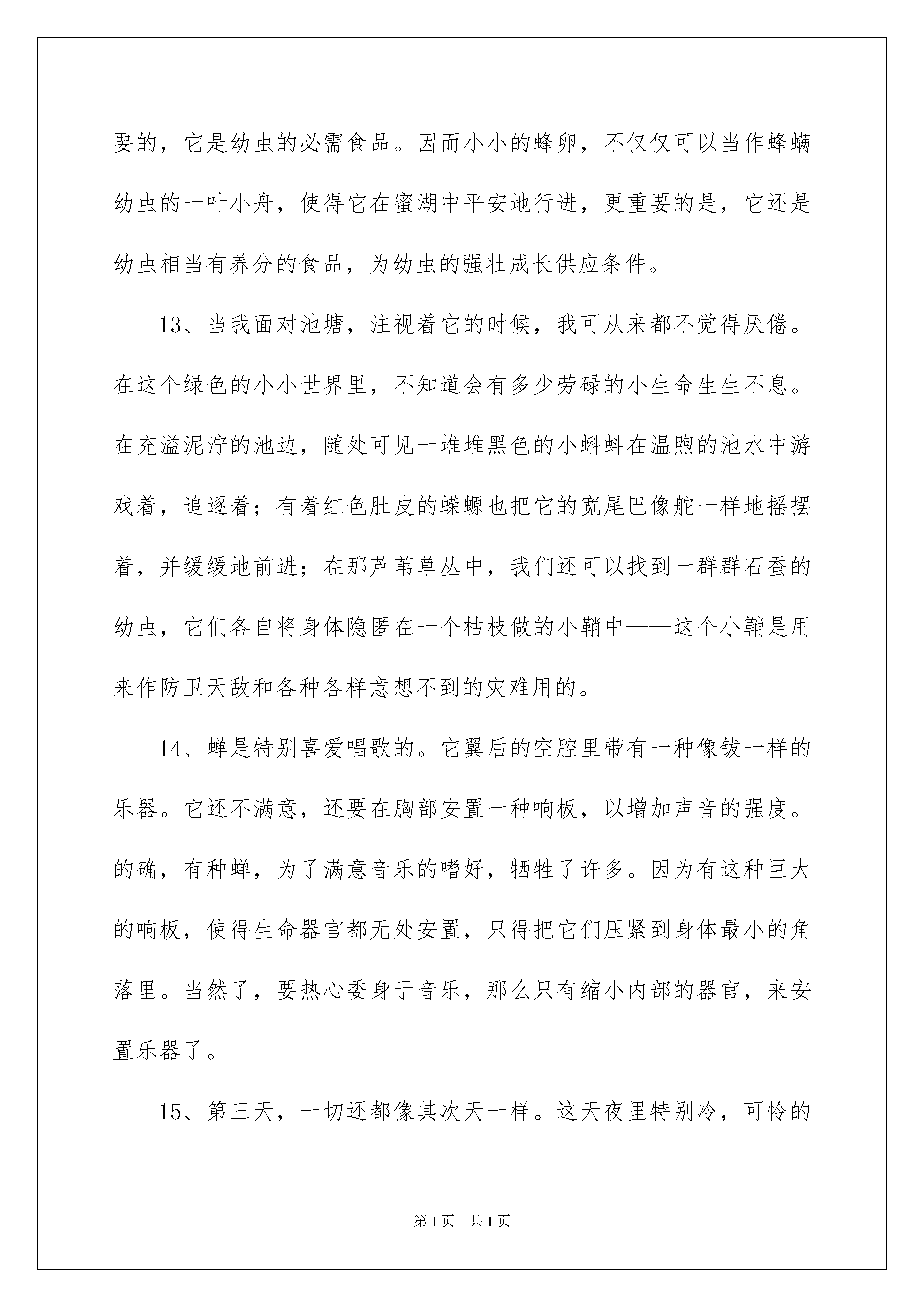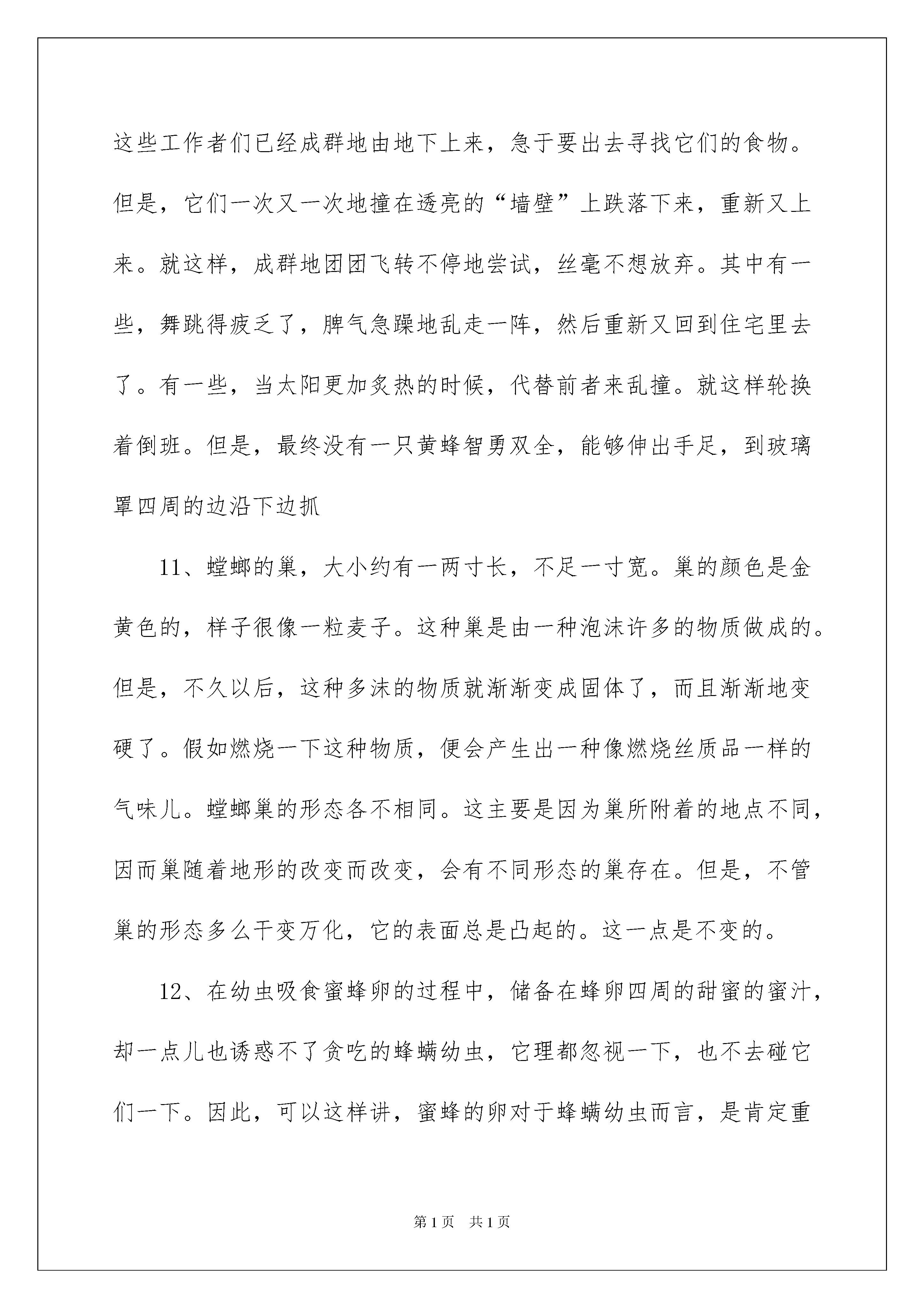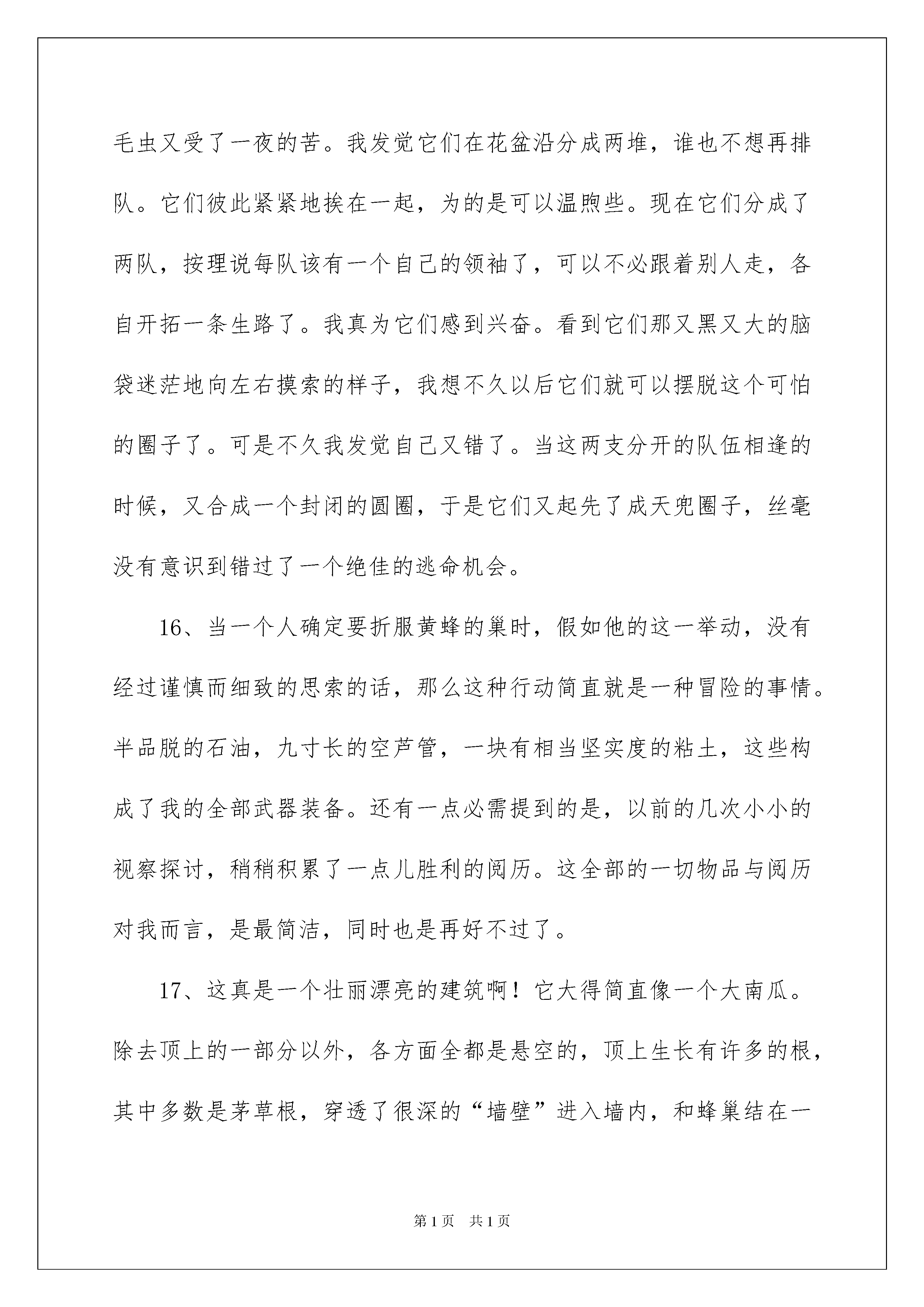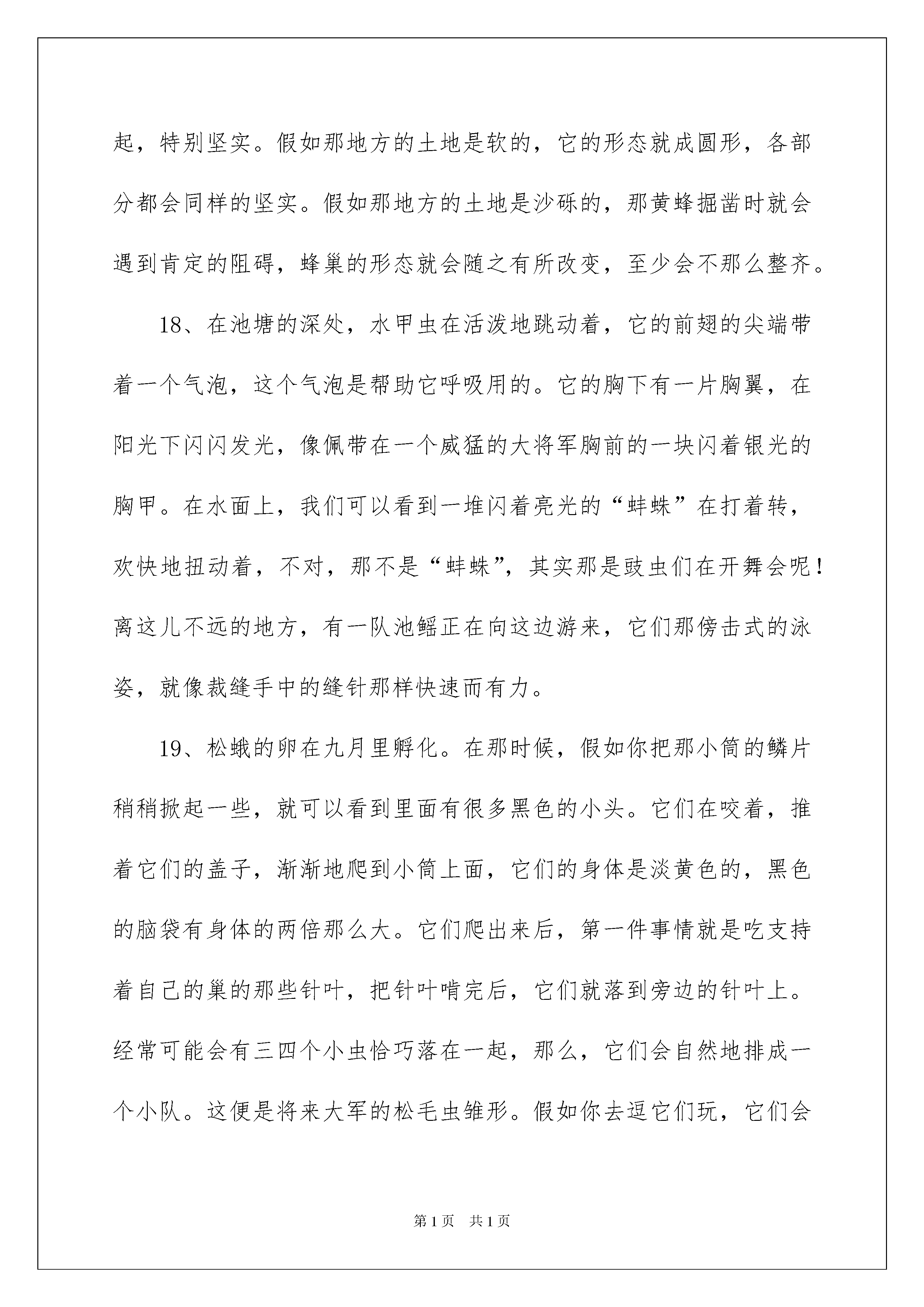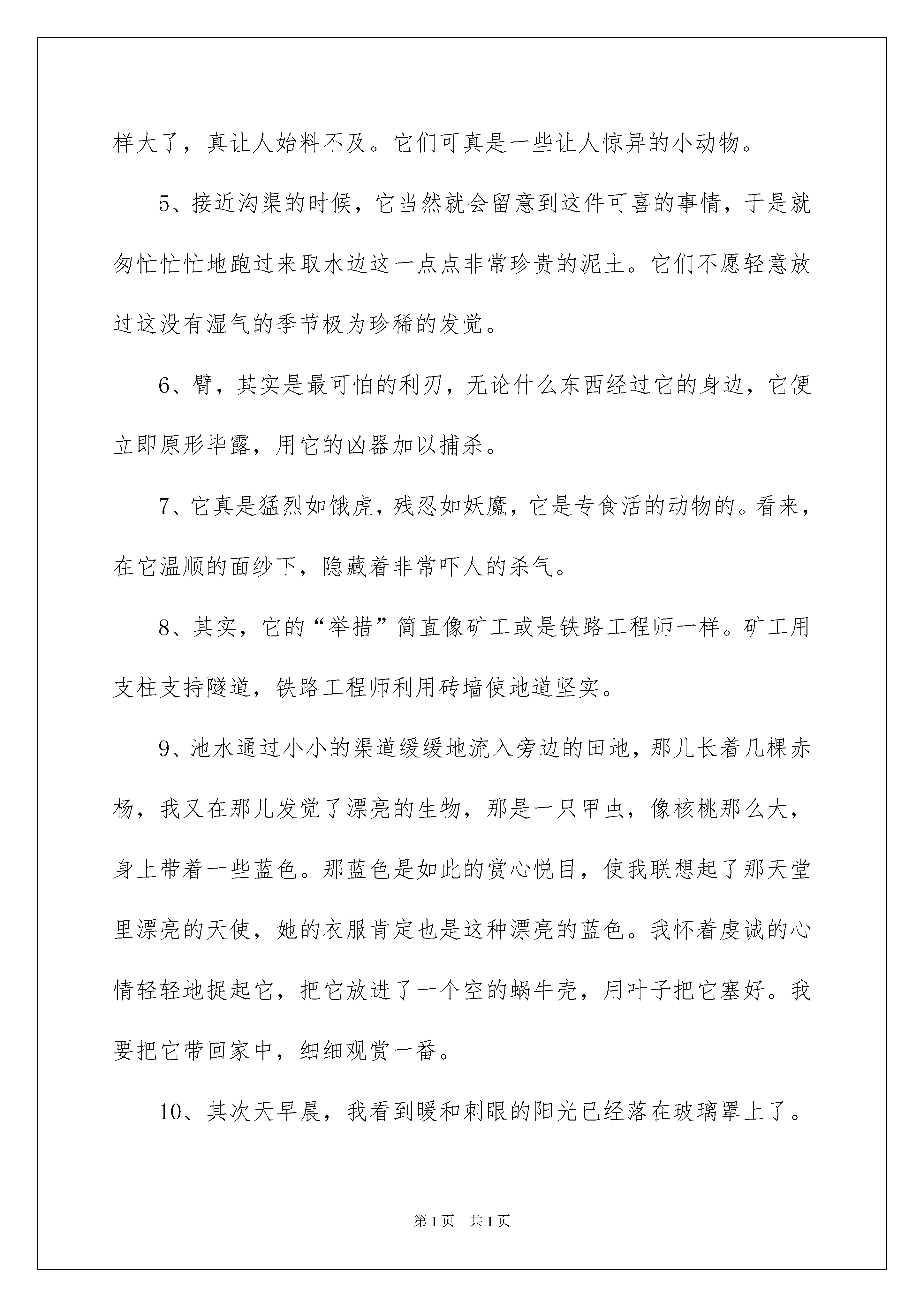 2022《昆虫记》读书笔记《昆虫记》读书笔记当细致品读一部作品后,大家心中肯定是萌生了不少心得,是时候静下心来好好写写读书笔记了。那么我们如何去写读书笔记呢?下面是我为大家整理的《昆虫记》读书笔记,仅供参考,欢迎大家阅读。《昆虫记》读书笔记1法布尔是一位法国闻名的科学家,科普作家。今日,我怀着无比喜悦的心情读法布尔所写的一部著作——《昆虫记》。法布尔是第一位在自然界中探讨昆虫的科学家,他穷其毕生精力深化昆虫世界,在自然环境中对昆虫进行视察与试验,真实地记录下昆虫的本能与习性,写成了《昆虫记》这部昆虫学著作,受到了全世界人民的敬重和爱戴。法布尔刻苦钻研,牺牲了自己私有的时间去视察昆虫。《昆虫记》具体地描绘的昆虫的生活:如蜘蛛、蜜蜂、螳螂、蝎子、蝉、甲虫、蟋蟀,等等。这给后世做出了很大的贡献,使人类社会快速走向了现代文明。法布尔取得如此巨大的成就,并不是简单的。他诞生于农夫家庭,从小生活贫困,靠自学先后取得了多个学位。他前半生一贫如洗,后半生牵强温饱,但法布尔没有像各种困难屈服,他勤于自修,细心选择探讨方向,坚持不懈地进行视察探讨昆虫及植物,不断获得新成果。法布尔一生最大的爱好,尽在于探究生命世界的真面目,发觉自然界蕴含着的科学真理。他正因为酷爱真理所以撰写《昆虫记》。我多么渴望像法布尔那样,到学问的海洋中去遨游,到科学的世界去探究,去解开自然界中一个又一个奇妙,为人类造福啊!然而同法布尔相比,我真感到惭愧万分。法布尔能在困苦的环境下探讨昆虫,平常我连做数学题都不仔细,不刻苦,一边做不出来,就不想动脑筋,有时还乱发脾气法布尔对昆虫有着深厚的爱好,因此它的《昆虫记》也让我在读时仿佛自己就是一只在旁边的昆虫。每一只昆虫都有人一样的情感。如:已经慌了神的蝗虫,完全把‘三十六计走为上计’这一招忘到脑后去了。”在读《昆虫记》时,我甚至能想象昆虫在活动的画面,眼前不再是枯燥的文字,而是神奇的大自然。蝉在歌颂,蟋蟀在管理家务,蜘蛛再捕获食物……《昆虫记》让我感觉到神奇的自然中也有这么好玩的事物,我对大自然的敬意油然而生,他也有细心的一面。法布尔在探究大自然的过程中肯定与答案很大的困难,但是再大的困难也没有拦住他探究的道路,我叹服法布尔为探究大自然付出的精神,让我感受到了昆虫与环境休戚相关,有让我感受到了作者的独具匠心和微小的视察。《昆虫记》不仅仅浸溢这对生命的敬畏之情,更蕴含着某种精神。那种精神就是求真,即追求真理,探求真相。这就是法布尔的精神。一次试验失败了,他把收集的数据,分析缘由,转身又设计下一次。严谨的试验方法,大胆的质疑精神,勤勉的作风。这一次,我感觉到了科学精神及其博大精深的内涵。《昆虫记》读书笔记2翻开这本《昆虫记》,走进另一个奇妙的昆虫世界。我望见了蜘蛛在织网,蟋蟀在建房,蝗虫在与螳螂打架,一个个新颖而不行思议的故事,在这个世界里不断的发生。这本科学与文学完备结合的《昆虫记》,时常提诞生命的深度思索,更带我们领会了昆虫世界的奇光异彩。作者法布尔一家人在一块不毛之地上安家立业,这个不起眼的地方却是昆虫们最宠爱的地方。他每天不知疲乏地视察探讨昆虫与昆虫,作者在长期的视察和探讨中,最终完成了他视察技术的成果。这本书不同于一般的刻板写作,更多融入了自己的真情实感与亲身感受。在这本书的字里行间里不断写出大自然的变化无穷,同时也让我们意识到人类破坏大自然,会毁灭他们的家园。而动物也是美妙家园的一分子,须要我们去呵护和关爱。在发生在昆虫世界的一个个故事里,作者运用了很多的修辞手法,更加生动丰富地呈现了昆虫们的风采。它们仿佛被给予了活力,好像过着人类的生活。作者又添加了自己的一些心理与动作,让读者沉醉在生动活泼,诙谐好玩的昆虫世界中。在书中螳螂是一种非常凶残的动物,然而在它生命的初期,也会牺牲在小个头蚂蚁的魔爪下。蜘蛛织网,即使我们人类运用圆规之类的工具,也不能设计出一个比蜘蛛织的更规范的网来。书中丰富的故事情节,生动的语言描写更是令人们浮想联翩。同时,作者也借这些昆虫告知我们很多生活哲理。例如蟋蟀,他们喜爱独立建起家园,是因为他们的勤奋靠的是自己的毅力坚持;而当螳螂面对蝗虫,它们矗立不倒,是因为他们自身有着一颗强大的内心;悬崖下有着许多的球形燕巢,他们不惧风雨,是因为他们有强大的生命力。每一个生活在这个世界的昆虫们,他们可爱又奇妙,同样努力的生活着。《昆虫记》这本书就似乎一袭生命的盛宴,它是一本蕴涵着丰富学问的科学宝典,更带给我们很多生命的思索以及精神的鼓舞。当天色暗下,这个奇妙的世界又将挂着一盏盏明灯,蝉将唱起歌谣,美妙的昆虫世界又将发生新的故事。《昆虫记》读书笔记31、它会表演一种惊