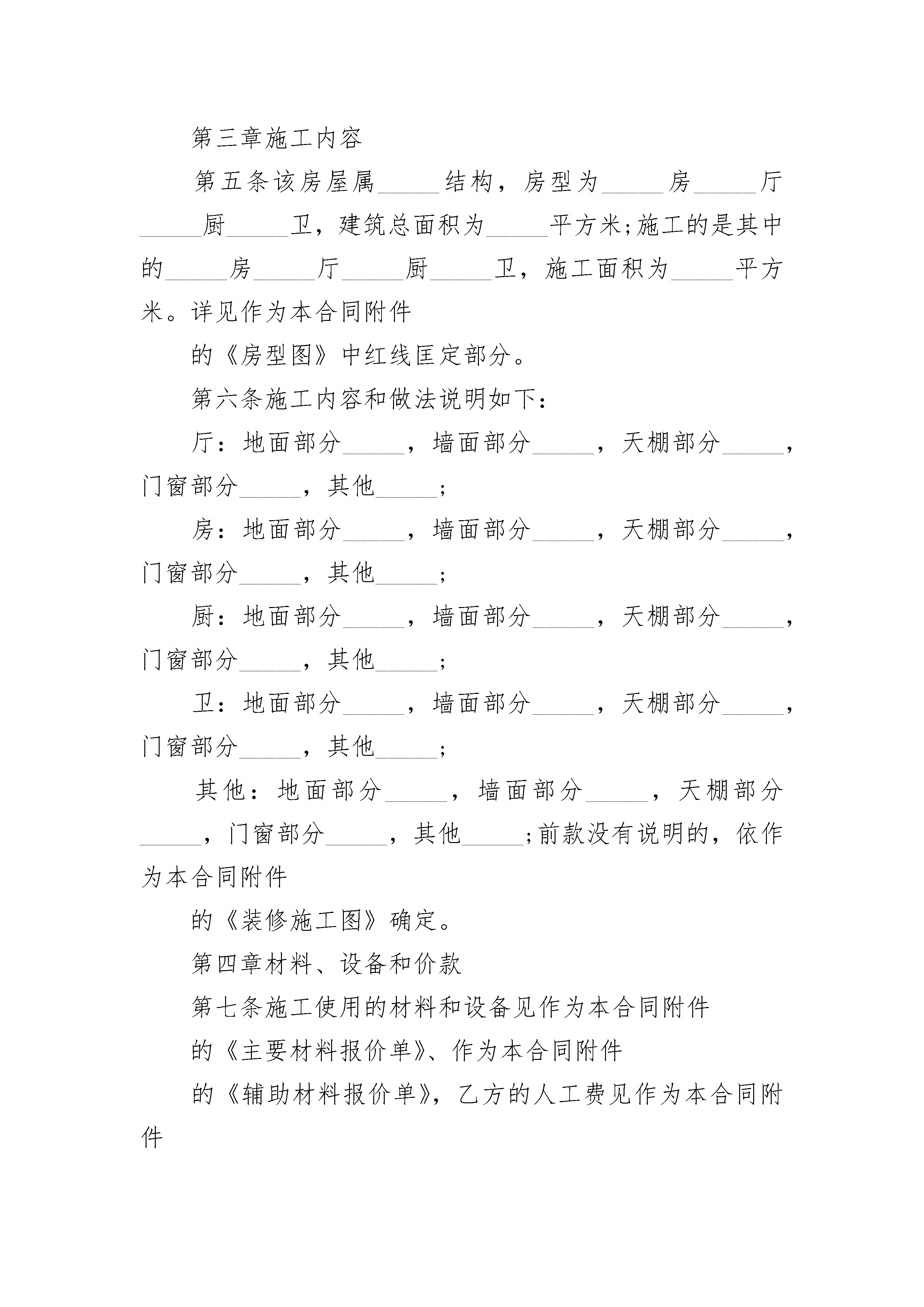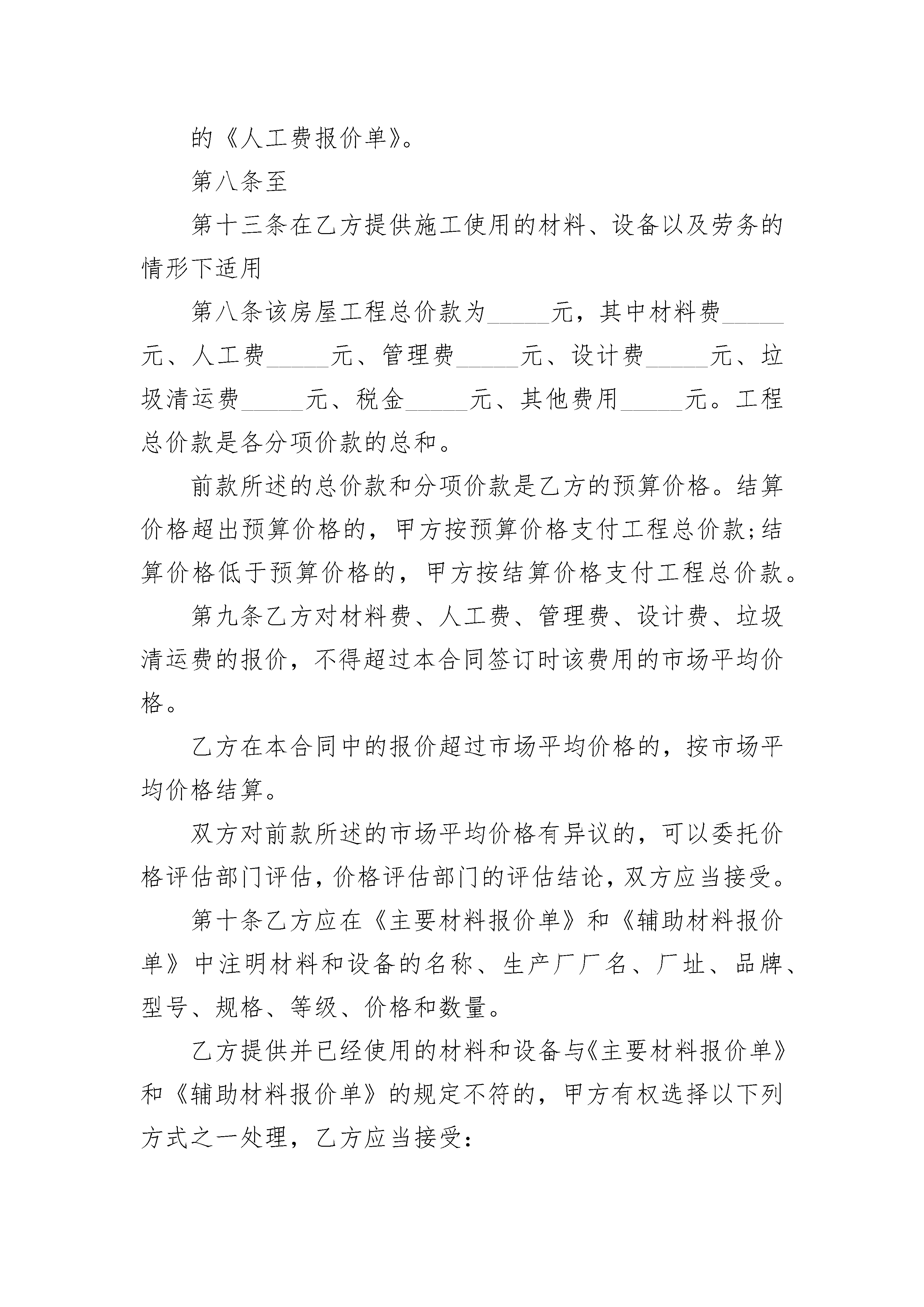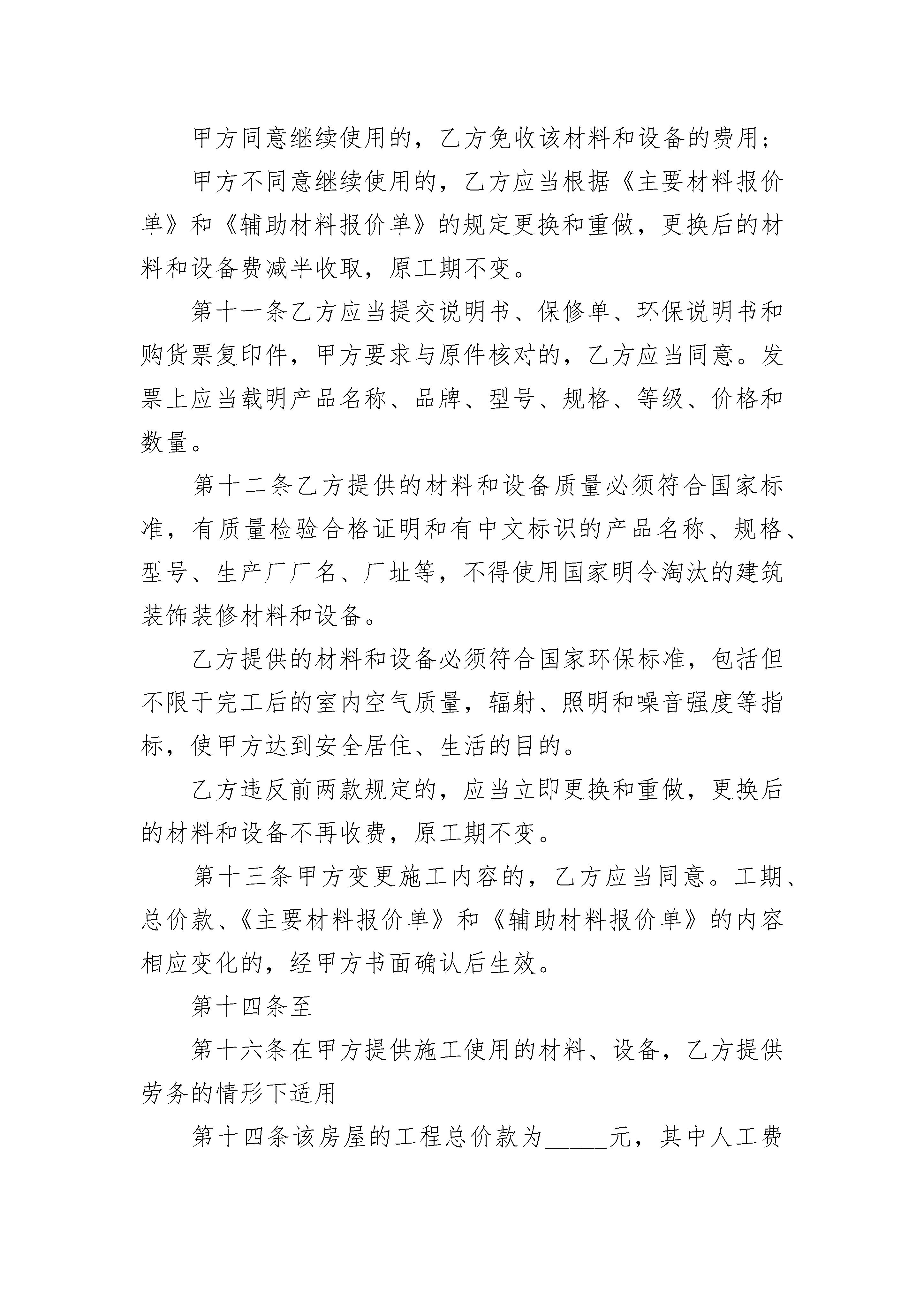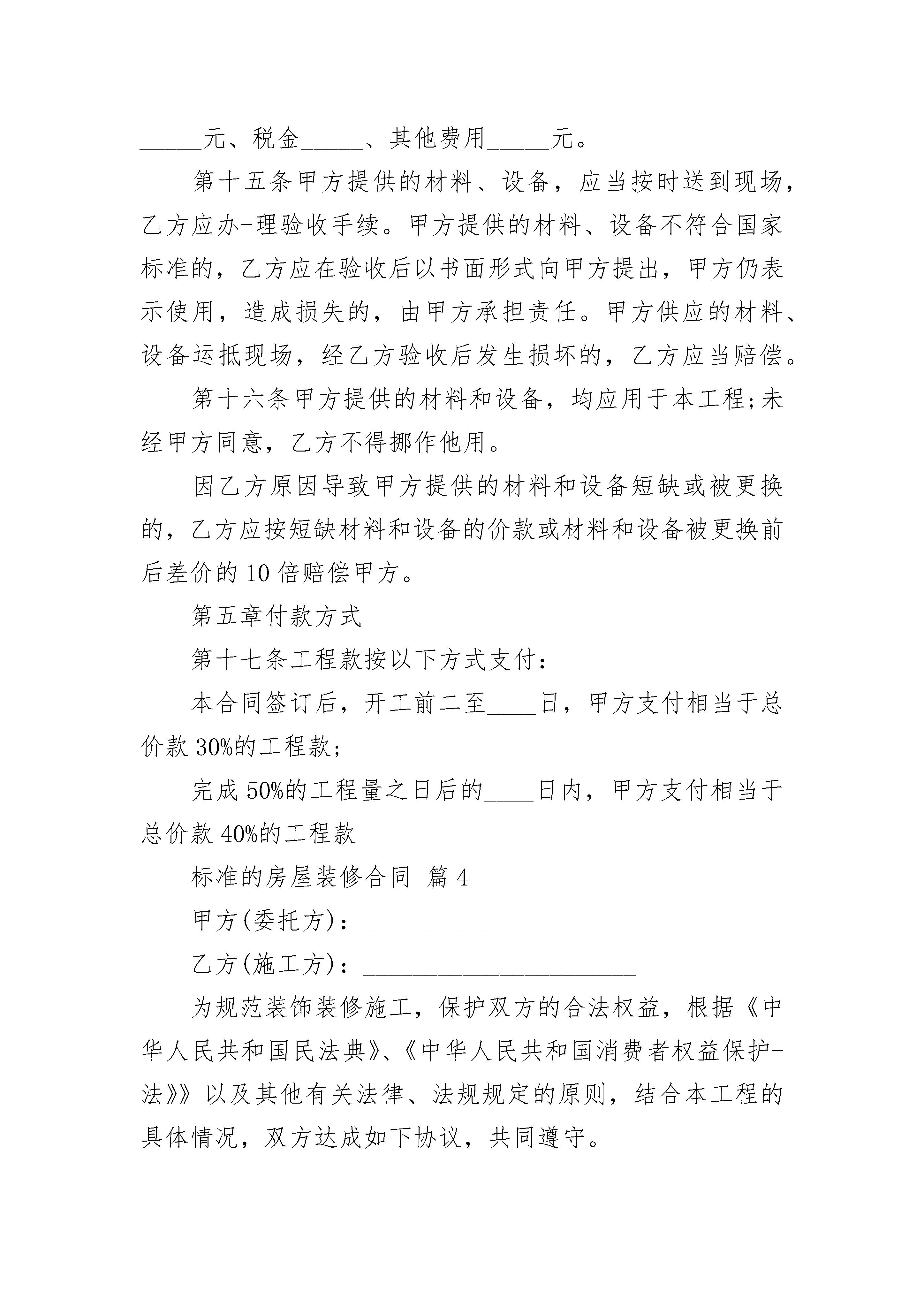房屋装修合同标准房屋装修合同标准(精选17篇)房屋装修合同标准篇1甲方:乙方:本着诚实守信、互惠互利的原则,经现场勘测根据施工惯例的要求和双方领导坦白洽商达成以下协议:1、甲方应提供乙方符合装修条件的毛胚房。2、甲方应保证乙方在施工时的水、电的正常供应。3、甲方应为乙方在施工时所使用的原材料贮藏,运输提供方便。4、此次合同为工料包干制,乙方应提供给甲方的原料应符合产品质量要求并提供产品生产出厂合格证和环保证明书,妥善保管发票和其相关资料。5、乙方施工总价每户为XX元,包括地面的瓷砖铺设,厨房和卫生间做防水