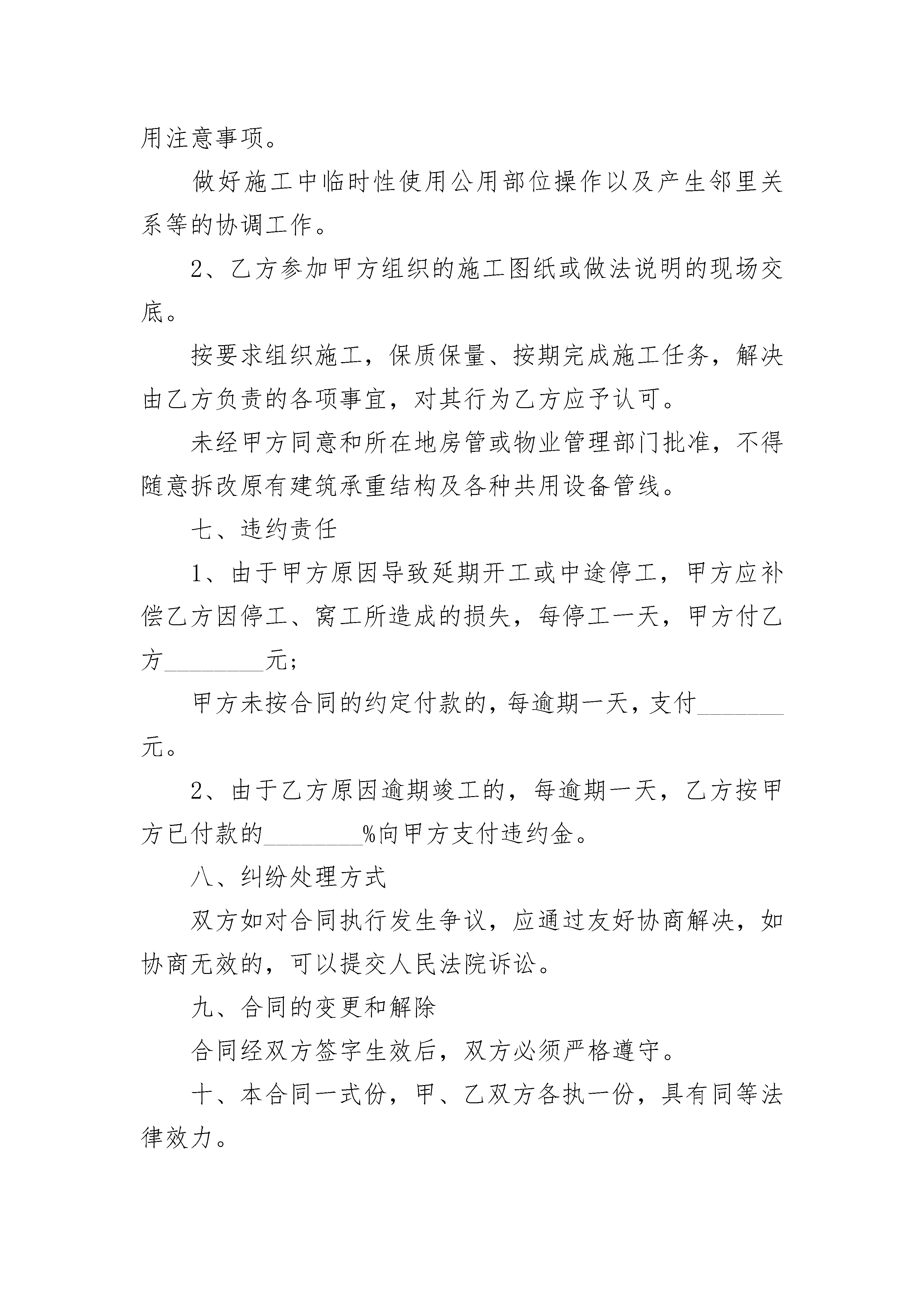包工包料装修协议书包工包料装修协议书随着社会不断地进步,协议的使用频率呈上升趋势,签订了协议就有了法律依靠。协议的注意事项有许多,你确定会写吗?以下是小编收集整理的包工包料装修协议书,希望能够帮助到大家。包工包料装修协议书1发包方(甲方):______________承包方(乙方):______________依照《中华人民共和国合同法》及有关法律、法规的规定,甲乙双方在平等、自愿、协商一致的基础上,就发包人的家庭居室内装饰装修有关事宜(以下称工程),签定本合同。第一条工程概况1.1工程名称:1.2工程地