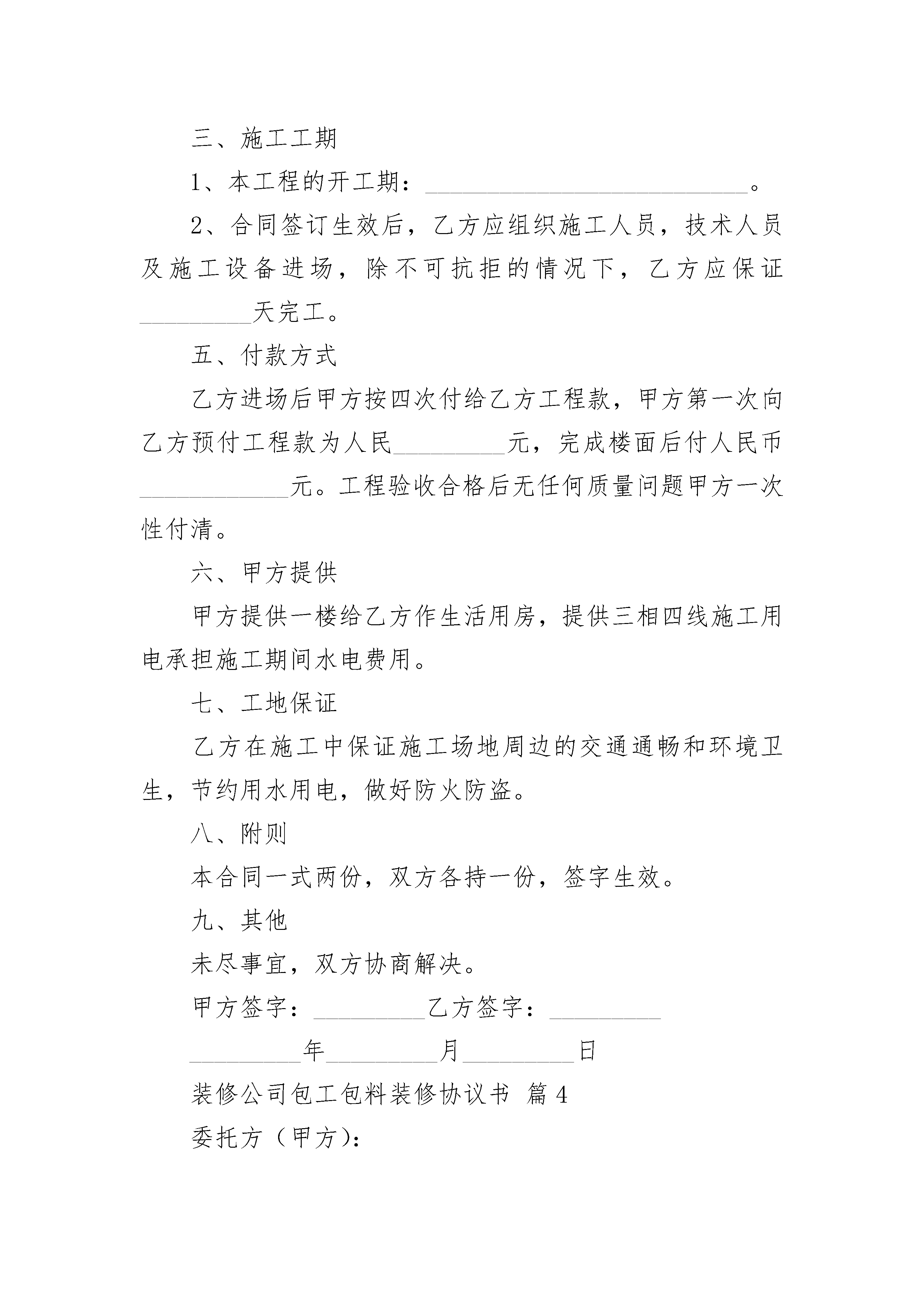 包工包料装修协议书包工包料装修协议书3篇在当今社会生活中,我们都跟协议有着直接或间接的联系,签订协议可以解决现实生活中的纠纷。那么相关的协议到底怎么写呢?下面是小编帮大家整理的包工包料装修协议书,欢迎大家分享。包工包料装修协议书1委托方(甲方):______________承接方(乙方):______________依照《中华人民共和国合同法》及其它有关法律、法规,遵循平等自愿、公平和诚实信用的原则,双方就本工程承包事项协商一致,签订本合同。第一条:工程概况1、工程地址:______________2、工