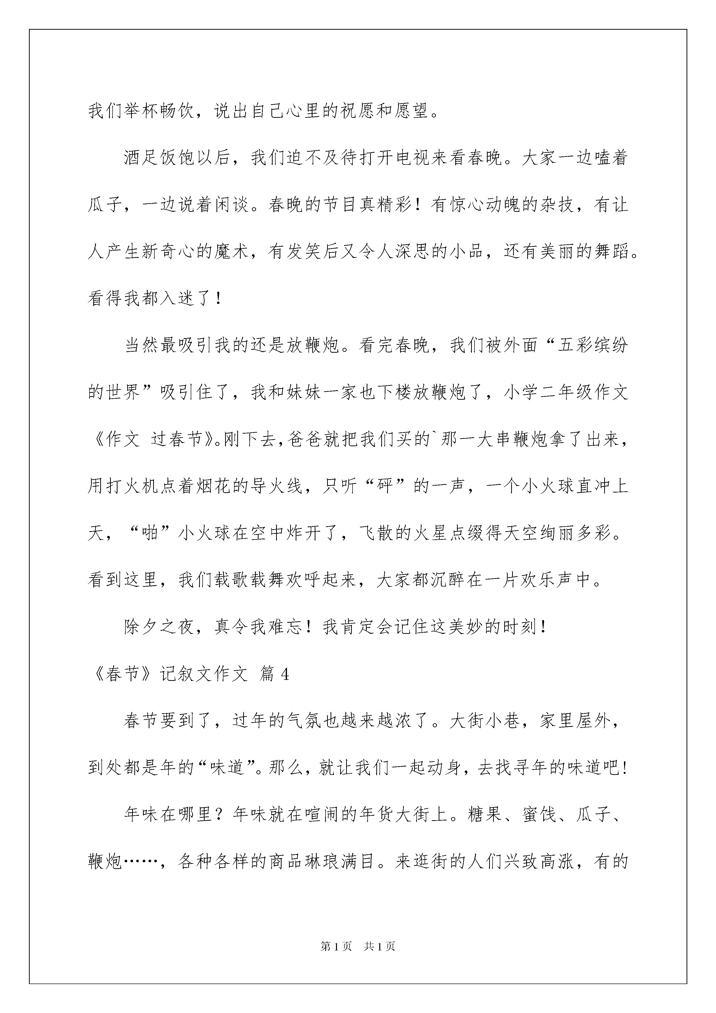 2022《春节》记叙文作文《春节》记叙文作文4篇无论在学习、工作或是生活中大家总少不了接触作文吧作文是一种言语活动具有高度的综合性和创建性。如何写一篇有思想、有文采的作文呢?下面是我为大家整理的《春节》记叙文作文4篇欢迎阅读希望大家能够喜爱。《春节》记叙文作文