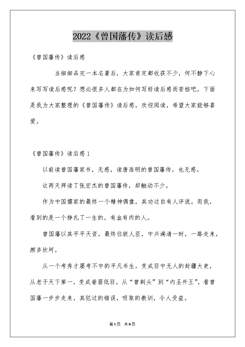 2022《曾国藩传》读后感《曾国藩传》读后感当细细品完一本名著后大家肯定都收获不少何不静下心来写写读后感呢?想必很多人都在为如何写好读后感而苦恼吧下面是我为大家整理的《曾国藩传》读后感欢迎阅读希望大家能够喜爱。《曾国藩传》读后感1以前读曾国藩家书无感读唐浩