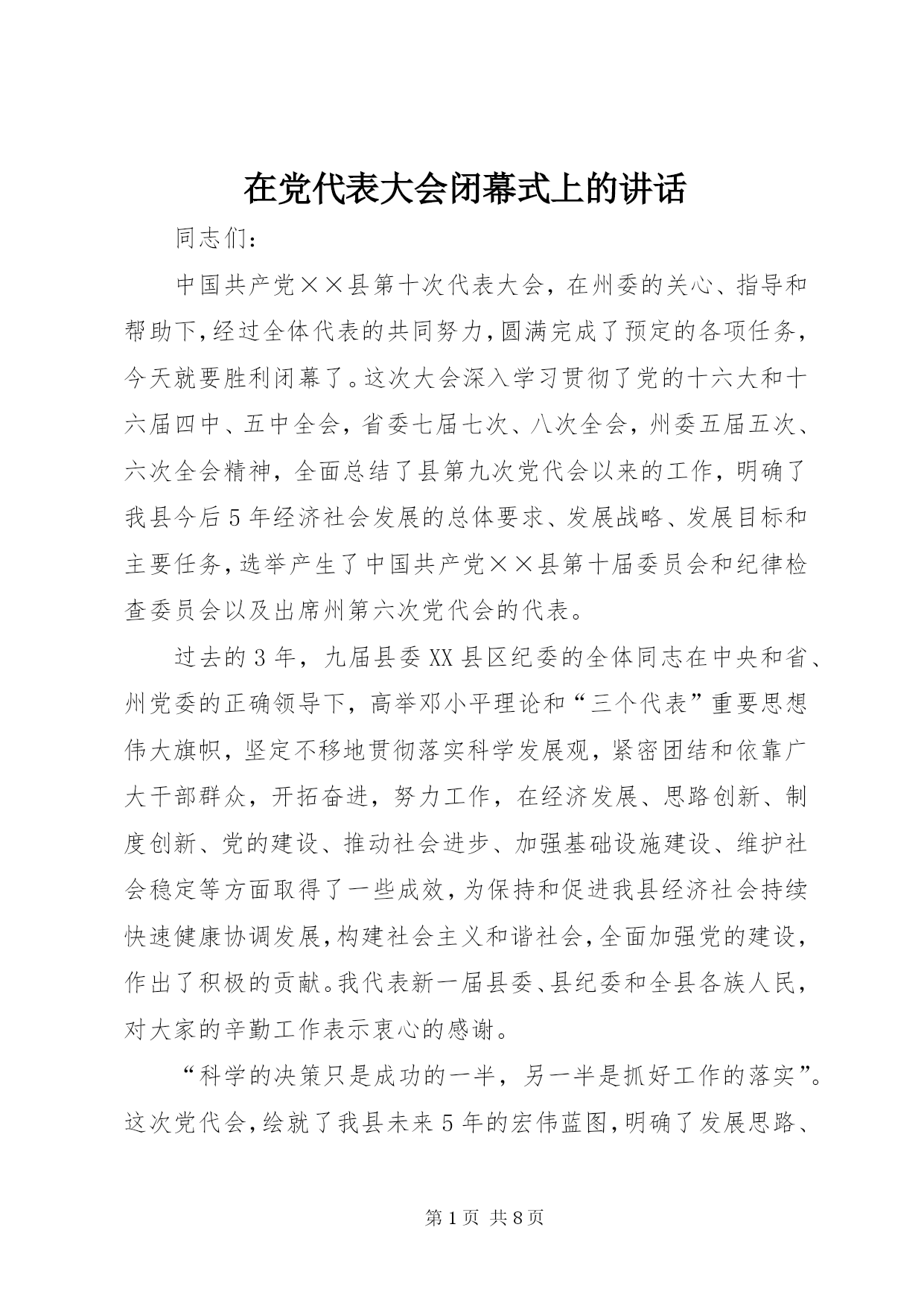 在党代表大会闭幕式上的讲话同志们:中国共产党**县第十次代表大会,在州委的关心、指导和帮助下,经过全体代表的共同努力,圆满完成了预定的各项任务,今天就要胜利闭幕了。这次大会深入学习贯彻了党的十六大和十六届四中、五中全会,省委七届七次、八次全会,州委五届五次、六次全会精神,全面总结了县第九次党代会以来的工作,明确了我县今后5年经济社会发展的总体要求、发展战略、发展目标和主要任务,选举产生了中国共产党**县第十届委员会和纪律检查委员会以及出席州第六次党代会的代表。过去的3年,九届县委
