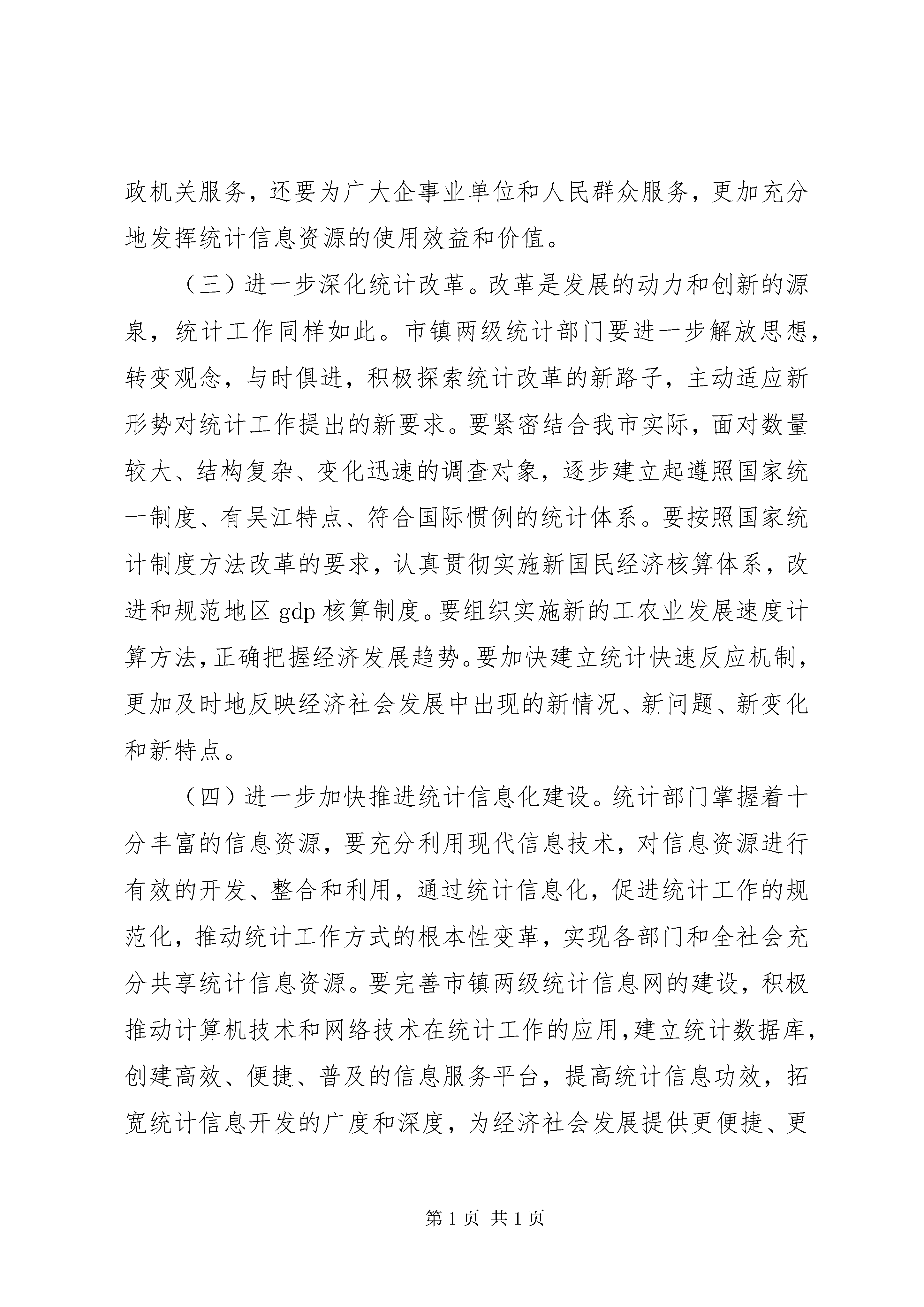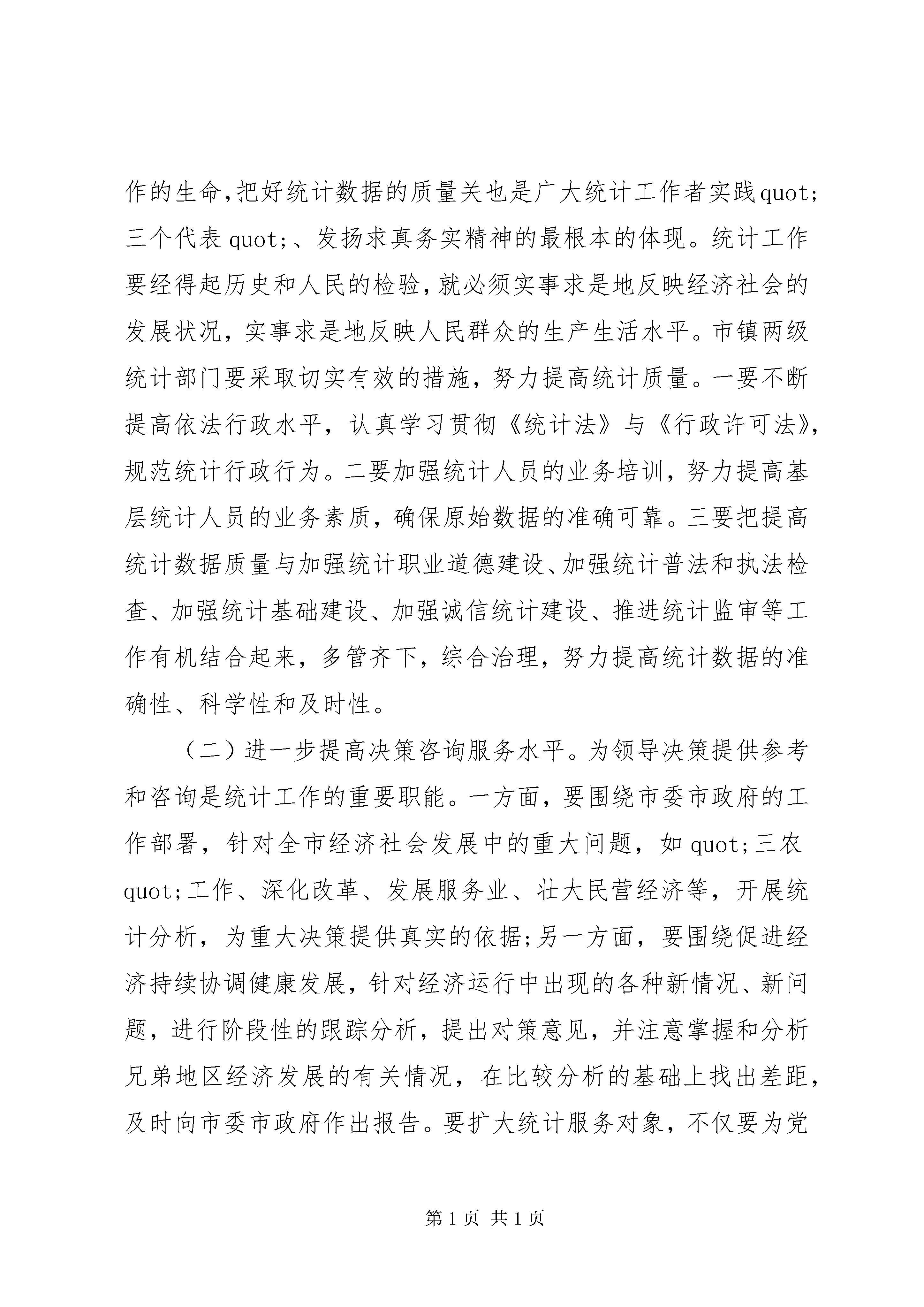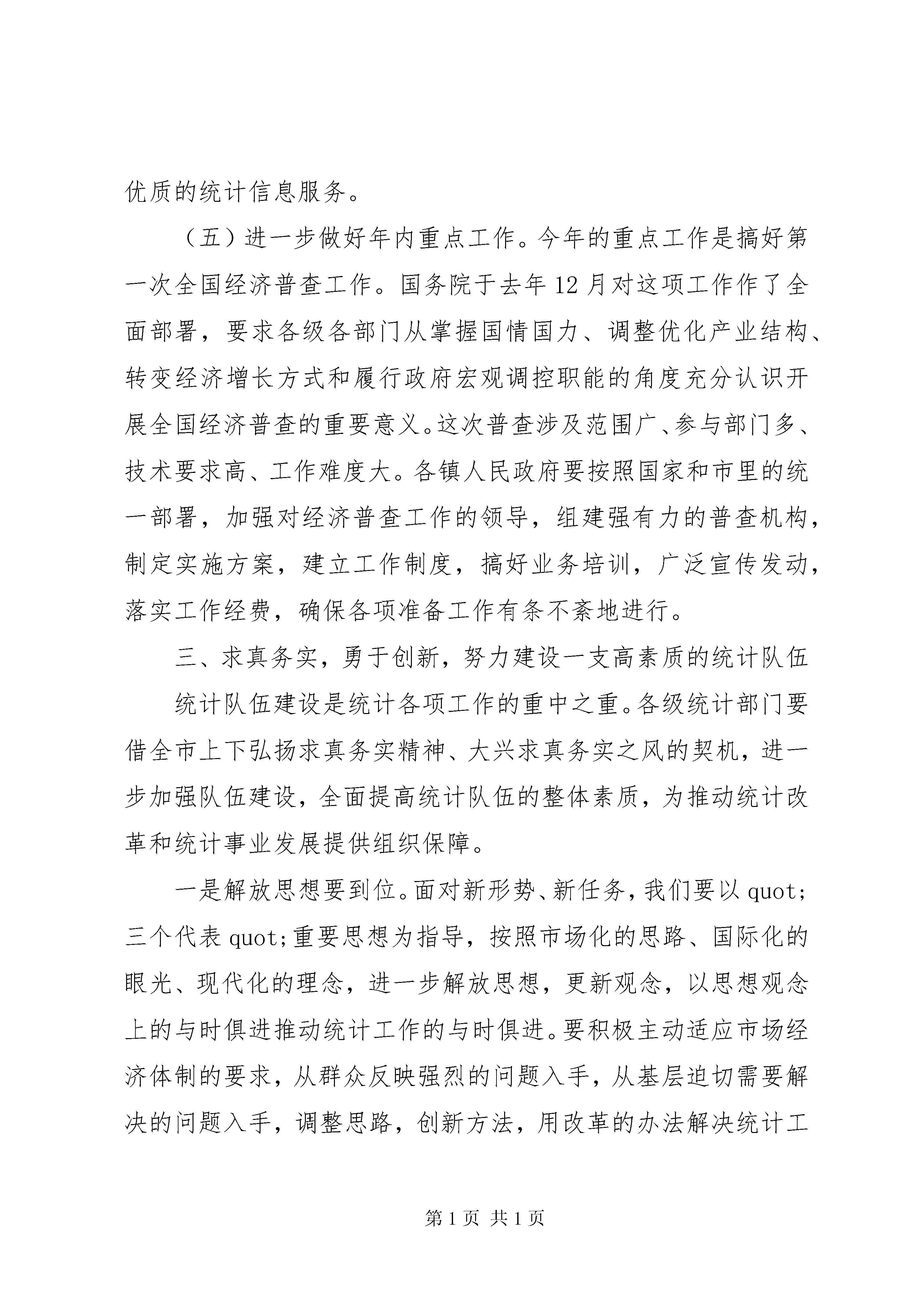 第PAGE\*Arabic\*MERGEFORMAT13页共NUMPAGES\*MERGEFORMAT13页全市统计工作会议上的领导讲话全市统计工作会议上的领导讲话【篇一】同志们:今天,我们在这里召开全市统计工作会议。会议时间虽短,但内容比较全面。刚才,陆鹤鸣局长对去年工作作了系统的回顾总结,对今年工作作了具体的布置安排,我表示完全同意。下面,我就做好新形势下的统计工作再强调几点:一、肯定成绩,认清形势,进一步增强做好统计工作的责任感和使命感去年,全市统计条线的广大干部职工围绕全面打造quot