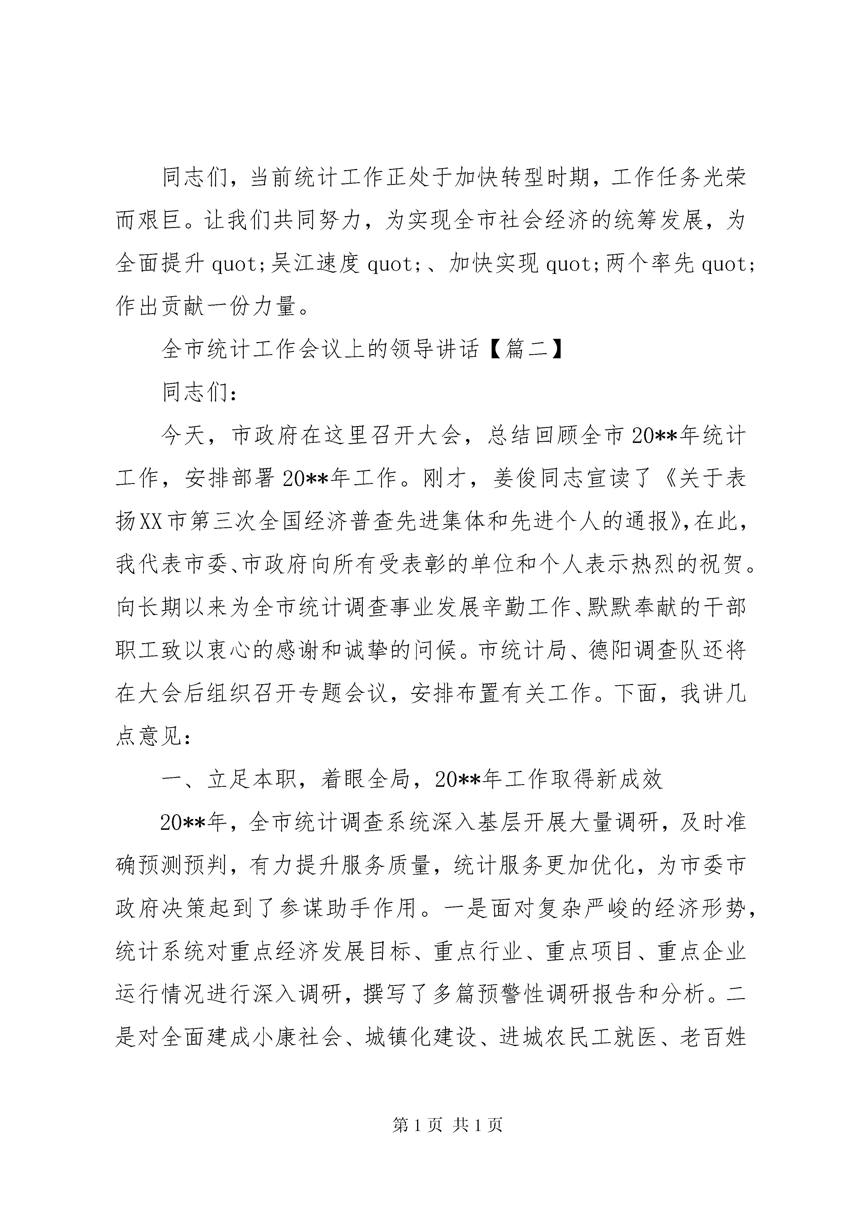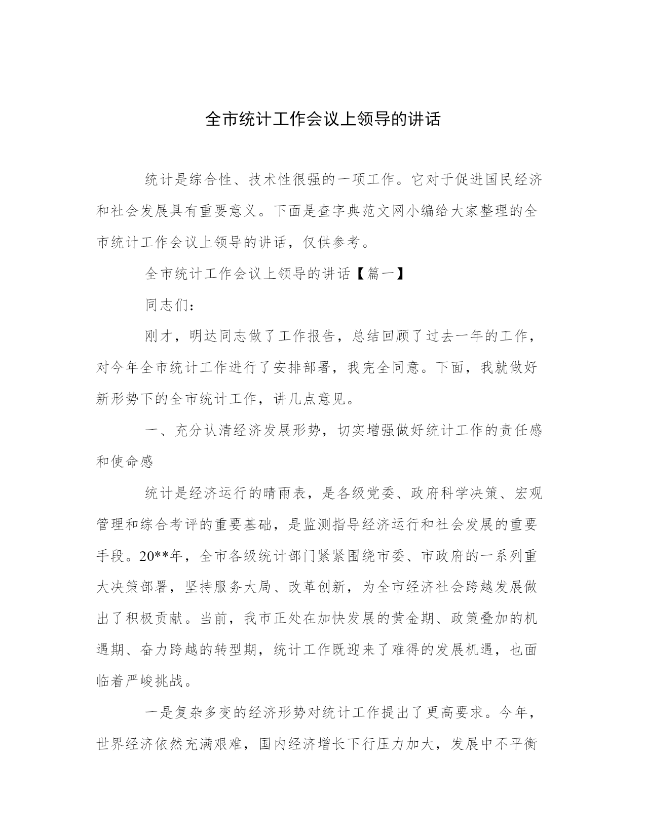 全市统计工作会议上领导的讲话全市统计工作会议上领导的讲话【篇一】同志们:刚才,明达同志做了工作报告,总结回顾了过去一年的工作,对今年全市统计工作进行了安排部署,我完全同意。下面,我就做好新形势下的全市统计工作,讲几点意见。一、充分认清经济发展形势,切实增强做好统计工作的责任感和使命感统计是经济运行的晴雨表,是各级党委、政府科学决策、宏观管理和综合考评的重要基础,是监测指导经济运行和社会发展的重要手段。20**年,全市各级统计部门紧紧围绕市委、市政府的一系列重大决策部署,坚持服务大局、改革创新,为全市经济社