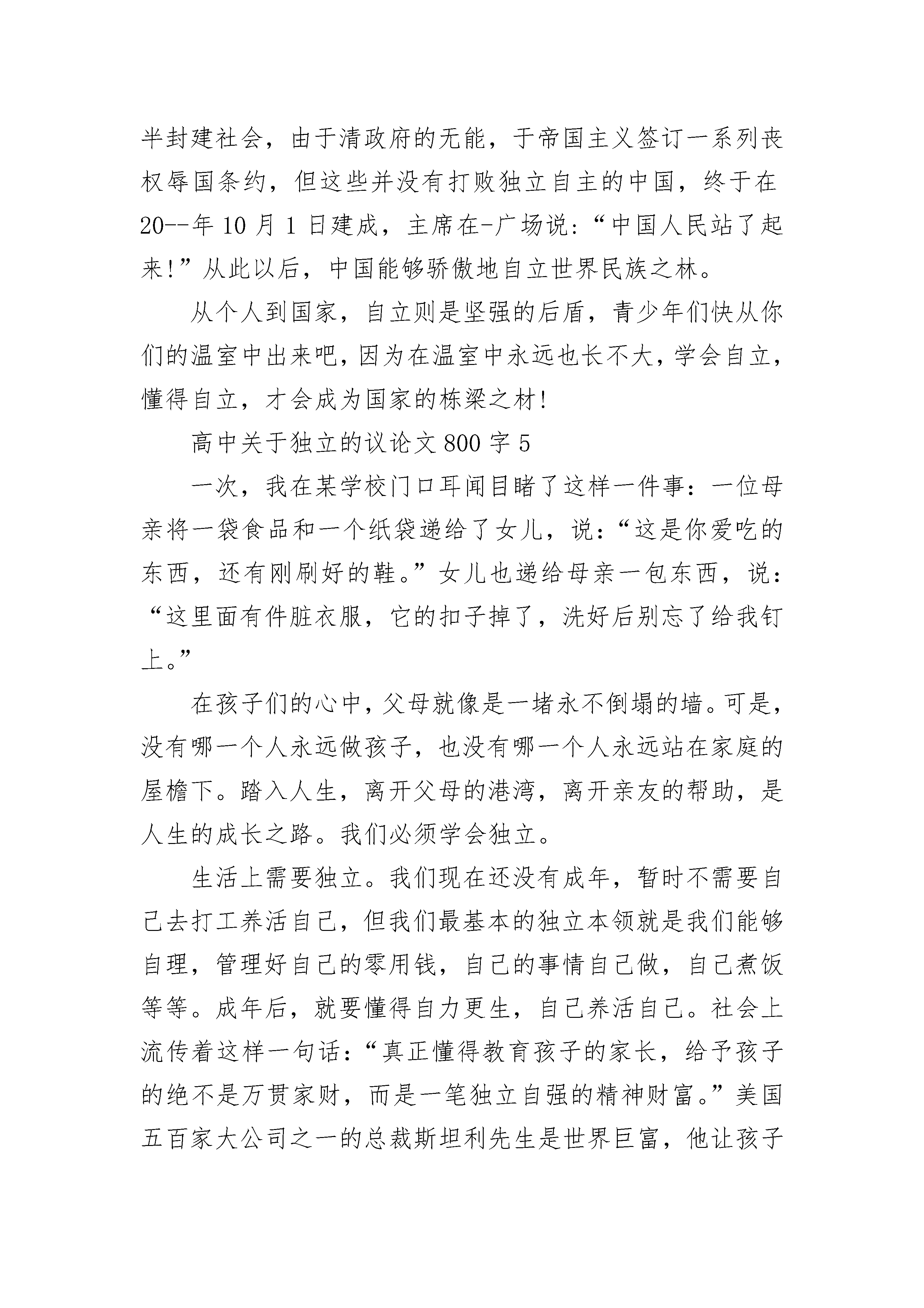 高中关于独立的议论文800字高中关于独立的议论文800字篇一一次,我在某学校门口耳闻目睹了这样一件事:一位母亲将一袋食品和一个纸袋递给了女儿,说:“这是你爱吃的东西,还有刚刷好的鞋。”女儿也递给母亲一包东西,说:“这里面有件脏衣服,它的扣子掉了,洗好后别忘了给我钉上。”在孩子们的心中,父母就像是一堵永不倒塌的墙。可是,没有哪一个人永远做孩子,也没有哪一个人永远站在家庭的屋檐下。踏入人生,离开父母的港湾,离开亲友的帮助,是人生的成长之路。我们必须学会独立。生活上需要独立。我们现在还没有成年,暂时不需要自己去