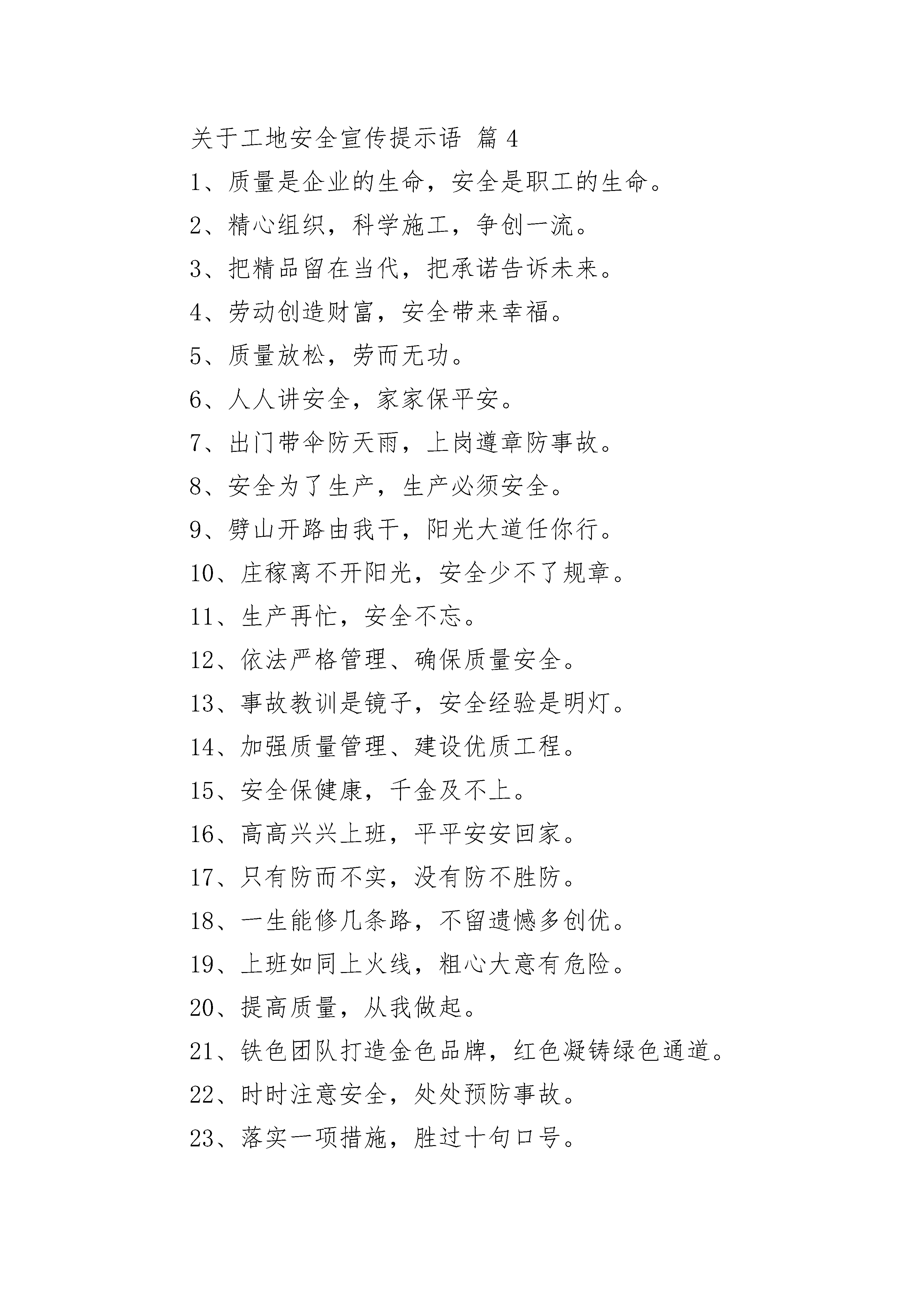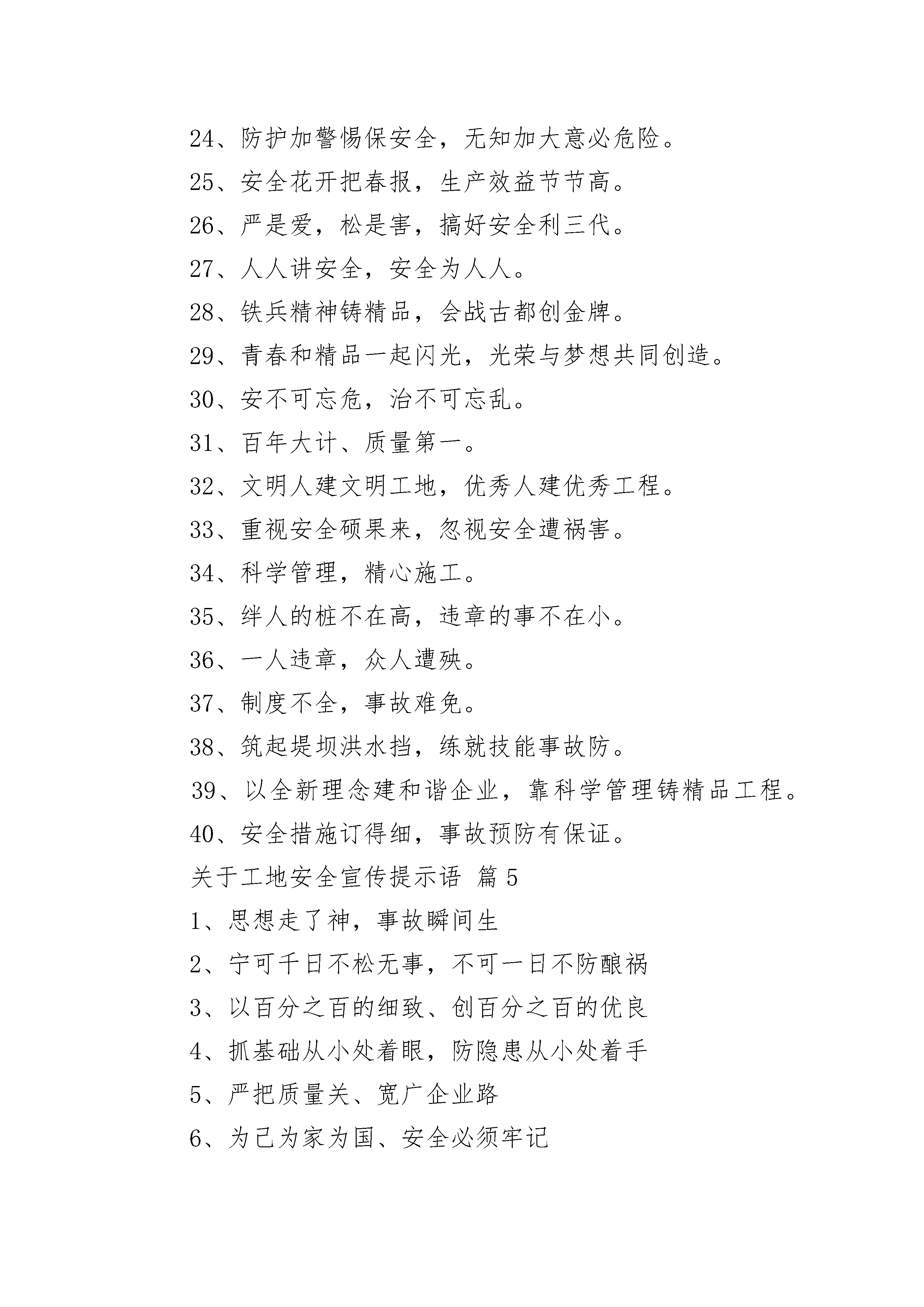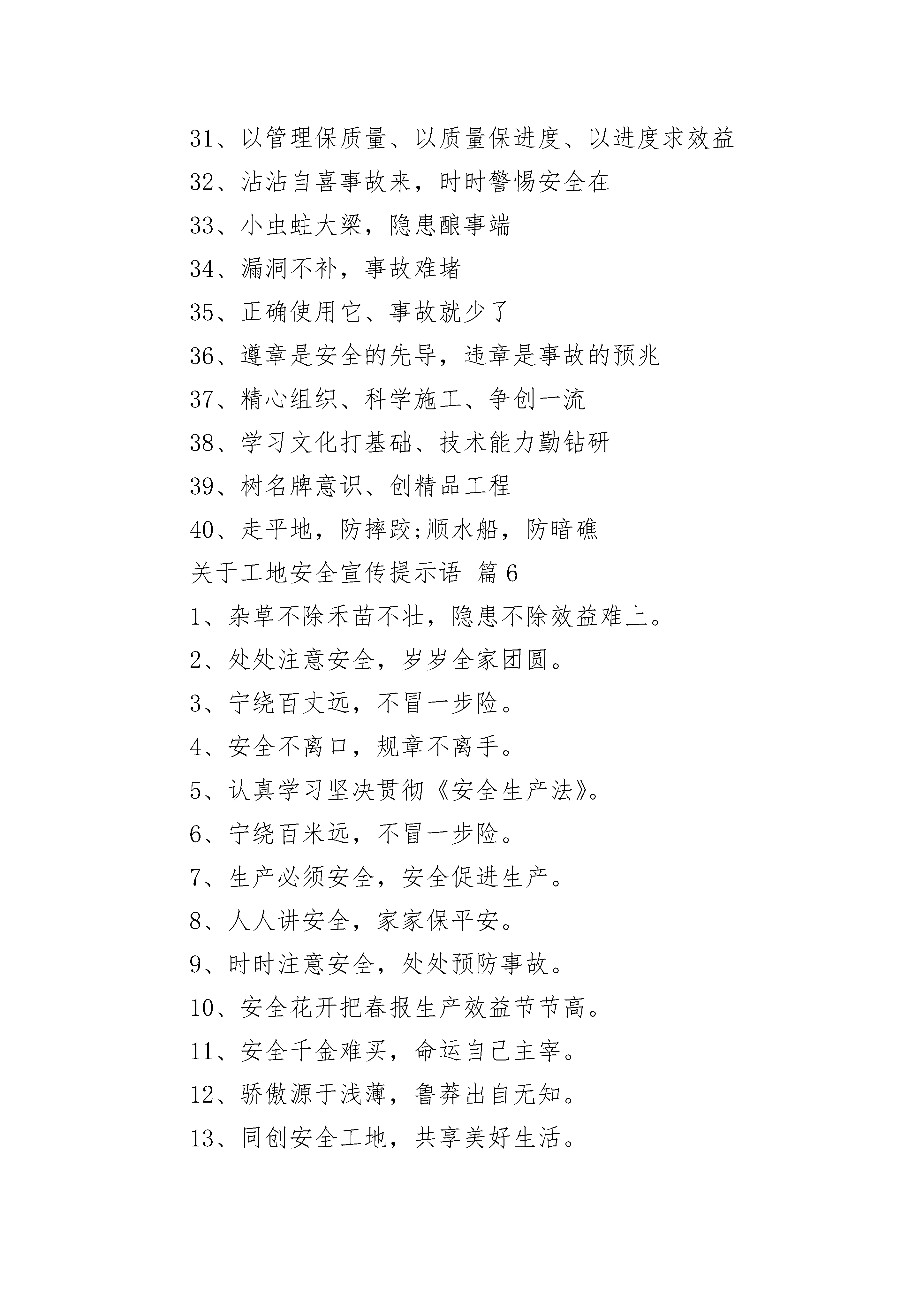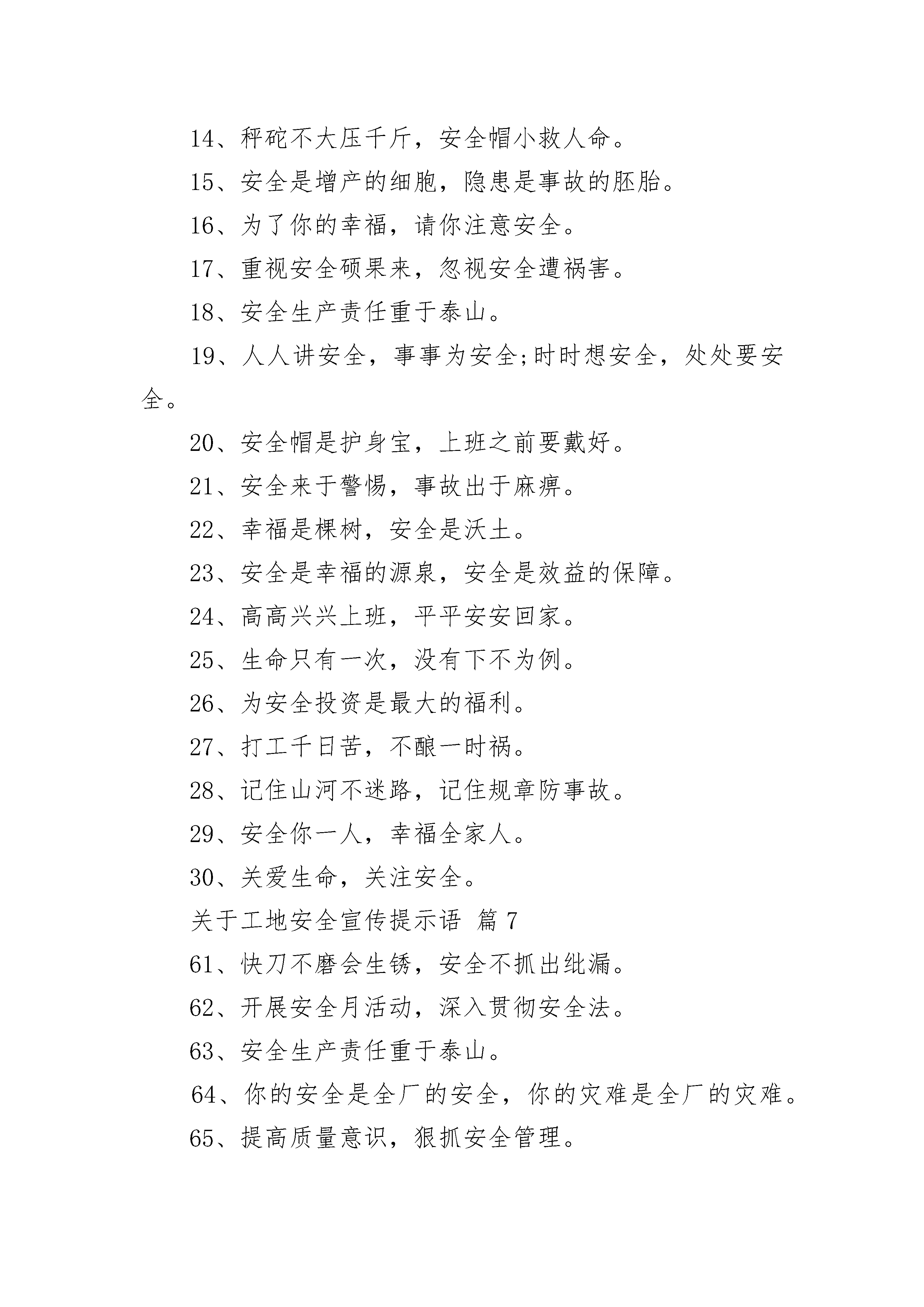 关于工地安全宣传提示语关于工地安全宣传提示语(精选20篇)关于工地安全宣传提示语篇11、安全为了生产,生产必须安全。2、安全帽是护身宝,上班之前要戴好。3、今日注意安全,节日合家团圆。4、杂草不除禾苗不壮,隐患不除效益难上。5、广泛动员,狠抓落实,群防群控。6、为了你的幸福,请你注意安全。7、科学管理,精心施工。8、疏忽一时,痛苦一世。9、生命可贵当珍爱,丝毫麻痹都是害。10、安全是家庭幸福的保证,事故是人生悲剧的祸根。11、提高安全意识,建设文明工地。12、严是爱松是害,严中自有真情在。13、骄傲自