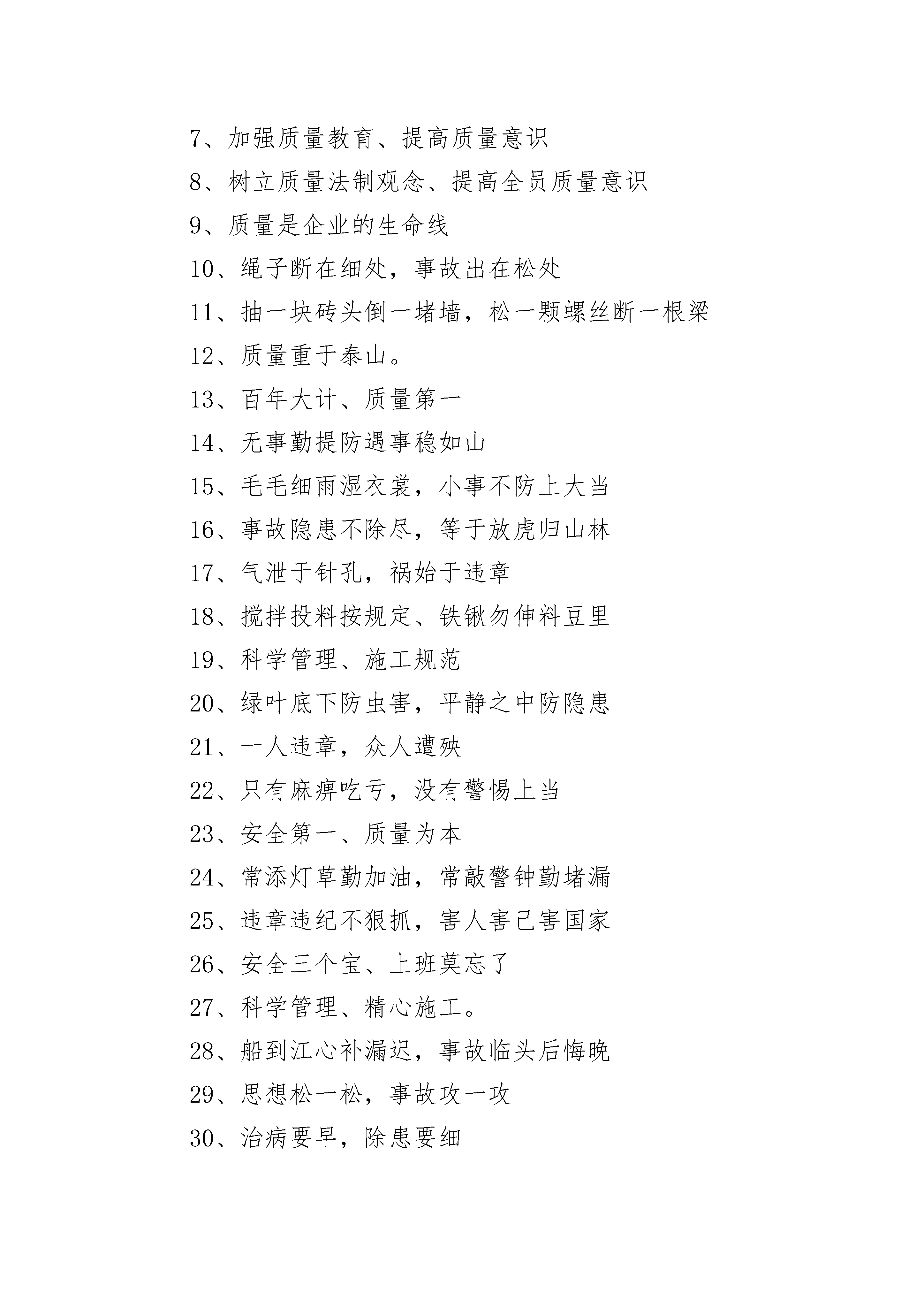 工地安全宣传的提示语关于工地安全宣传的提示语关于工地安全宣传的提示语11、科学管理、精心施工2、严格质量、优良出品3、科学管理、施工规范4、百年大计质量先、安全生产记心间5、以百分之百的细致、创百分之百的优良6、学习文化打基础、技术能力勤钻研7、树立质量法制观念、提高全员质量意识8、以管理保质量、以质量保进度、以进度求效益9、百年大计、质量第一10、加强质量教育、提高质量意识11、遵守规程不违章、由上而下有顺序12、接地接零装置好、搬运断电带手套13、生命是个宝、健康最重要14、质量是企业的生命线15、为