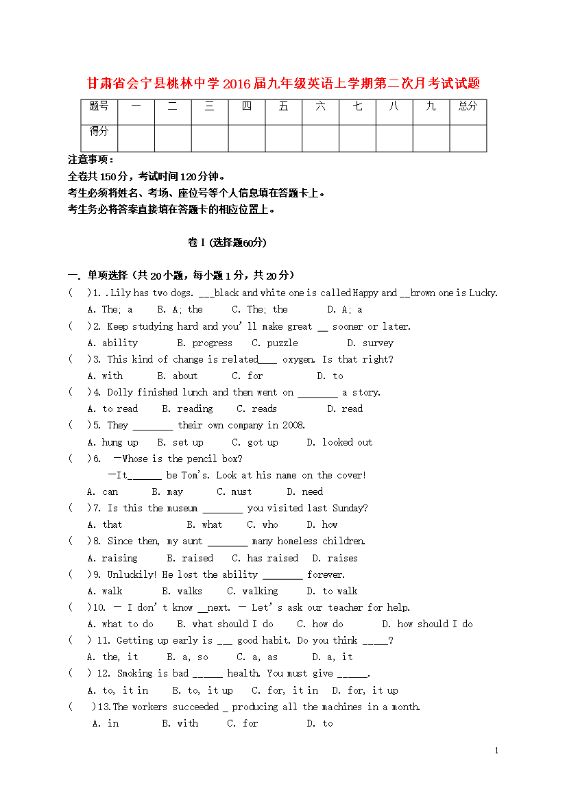 87甘肃省会宁县桃林中学2016届九年级英语上学期第二次月考试试题题号一二三四五六七八九总分得分注意事项:全卷共150分,考试时间120分钟。考生必须将姓名、考场、座位号等个人信息填在答题卡上。考生务必将答案直接填在答题卡的相应位置上。卷Ⅰ(选择题60分)一.单项选择(共20小题,每小题1分,共20分)()1..Lilyhastwodogs.___blackandwhiteoneiscalledHappyand__brownoneisLucky.A.The;aB.A;theC.The;theD.A;a()