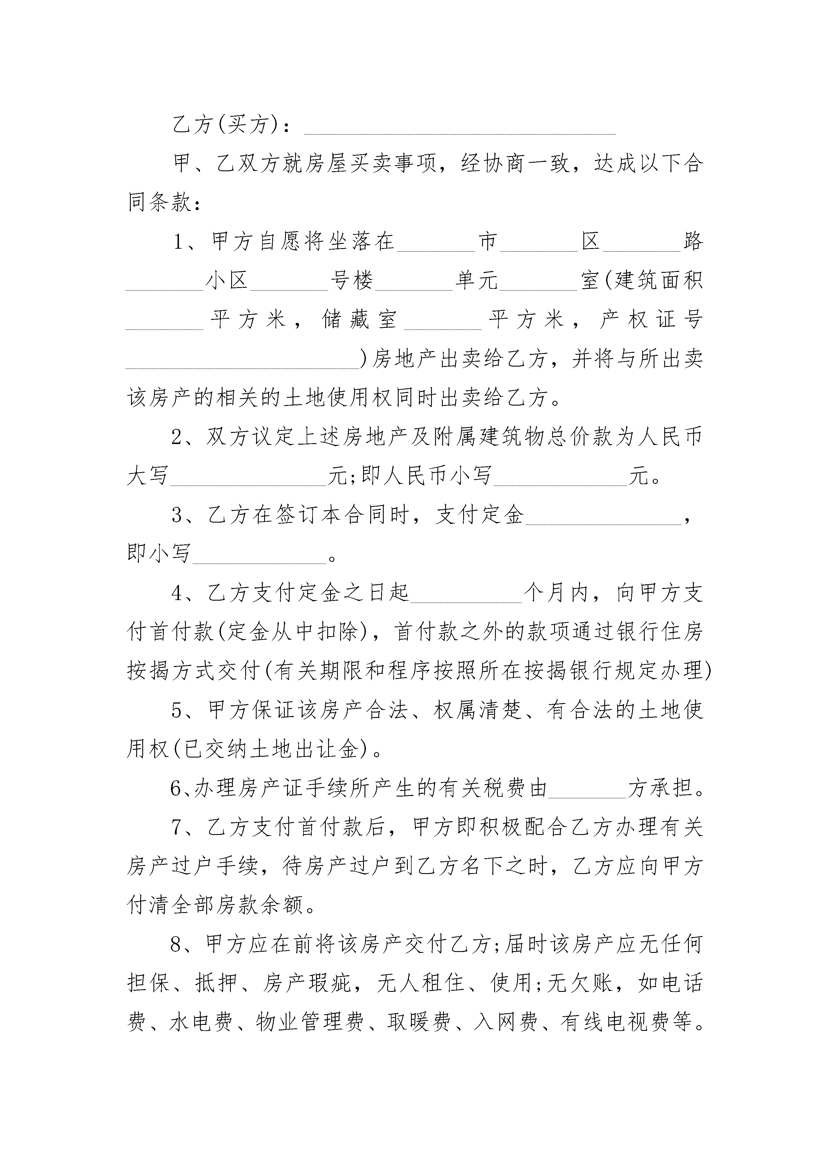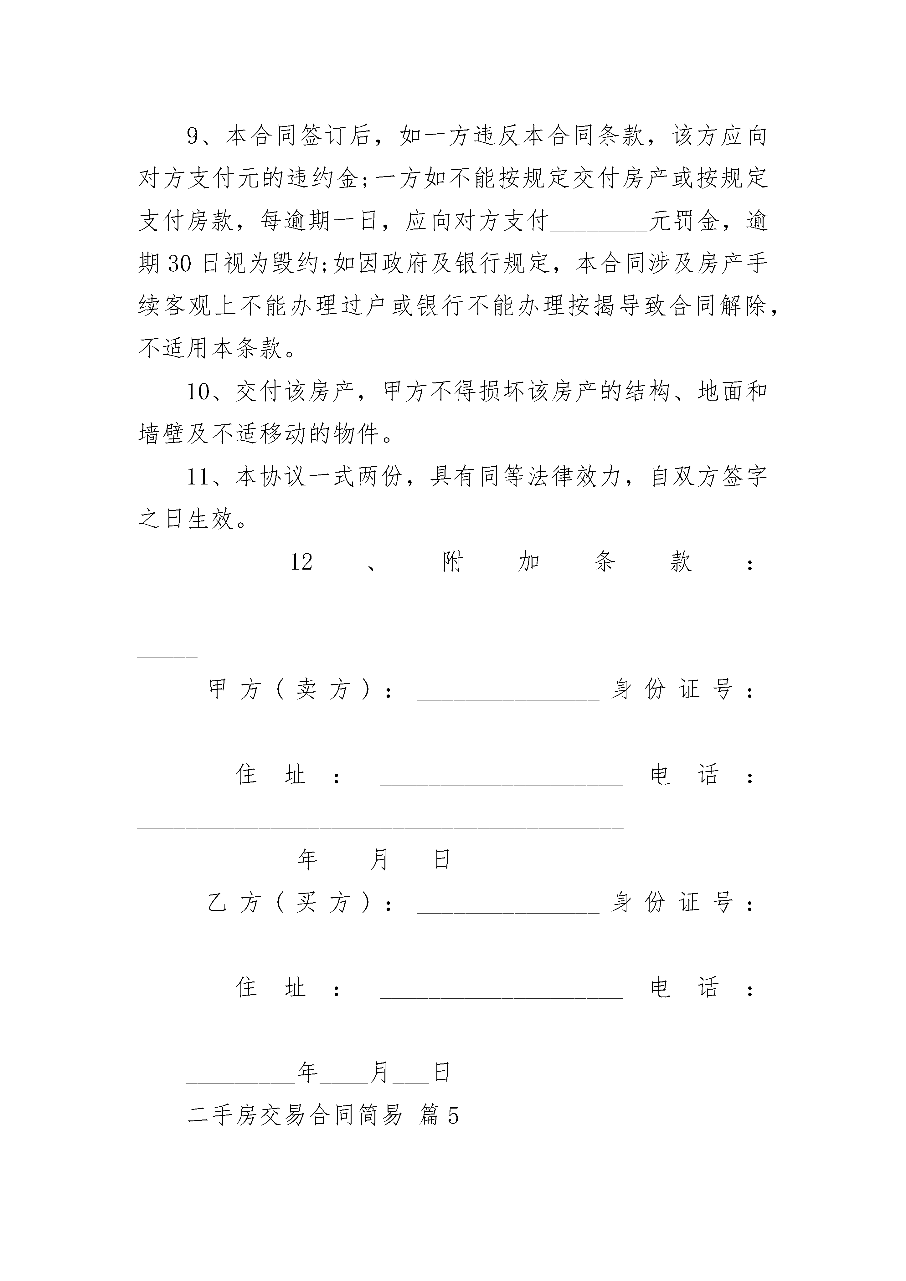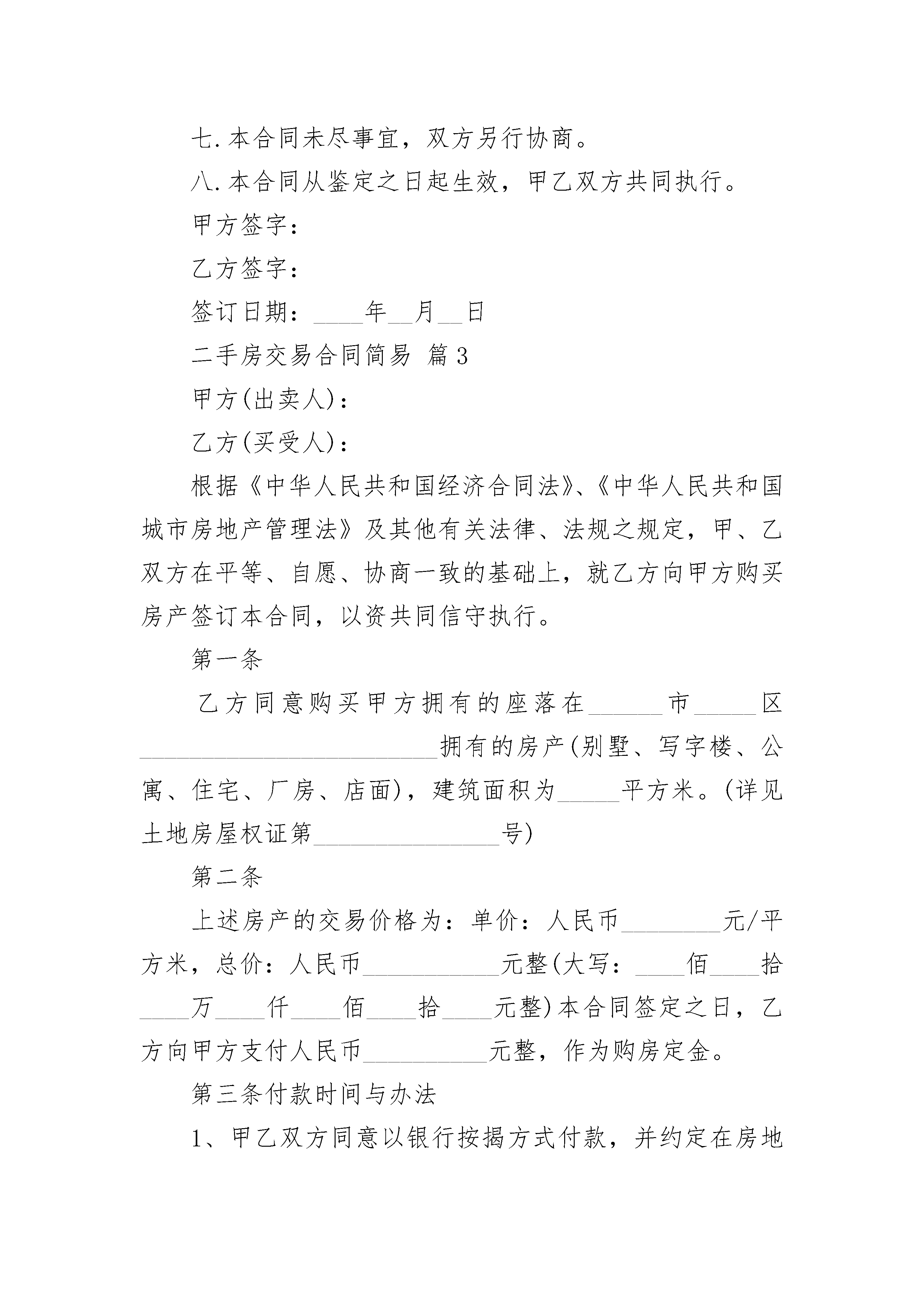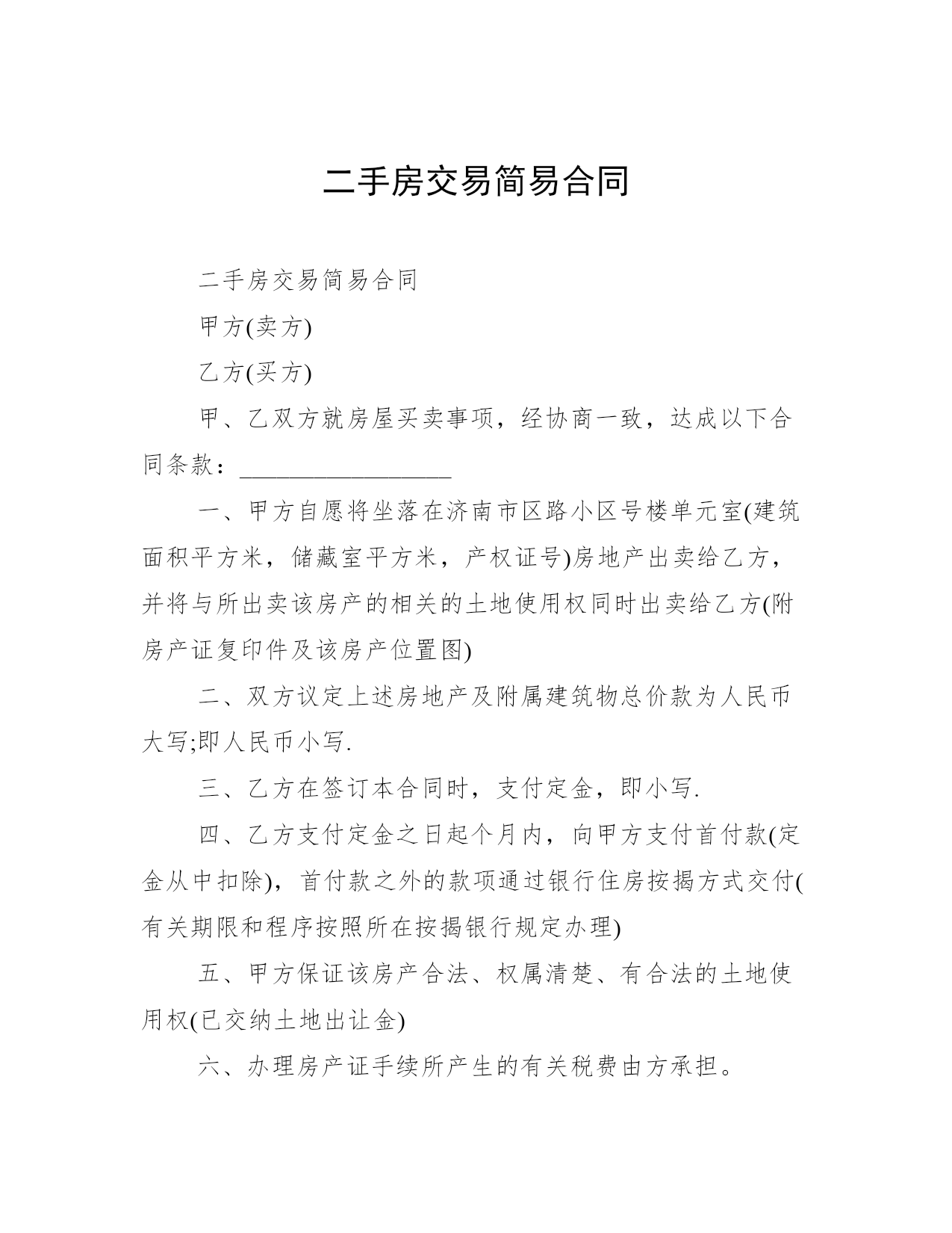 二手房交易简易合同二手房交易简易合同房屋买卖合同书(简易范本)甲方(卖方)乙方(买方)甲、乙双方就房屋买卖事项经协商一致达成以下合同条款:_________________一、甲方自愿将坐落在济南市区路小区号楼单元室(建筑面积平方米储藏室平方米产权证号)房地产出卖给乙方并将与所出卖该房产的相关的土地使用权同时出卖给乙方(附房产证复印件及该房产位置图)二、双方议定上述房地产及附属建筑物总价款为人民币大写;即人民币小写.三、乙方在签订本合同时支付定金即小写.四、乙方支付定金之日起个月