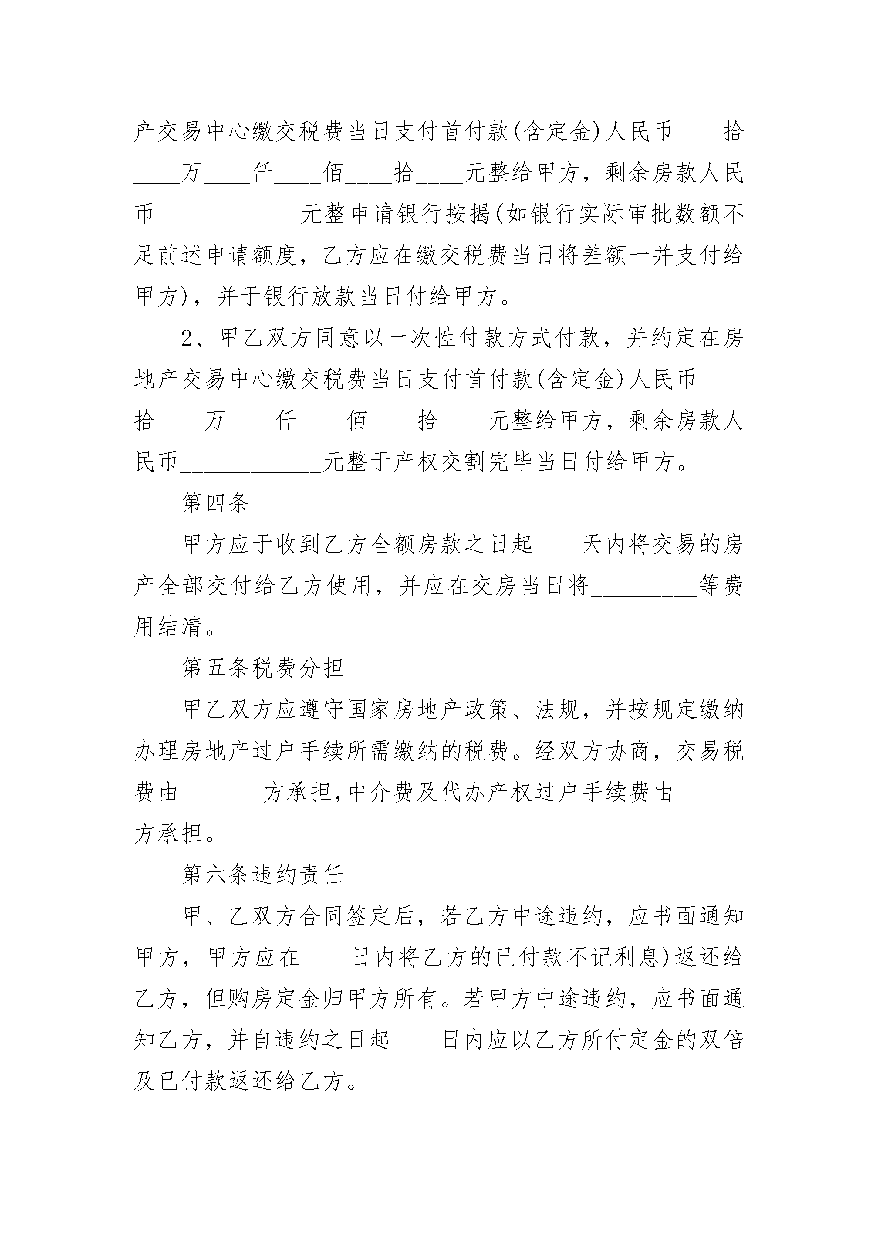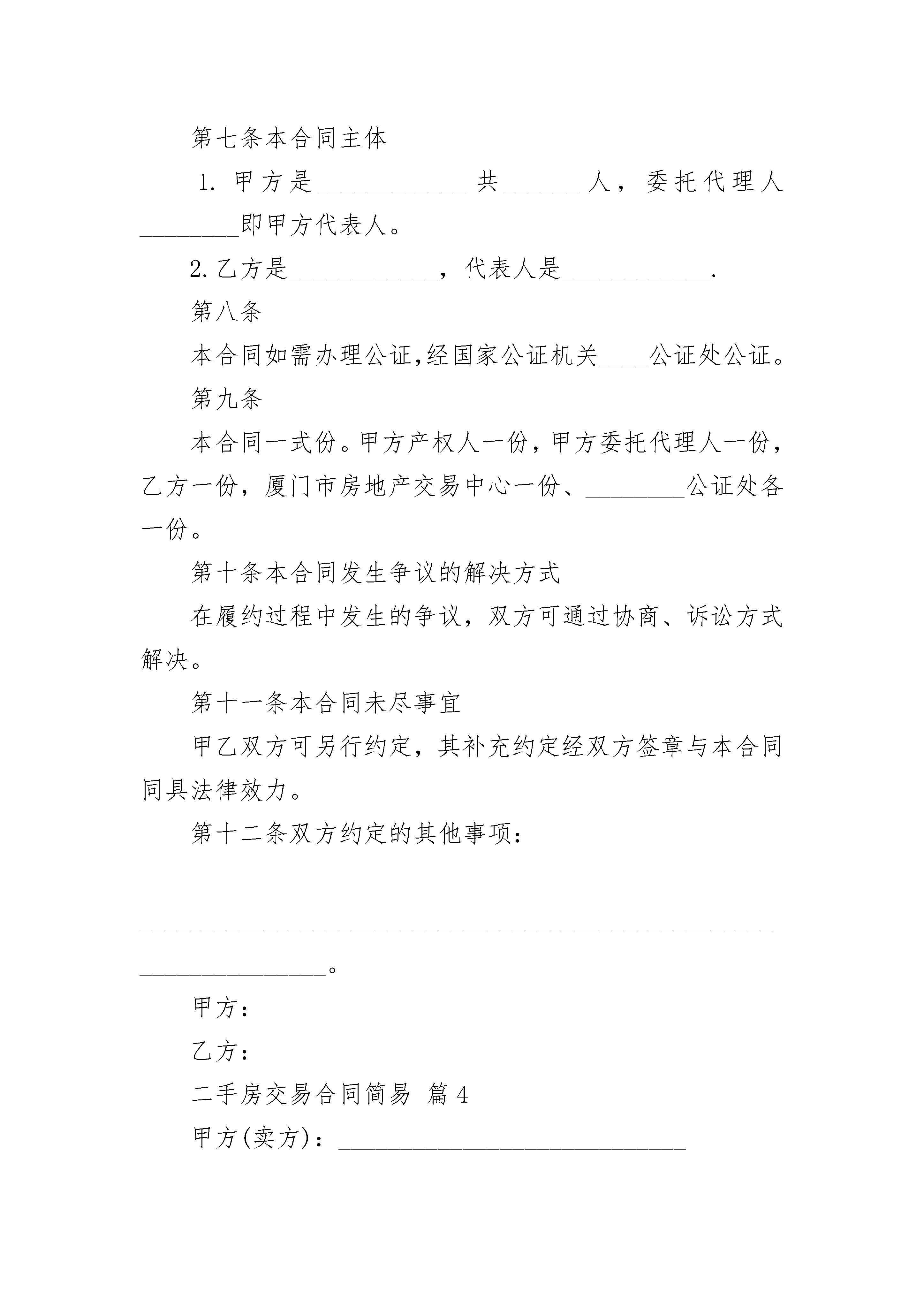 二手房交易简易合同二手房交易简易合同甲方(卖方)乙方(买方)甲、乙双方就房屋买卖事项,经协商一致,达成以下合同条款:_________________一、甲方自愿将坐落在济南市区路小区号楼单元室(建筑面积平方米,储藏室平方米,产权证号)房地产出卖给乙方,并将与所出卖该房产的相关的土地使用权同时出卖给乙方(附房产证复印件及该房产位置图)二、双方议定上述房地产及附属建筑物总价款为人民币大写;即人民币小写.三、乙方在签订本合同时,支付定金,即小写.四、乙方支付定金之日起个月内,向甲方支付首付款(定金从中扣除),